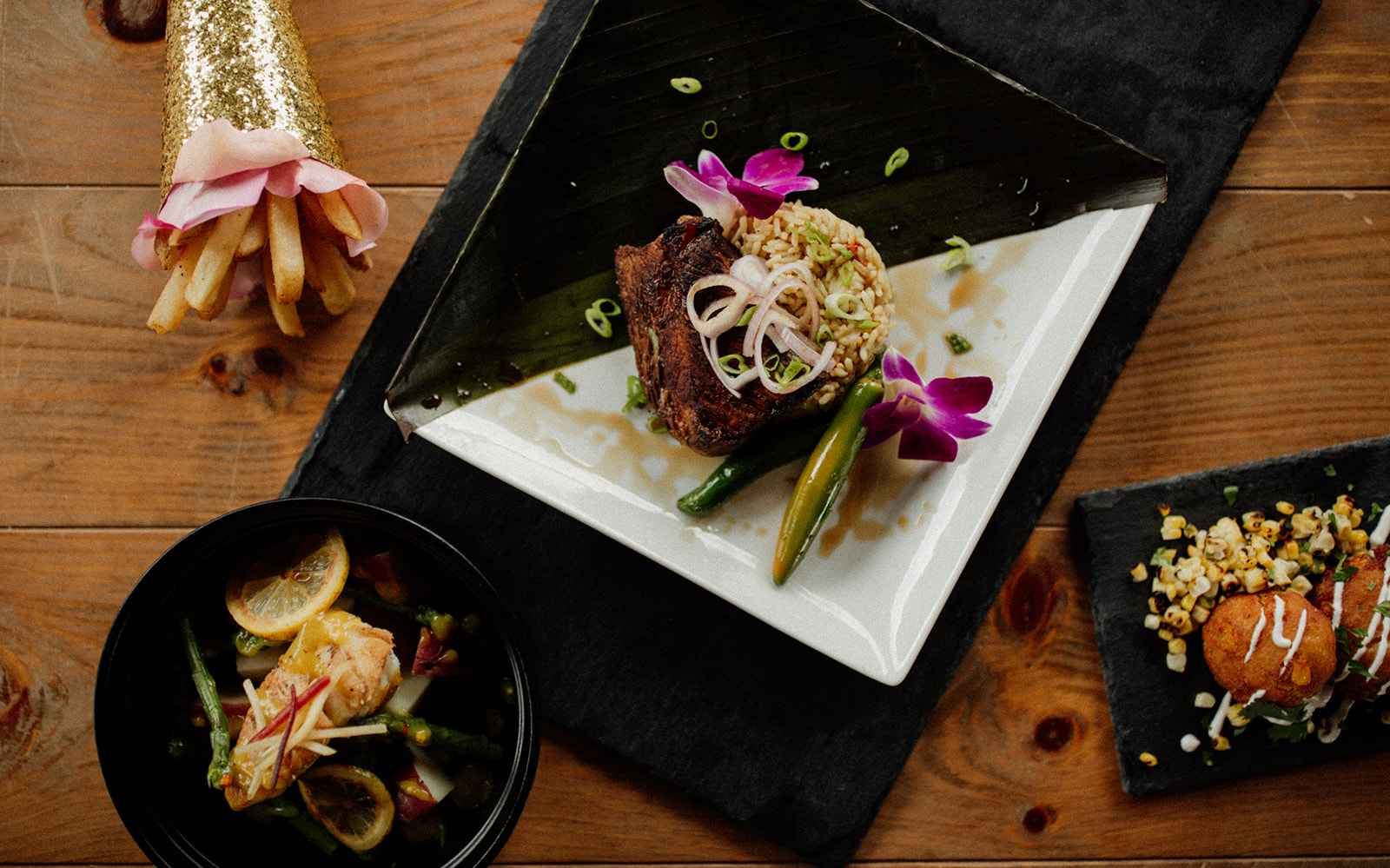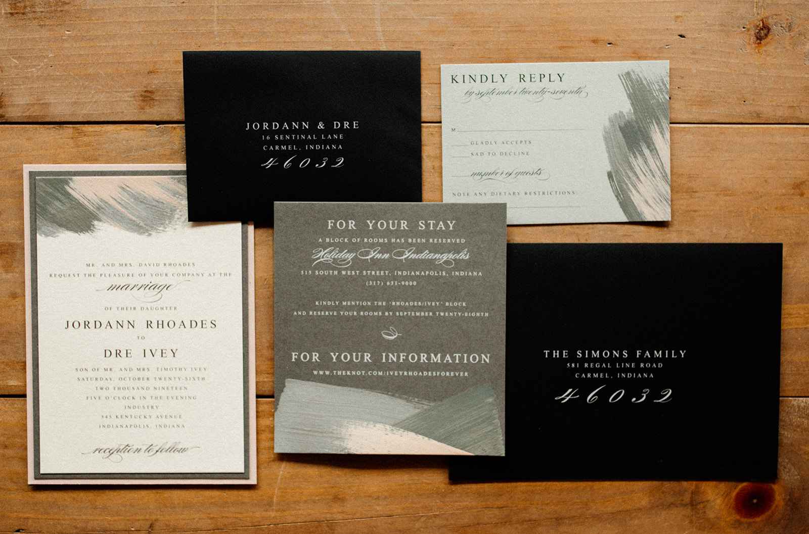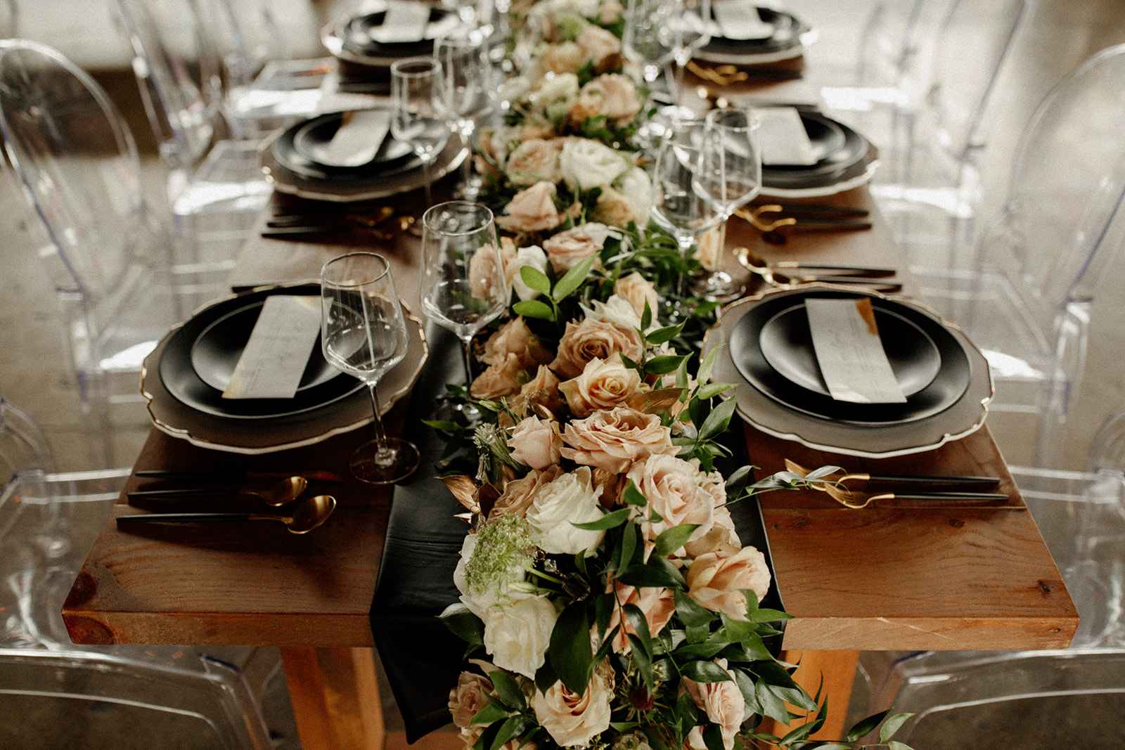 Playing off of the 'opposites attract' theme, the team merged classic elements with more popular trends. Sarah notes, "Rather than bringing in 'hot trends' per se, we blended the old with the new. We brought in a lot of textural elements with leather and heavy floral while maintaining a clean look overall." This combination of style was demonstrated through the rentals. Sarah adds, "We rented slate black plates from A Classic Party Rental and ghost chairs from Violet Vintage. Atmosphere Indy created a stunning drapery display for our ceremony site with a single chandelier. These set the tone for our shoot by creating a clean, modern feel with the classic and whimsical elements brought in with the drapery."