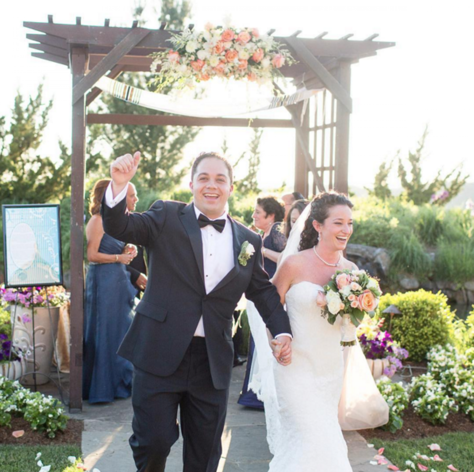Our editors say: Suspended floral, a ceremony pergola, gorgeous weather, a smiling bride and one very enthusiastic groom makes this an all-around heartwarming scene. #happyeverafterstartsnow