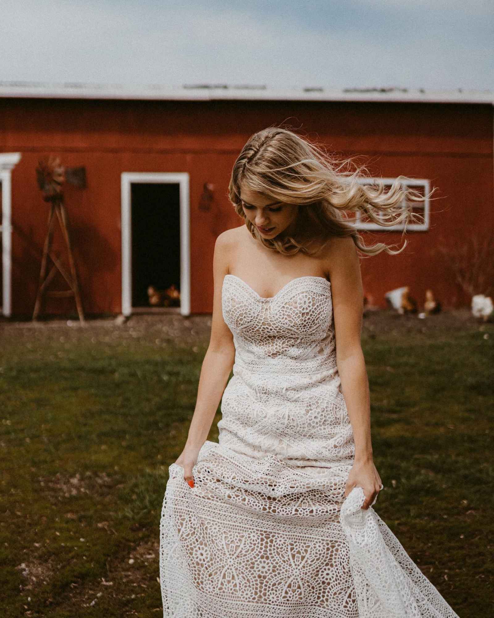 Our editors say: We love the way this textured dress and the bride's relaxed hairstyle fits with this barn venue! #rusticchic