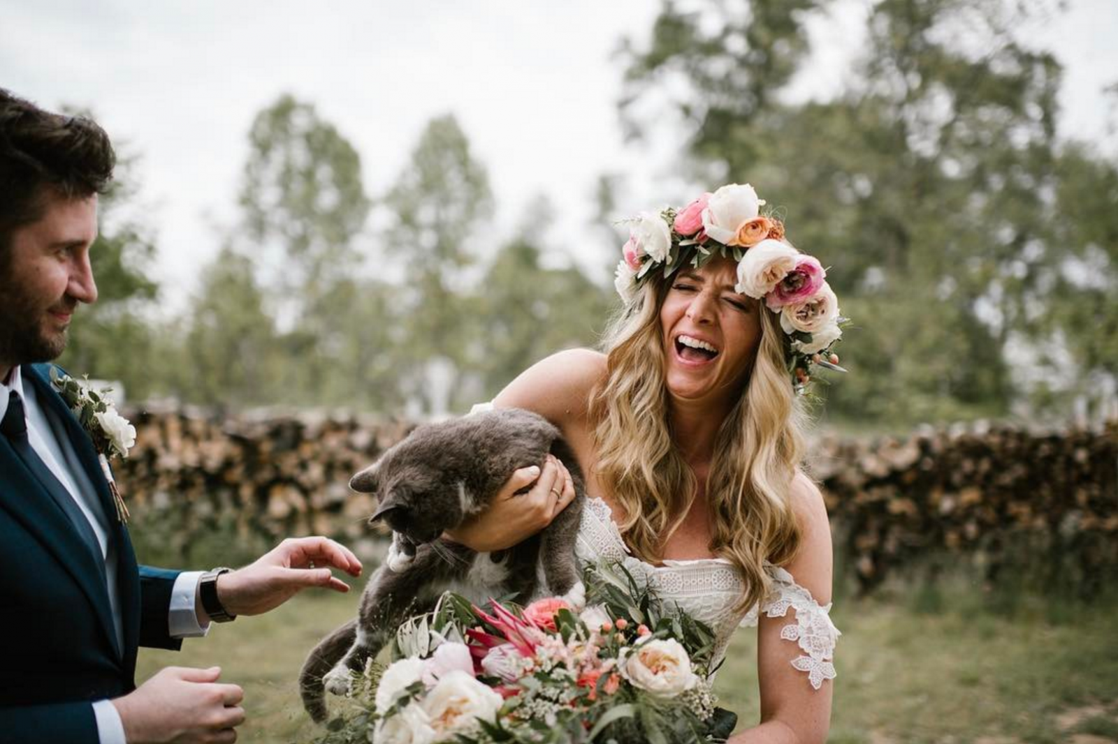 Our editors say: This bride knows how it's done. A to-die-for floral crown + a precious fur baby = wedding day necessities! #purrfectoccasion