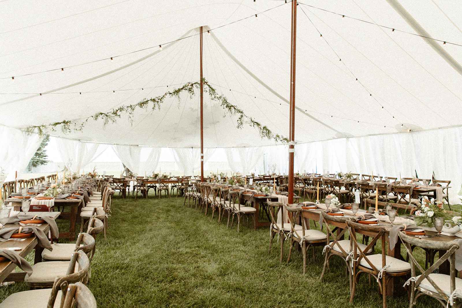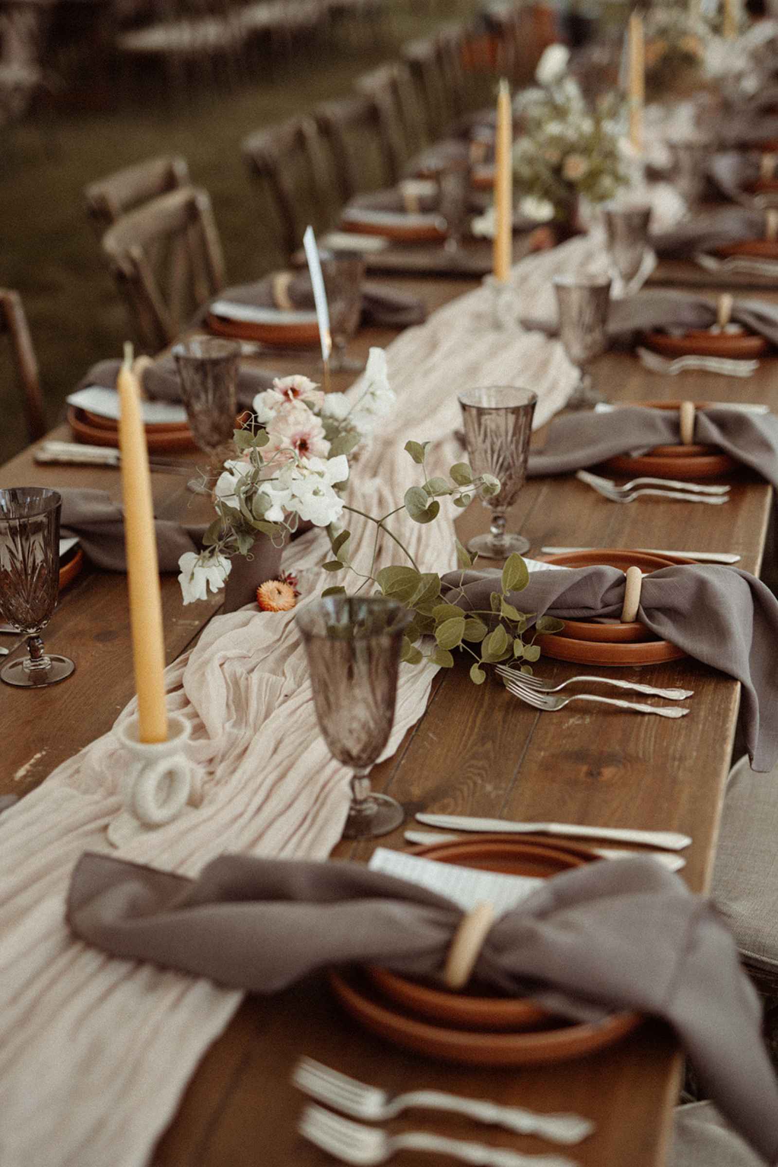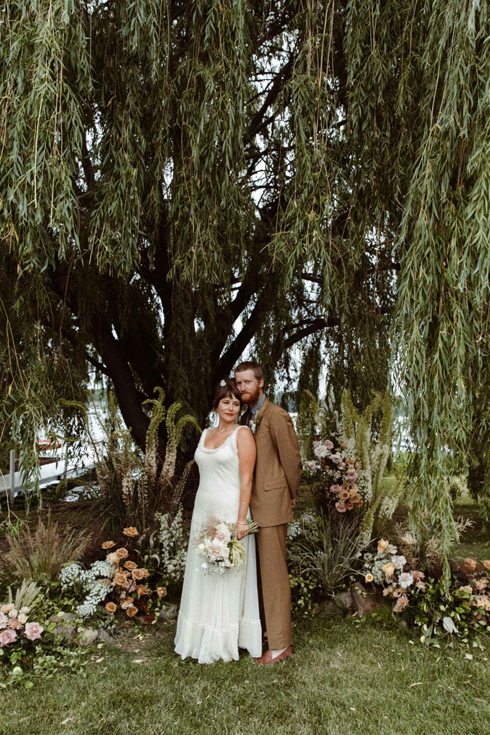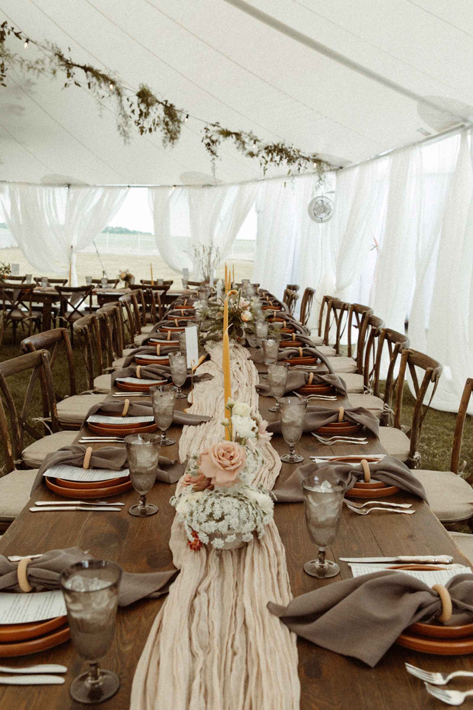 As soon as Whitney was engaged to Brian, she knew two things. One, she wanted to honor where she came from by getting married on the lake she grew up on, even though she now lives in California. Two, using her family’s rental business—AAYS Event Rentals—and their connections from many years in the wedding industry was the best way to find her vendors as well as allow Whitney a fun opportunity to work with her dad and sister. Brian and Whitney used the lake as inspiration to make a Roman-inspired summer camp wedding. Finding a middle ground between Whitney’s love for bold color and Brian’s liking of simpler hues, they decided to go with earth tones with plenty of airy elements. We love the way this truly looks like a woodland Roman feast, especially with the handmade décor items made by Whitney herself that give life to this simplistic yet elegant theme!