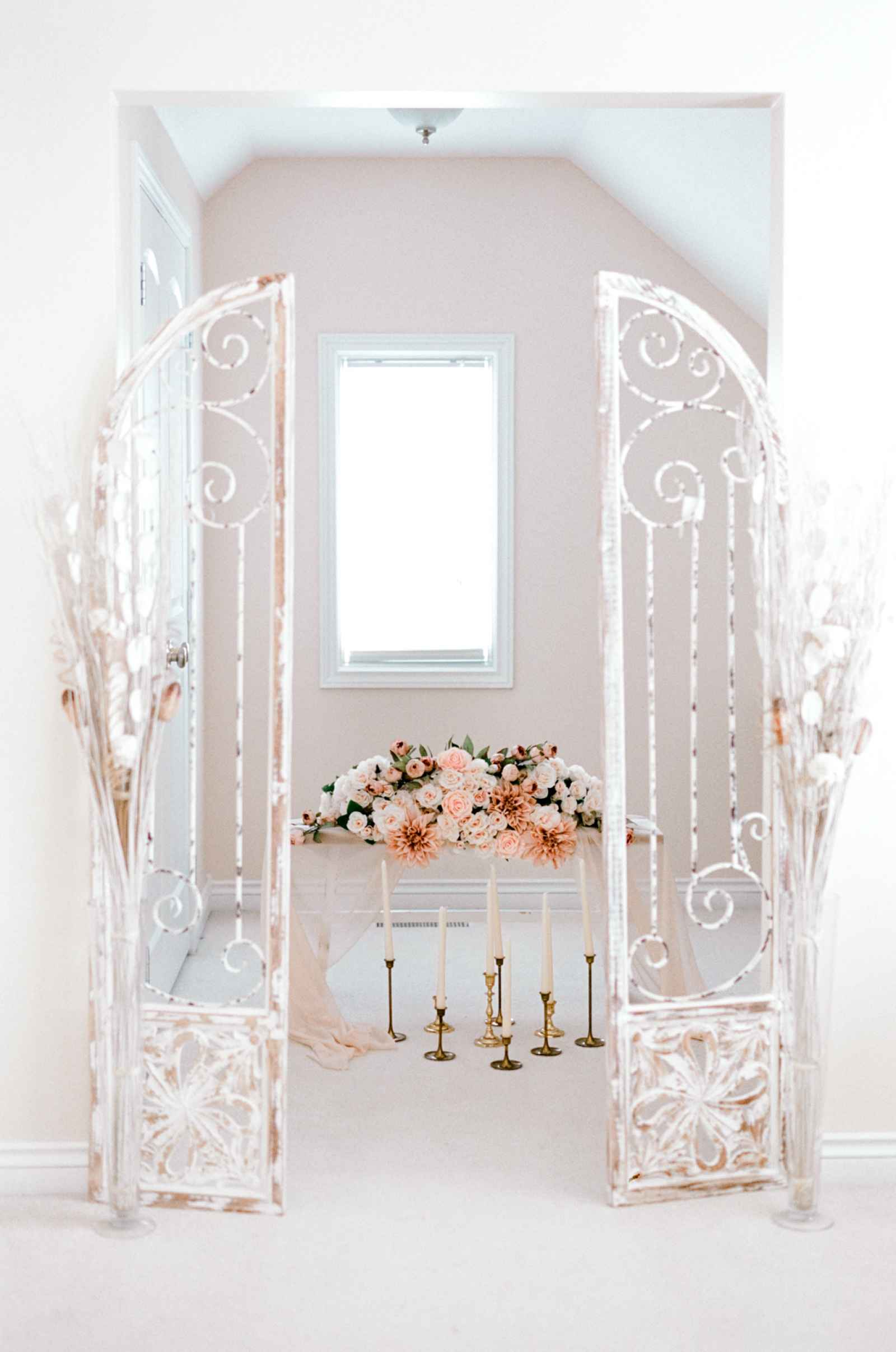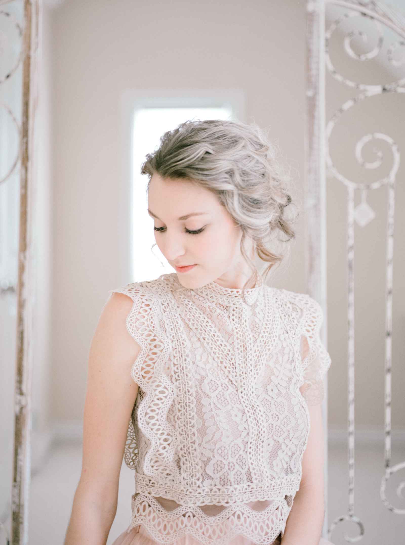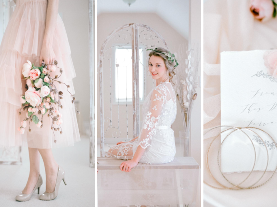 To curate that French feeling, Sandra aimed for a soft, charming shoot with an ivory and blush palette. She also included several elements for a traditionally feminine edge including textures like tulle and hues of pink. Sandra adds, “This styled shoot features an intimate bridal suite featuring feminine details such as French lace, tulle skirts, blush florals and delicate stationery.”