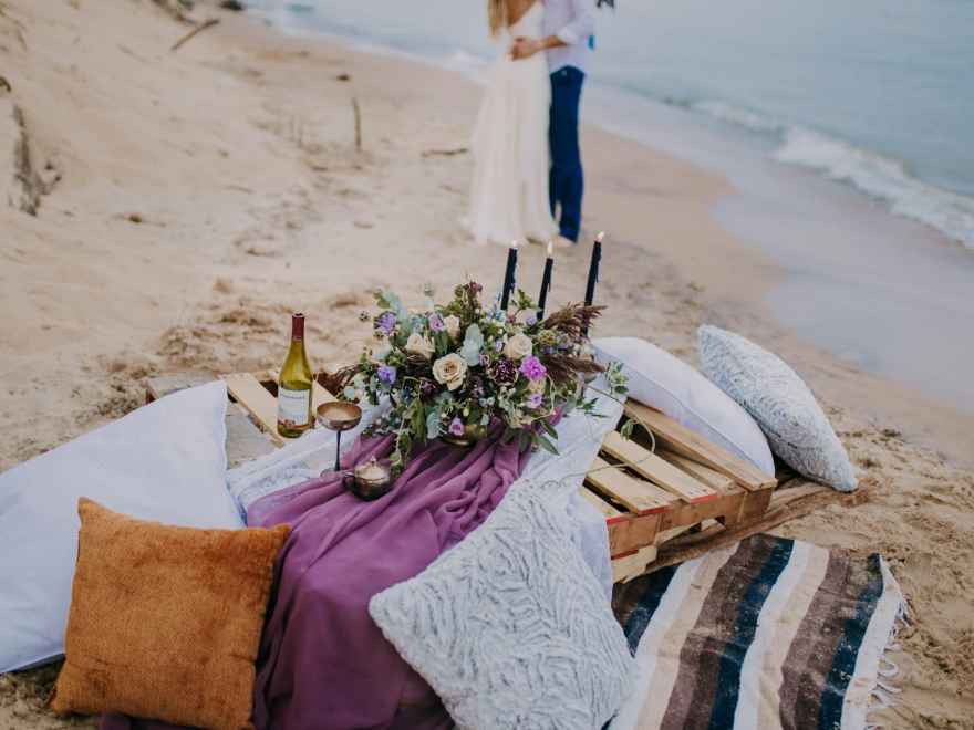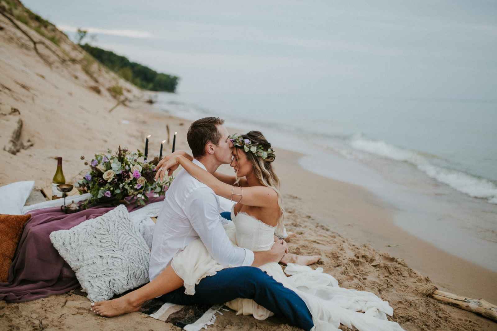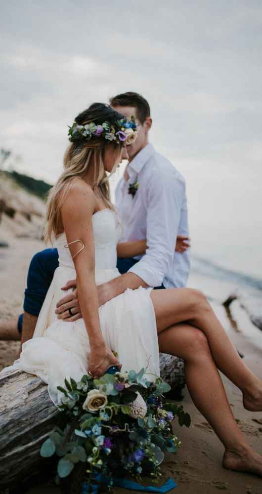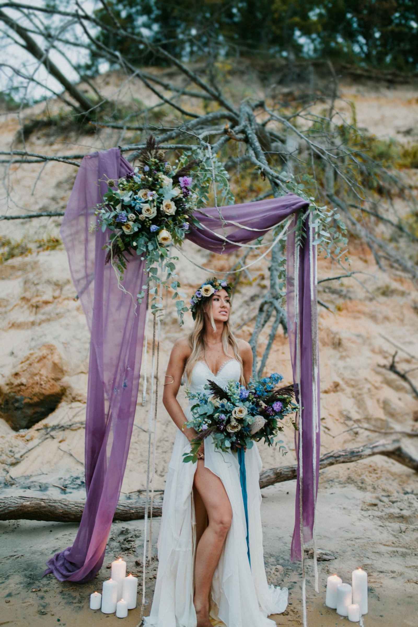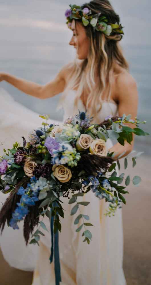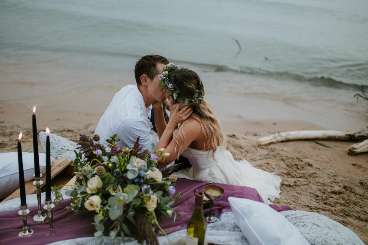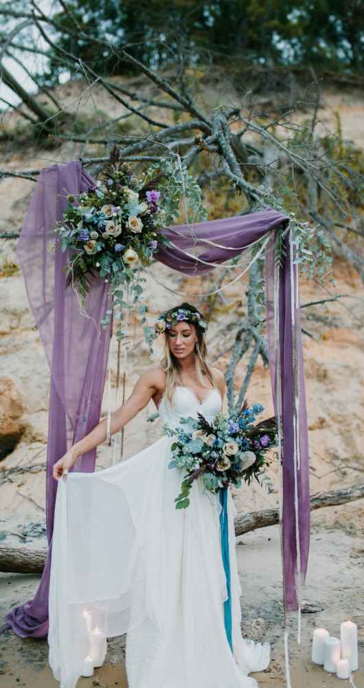 “It was evident that we wanted to bring in an elopement or intimate wedding feel near the water!” says Krissy. “In all of our designs, it’s our goal to create each one with the surroundings in mind. We incorporated lots of earth tones along with the pops of purples and blues to capture the depth and movement of the water. We wanted this to be an intimate setting that would showcase the intimacy of the couple.”