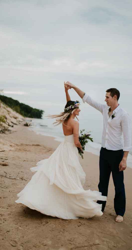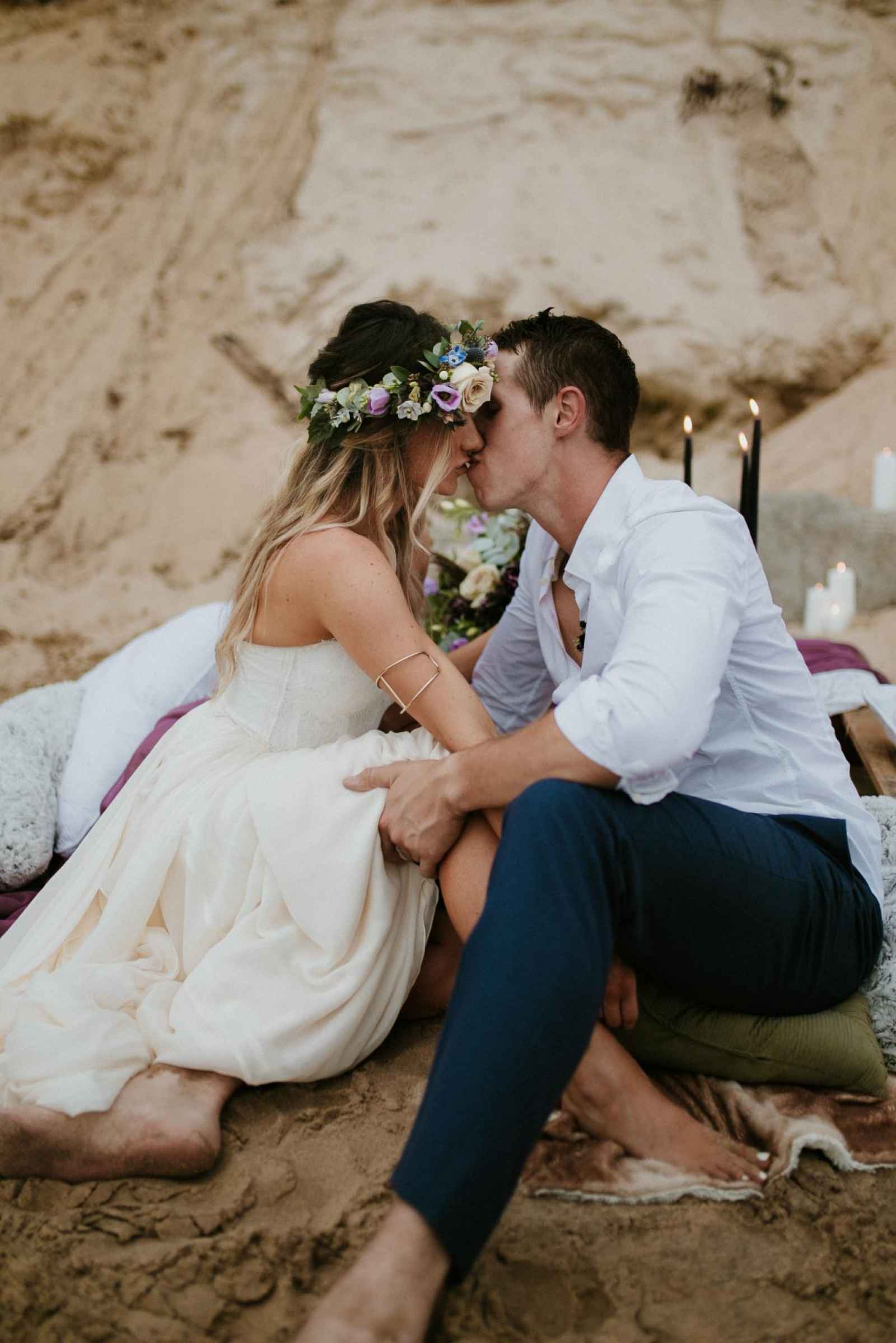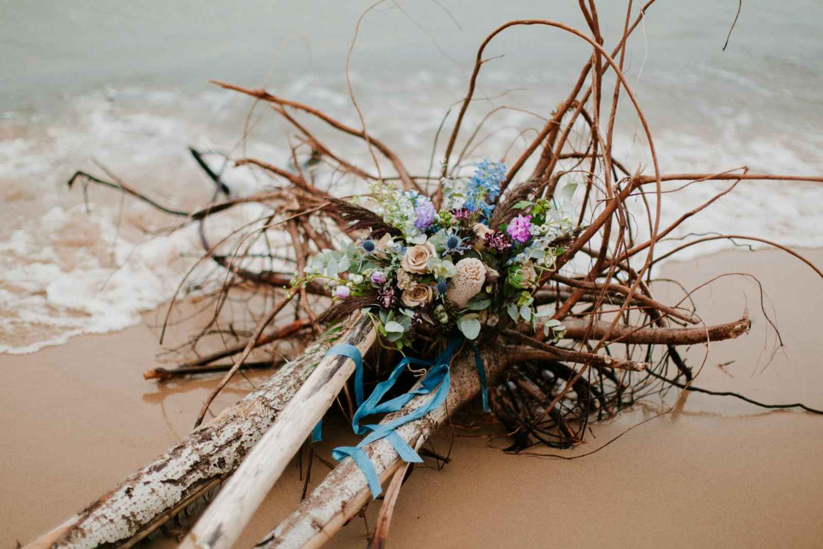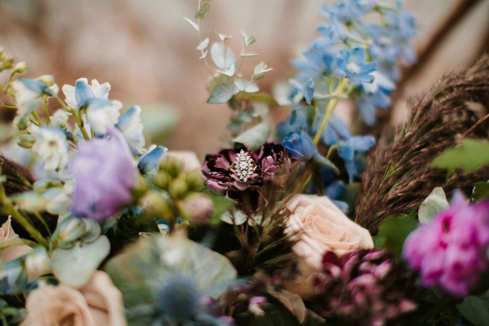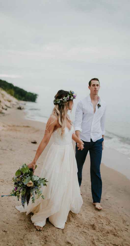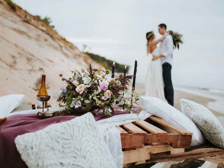 “It was evident that we wanted to bring in an elopement or intimate wedding feel near the water!” says Krissy. “In all of our designs, it’s our goal to create each one with the surroundings in mind. We incorporated lots of earth tones along with the pops of purples and blues to capture the depth and movement of the water. We wanted this to be an intimate setting that would showcase the intimacy of the couple.”