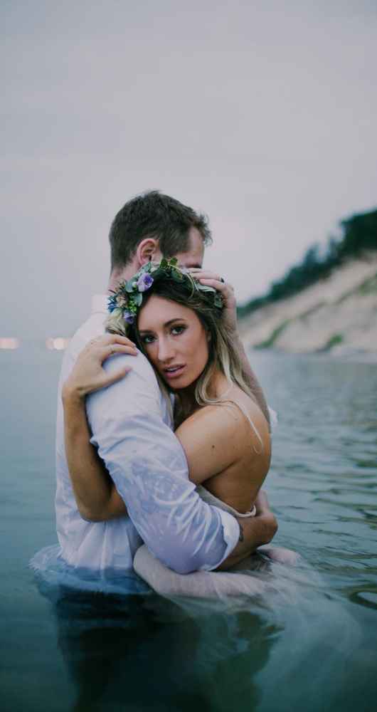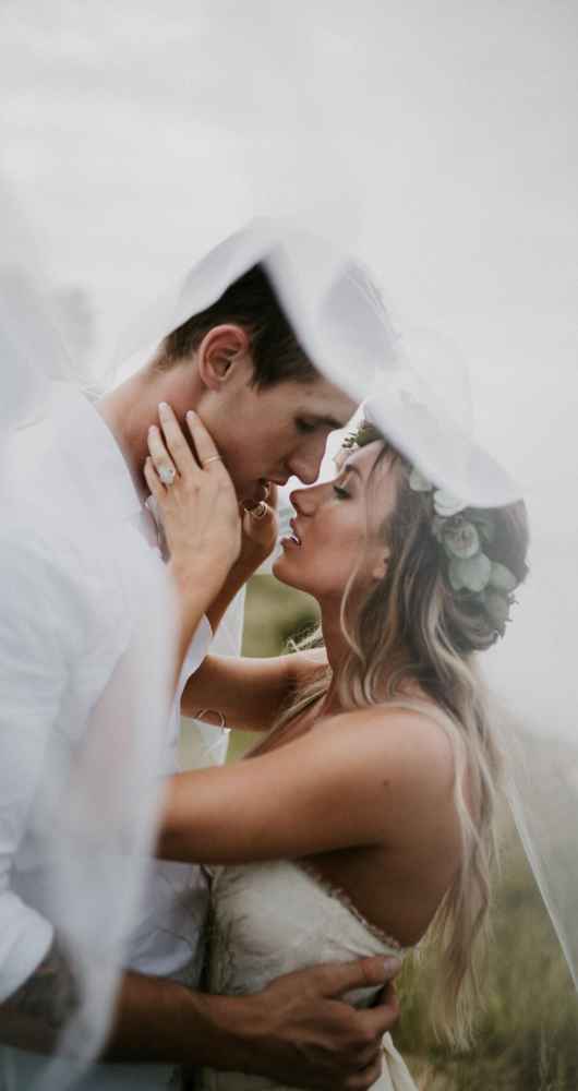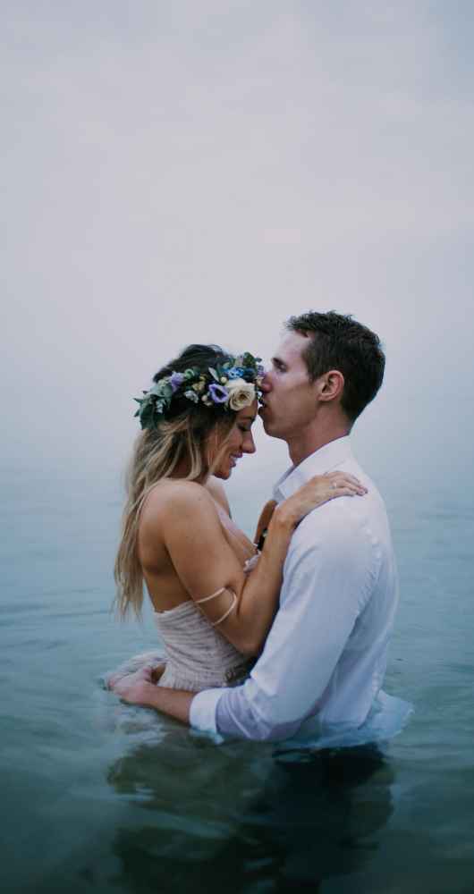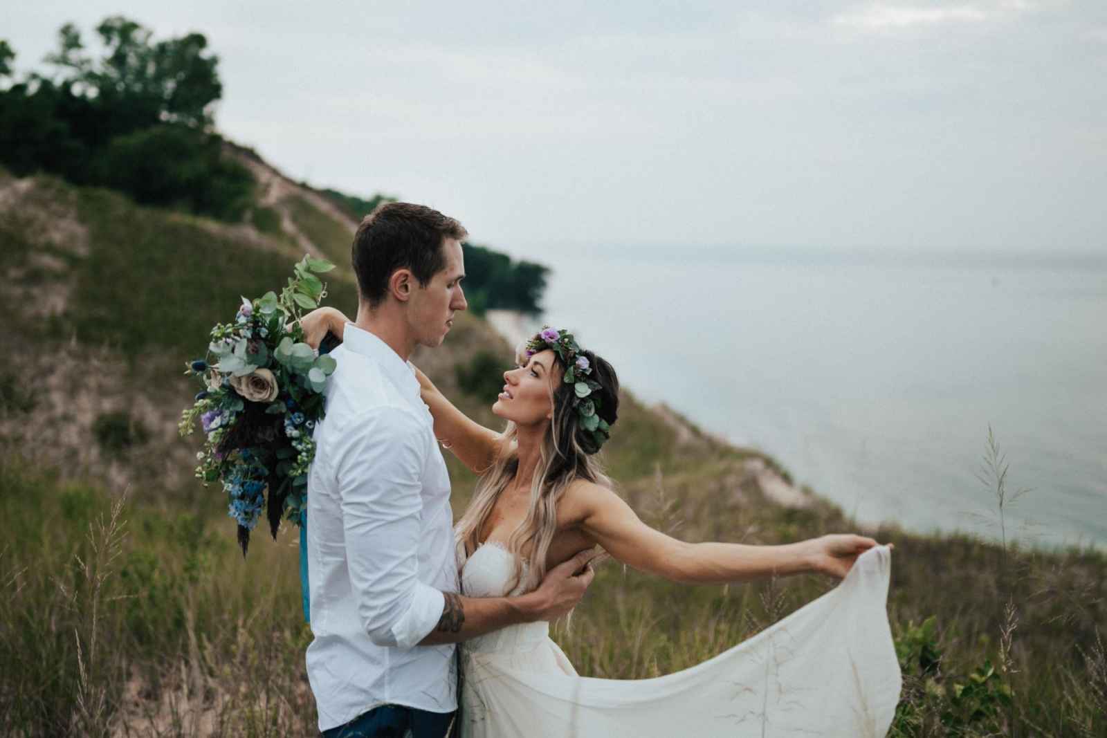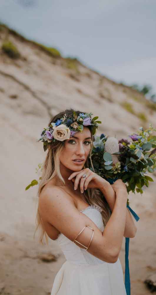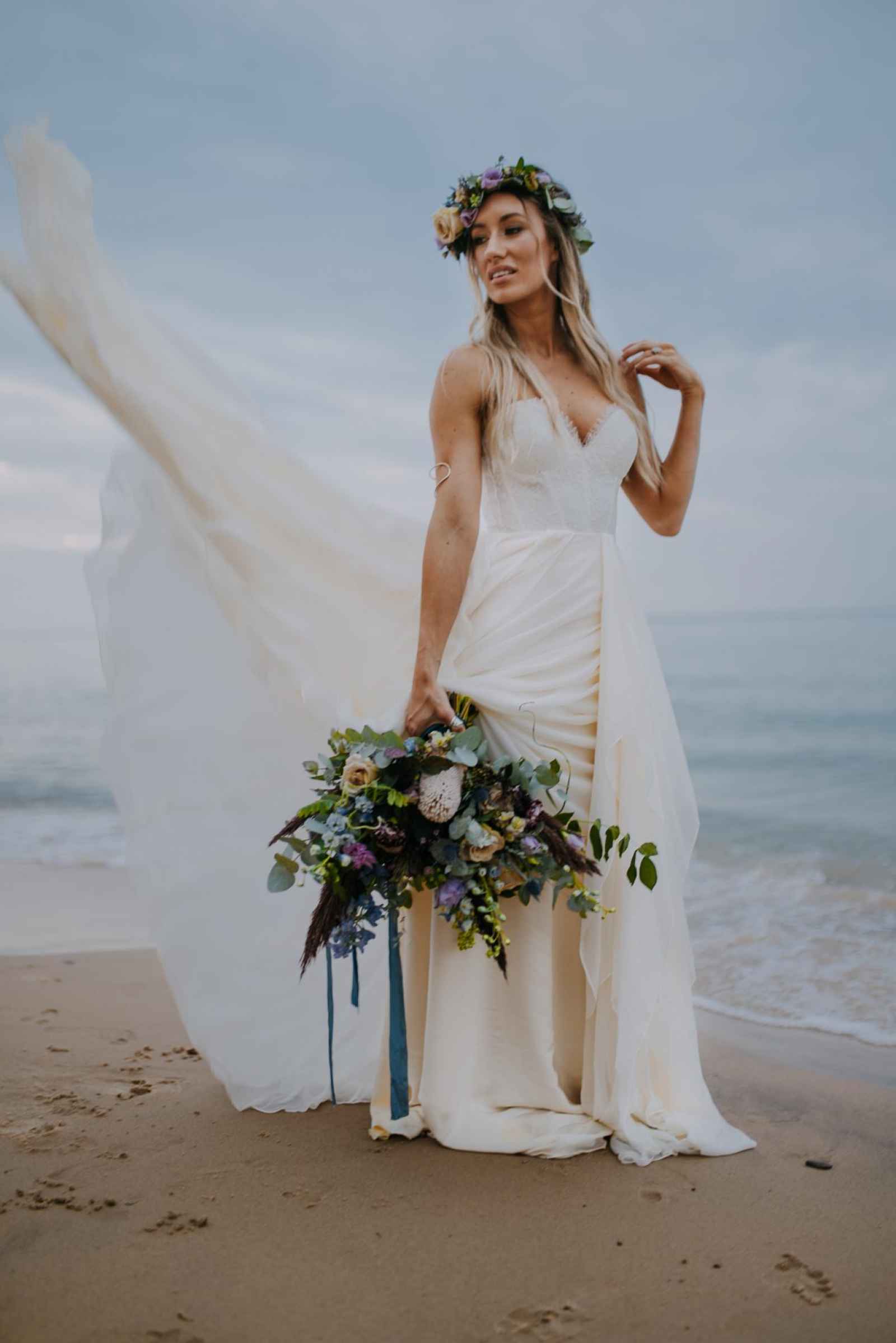 The natural backdrop and its free-flowing elements like wind and waves also inspired the bridal look, which included a soft and simple flowing gown, equally natural hair and deeper, moody tones incorporated into the makeup.