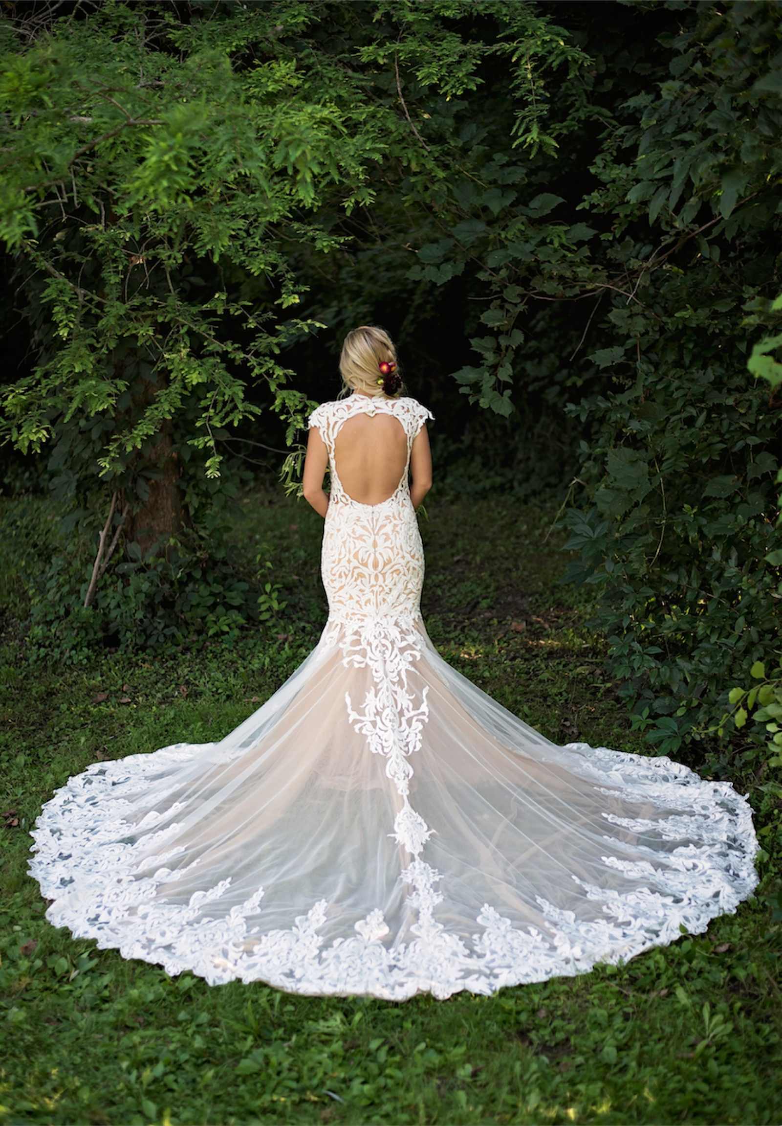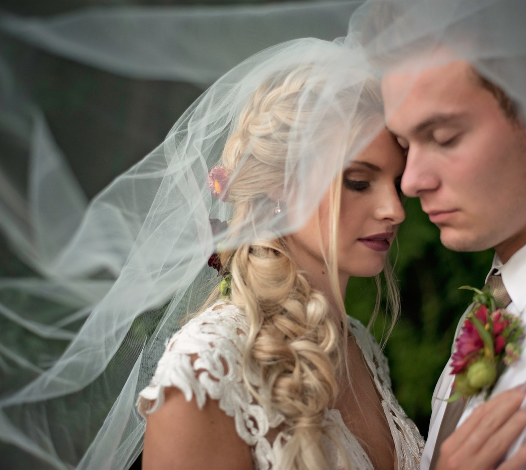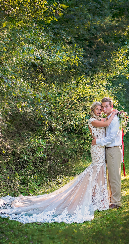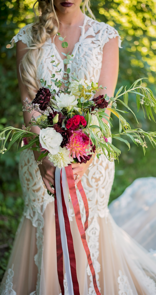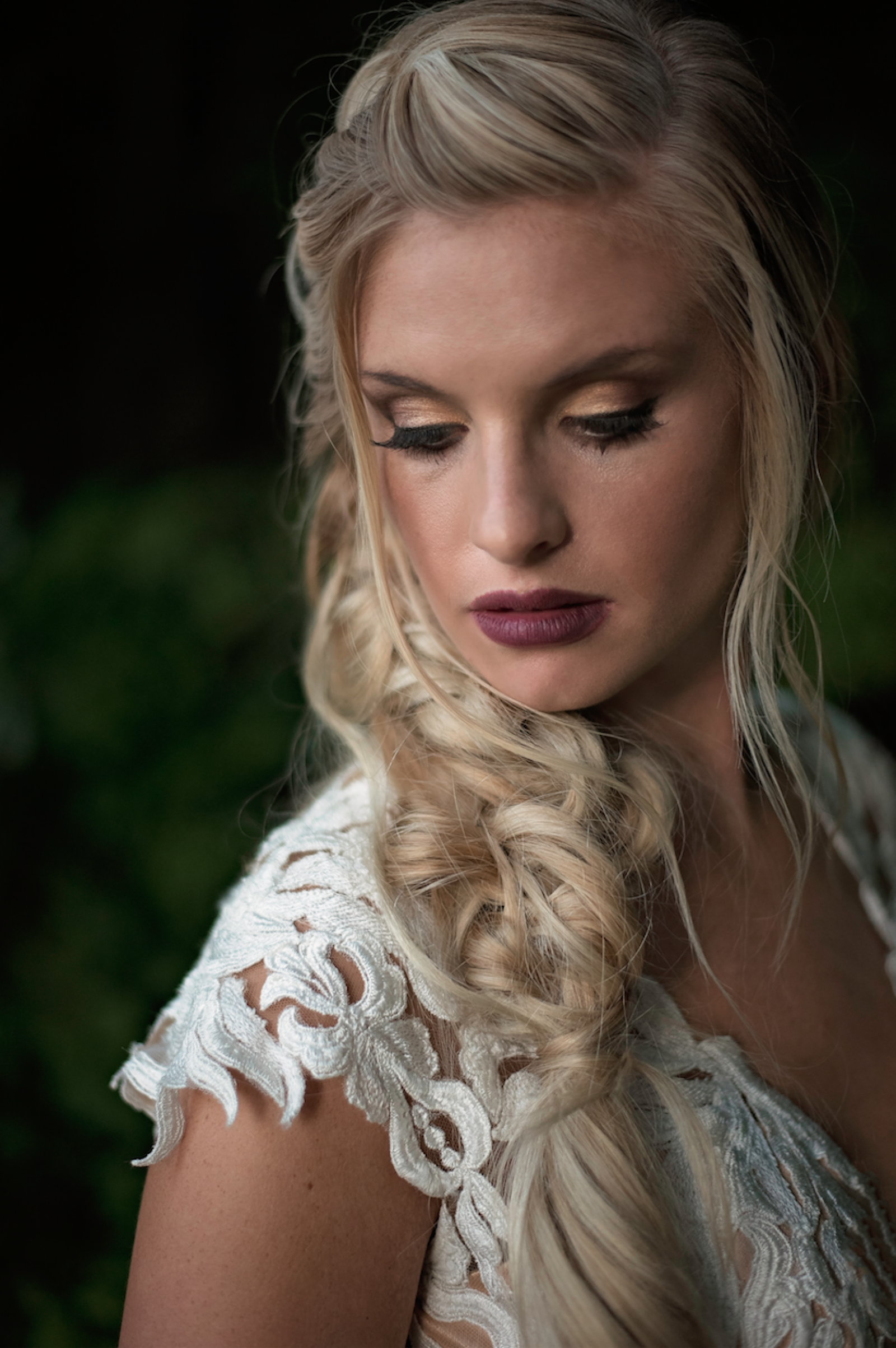 Desiring to create a late summer/early fall wedding inspiration in burgundy, red, rose gold and white color scheme with plenty of contrast, Monika first selected the gorgeous, lacy gown and paired it with unique rose gold jewelry, an intricate yet loose braid and a bold lip.