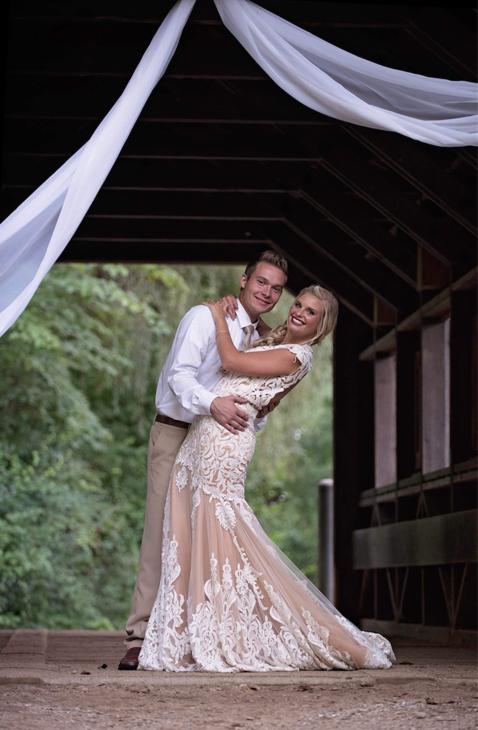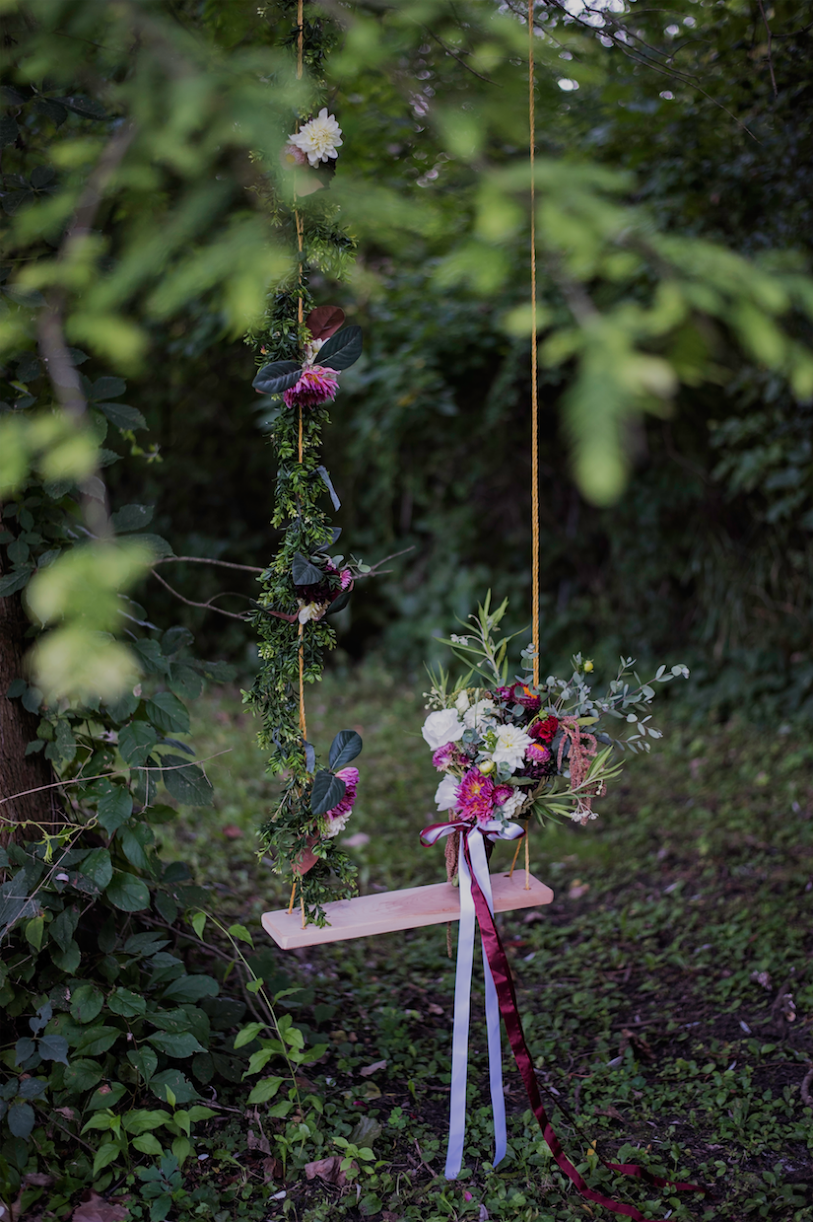 The elegant invitations, menus and escort cards were inspired by the season’s blooms featured in the beautiful bouquet and decorated swing. She adds, “Lots of brides are working with limited options around here. I wanted to show brides that you can create a beautiful wedding without spending a fortune.”