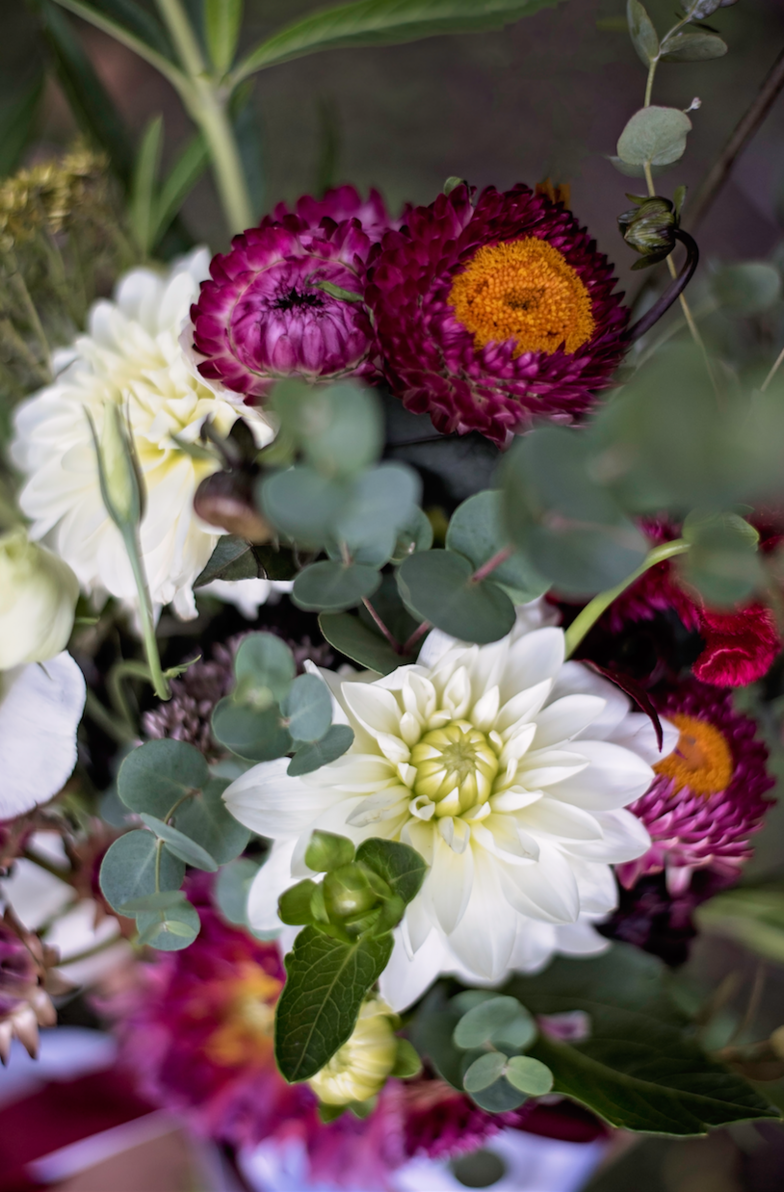 The perfect recipe for prettiest tablescape was the contrast of white and burgundy, plates and vases in natural tones, rose gold accents and fresh apples. Repurposed furniture help to complete the rustic, woodland theme.
