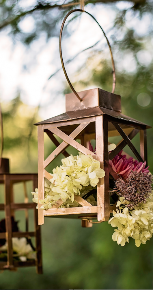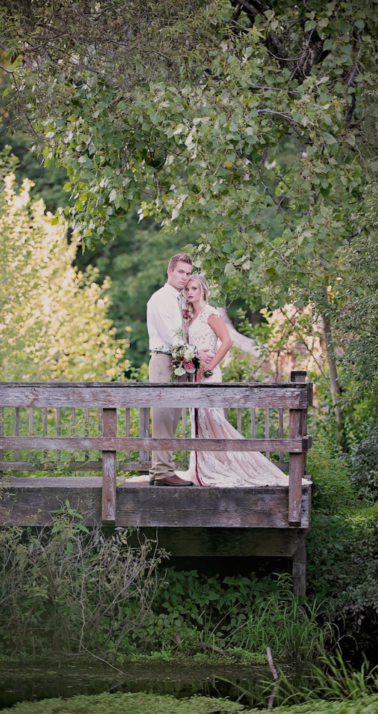 Walking in the Kellogg Forest often during different seasons of the year, Monika of Monika Anderson Photography was inspired. “It offers beautiful sceneries such as pond with boardwalk, big willow trees, a covered bridge, curvy stream with seating along it and ton of gorgeous greenery!” she says. “I was picturing the wedding gown hanging from the top of the bridge, table set up outside by the pond, lanterns full of flowers hanging from the tree above, bouquet sitting on decorated swing, romantic sign on the way to isle and a couple exchanging sweet kisses by the stream.” She felt the locale offered a perfect wedding location for low-key couples with small amount of wedding guests.