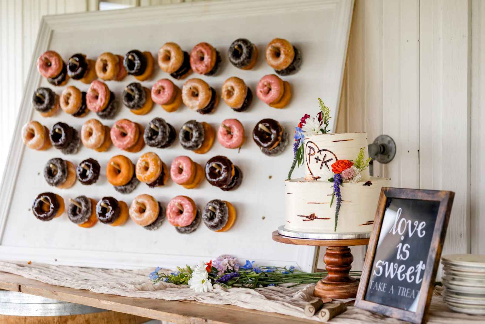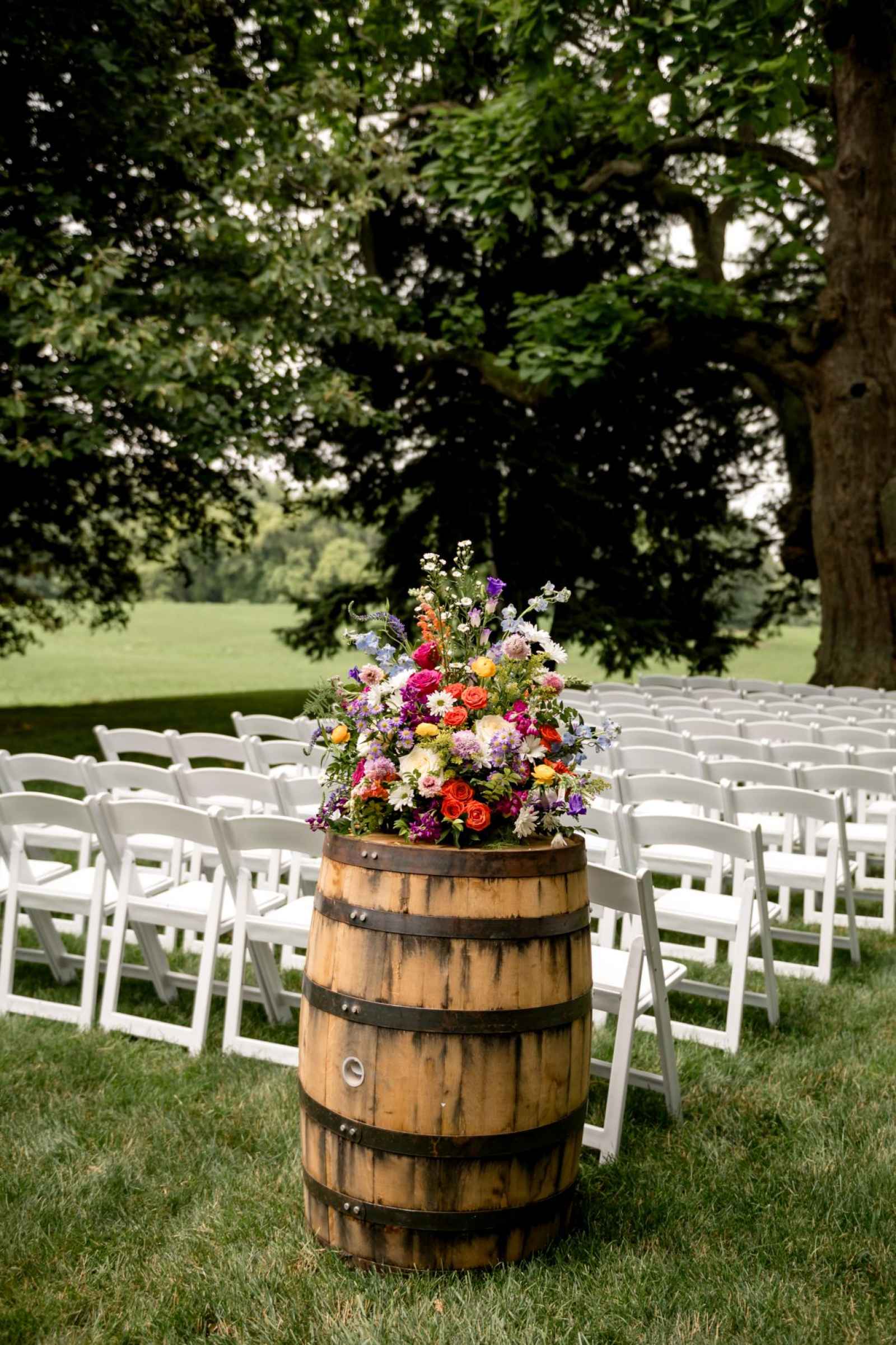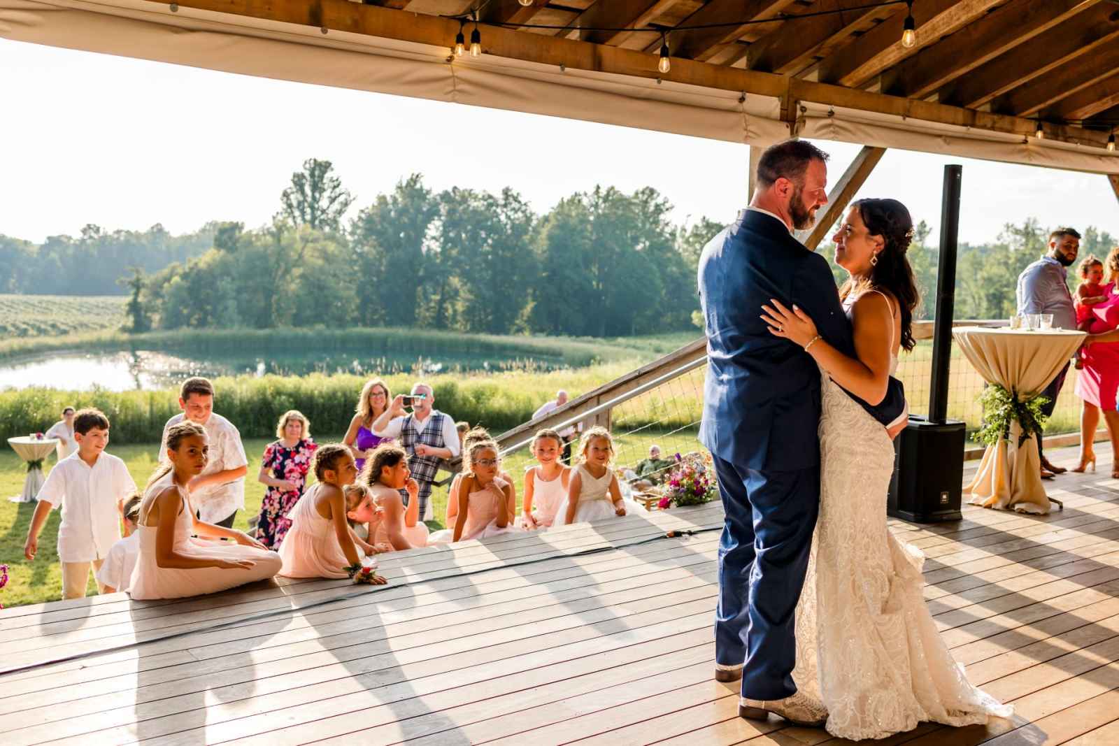 Krista and Phillip always wanted to be married in a barn. They ended up finding their ideal venue, which had the perfect balance between rustic chic and quiet elegance. The flowers are what helped Krista decide on the color palette. Looking at their venue, she saw so many natural elements and knew wildflowers were the right choice. Their bright colors stood out beautifully against the natural wood details and the refined white elements. Krista even had her bridesmaids wear colors close to white so that the flowers popped even more! The venue already had a lot of natural beauty with the vineyard and pond on the property, so Krista and Phillip didn’t have to do much to make the space shine! The rentals from AAYS Event Rentals enhanced this already beautiful space perfectly.