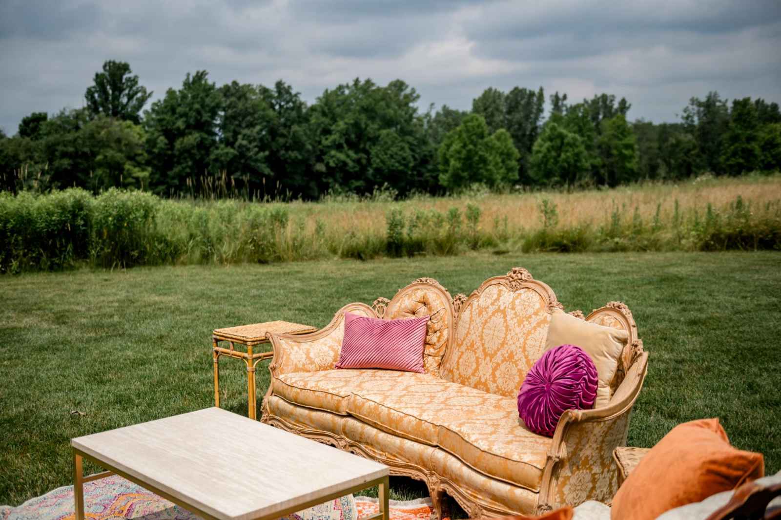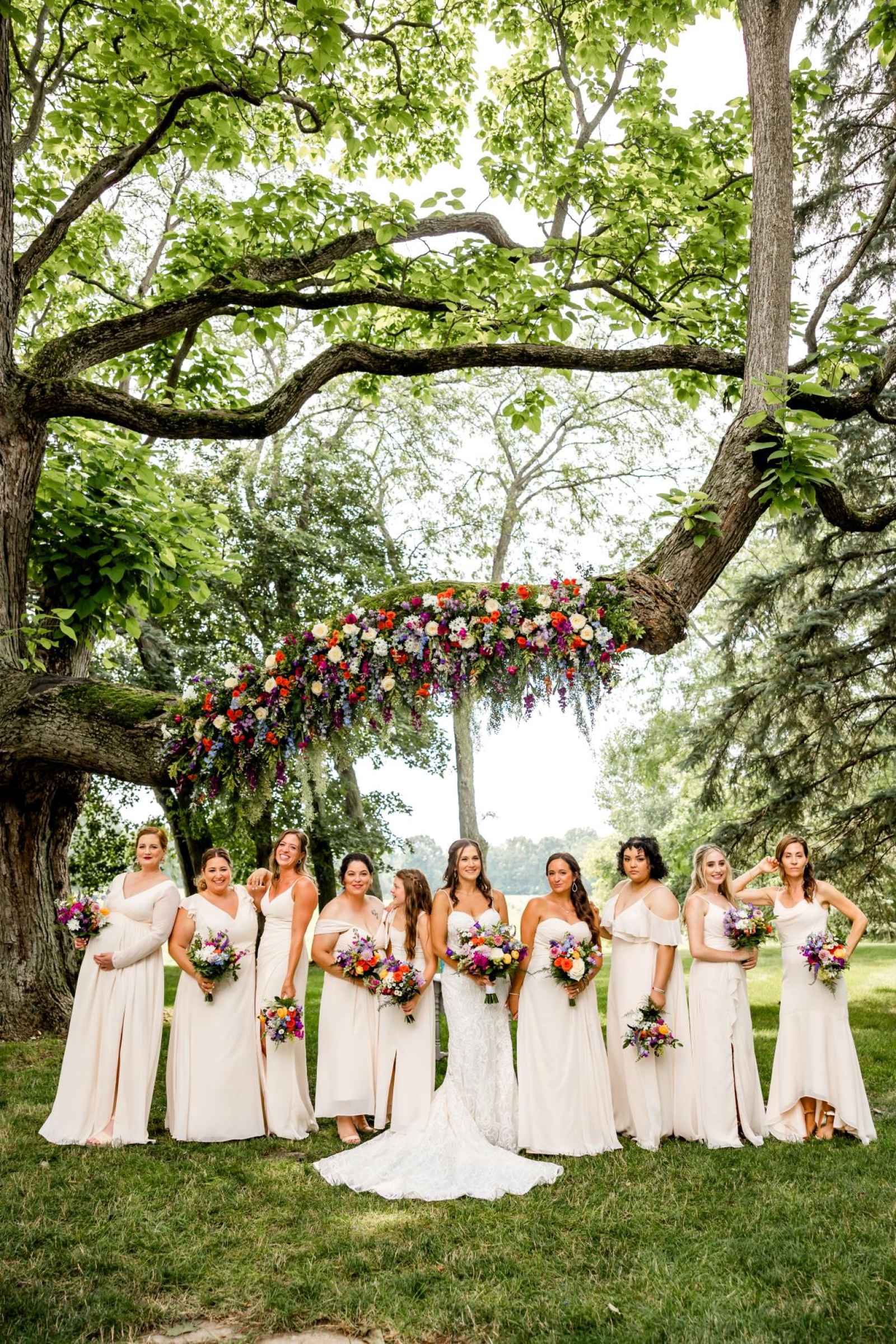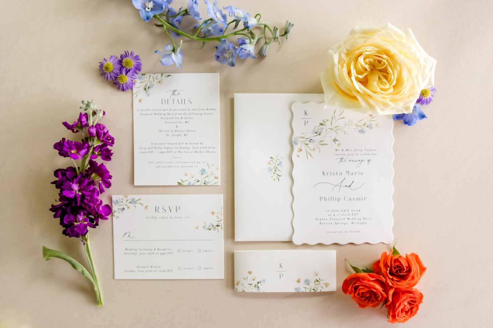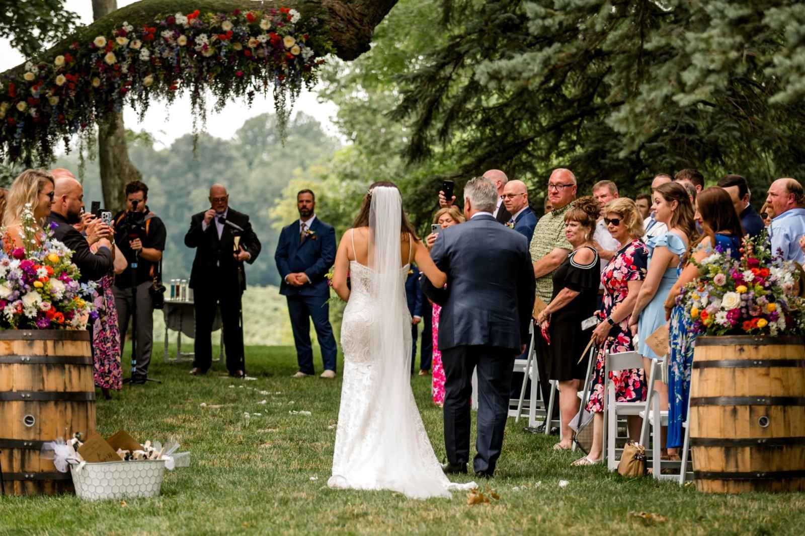 Krista and Phillip always wanted to be married in a barn. They ended up finding their ideal venue, which had the perfect balance between rustic chic and quiet elegance. The flowers are what helped Krista decide on the color palette. Looking at their venue, she saw so many natural elements and knew wildflowers were the right choice. Their bright colors stood out beautifully against the natural wood details and the refined white elements. Krista even had her bridesmaids wear colors close to white so that the flowers popped even more! The venue already had a lot of natural beauty with the vineyard and pond on the property, so Krista and Phillip didn’t have to do much to make the space shine! The rentals from AAYS Event Rentals enhanced this already beautiful space perfectly.