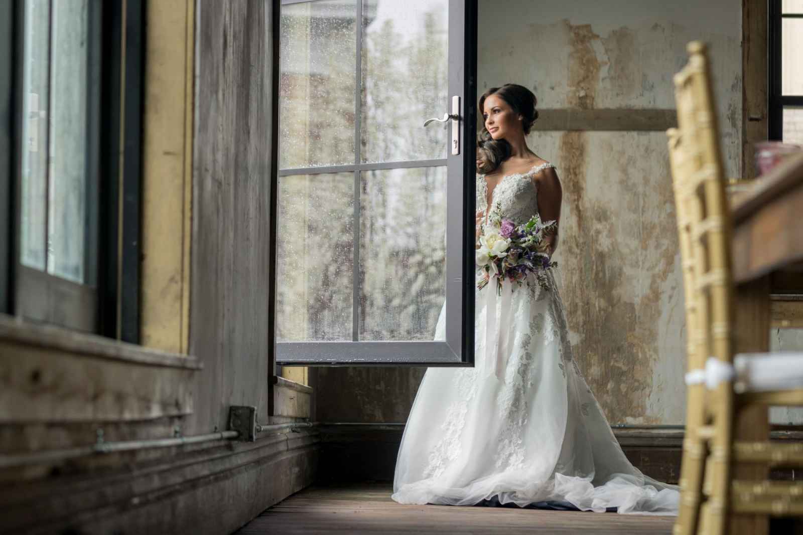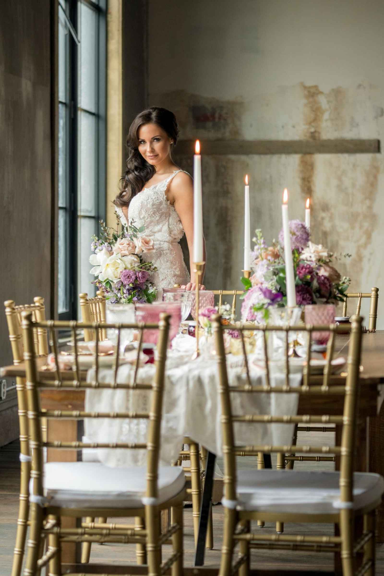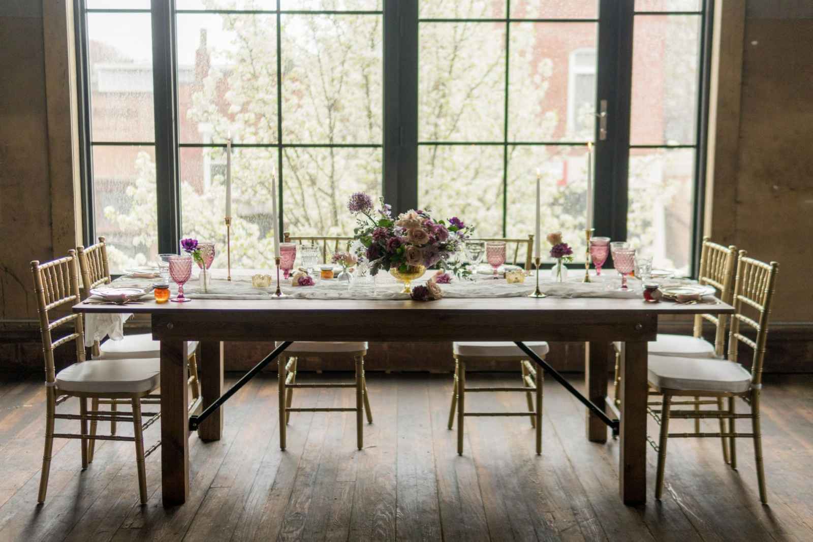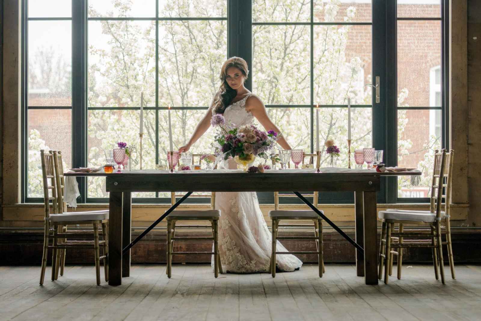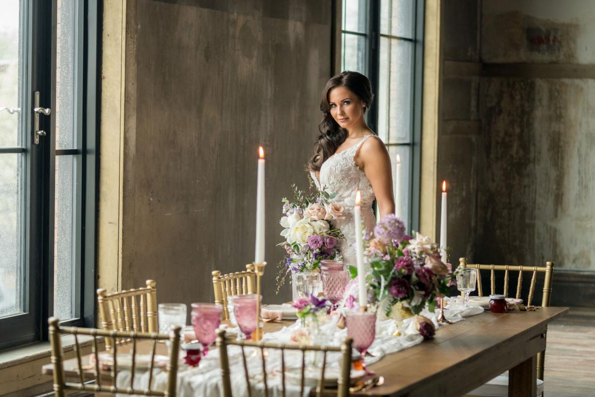 19 North features details like an original, tin ceiling, industrial light fixtures and wood-plank floors. John adds, “19 North offers couples a majestic ceremony space that is turned into a beautiful reception area for dinner and dancing, glassed-in cocktail reception area, built-in bar and a fully appointed bridal suite with a private bathroom any bride will be comfortable in.” Given all the unique highlights of the venue, the team knew they wanted to show off how the space at 19 North delivers modern style with that unmistakable Midwest vibe. The planner for the shoot, Allison Booker of Unveiled Weddings & Events, says, “There were some amazing bones in the structure along with stunning full-length windows. We just couldn’t get enough! We really love blending hard lines of industrial spaces with delicate details to create the perfect ebb and flow.”