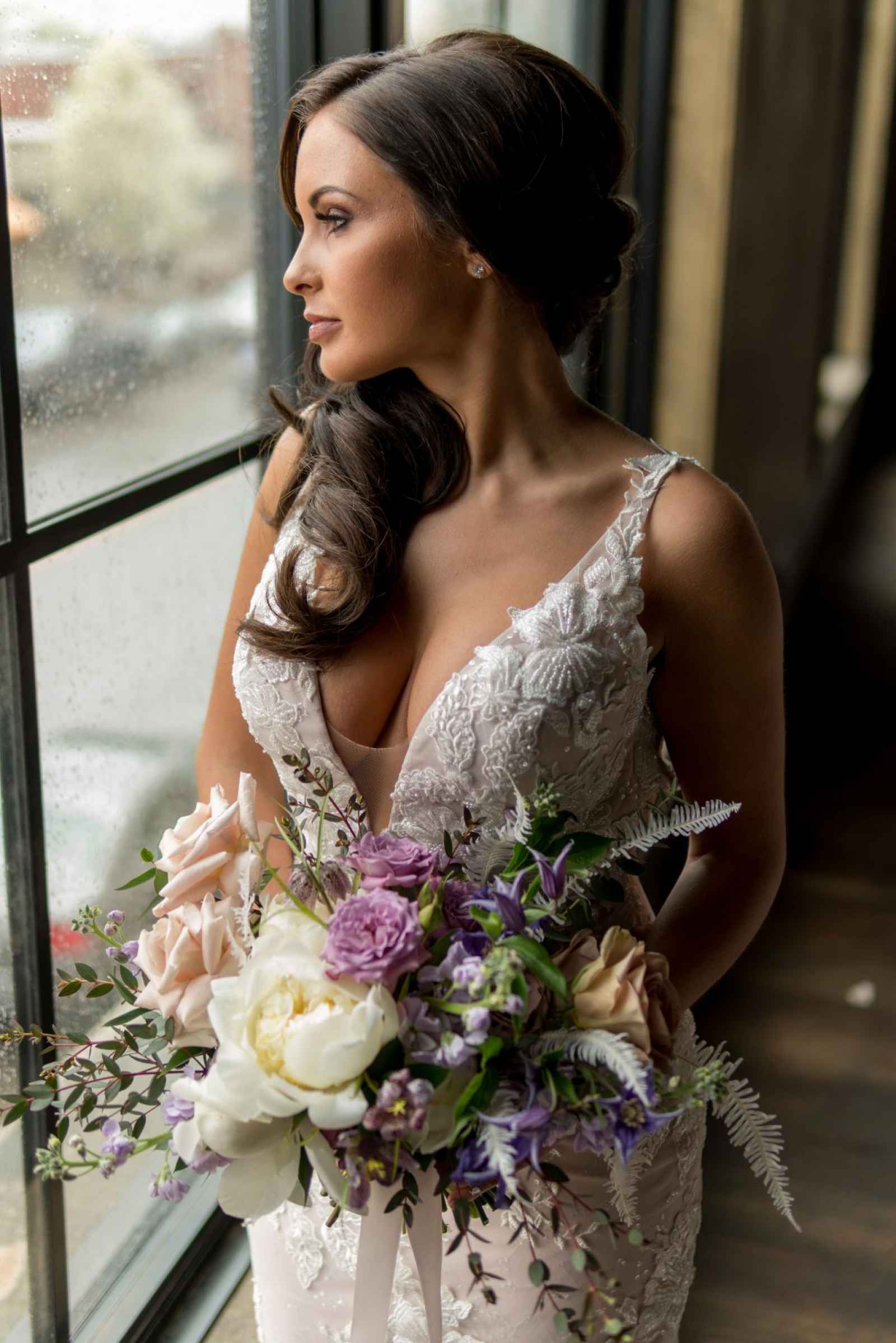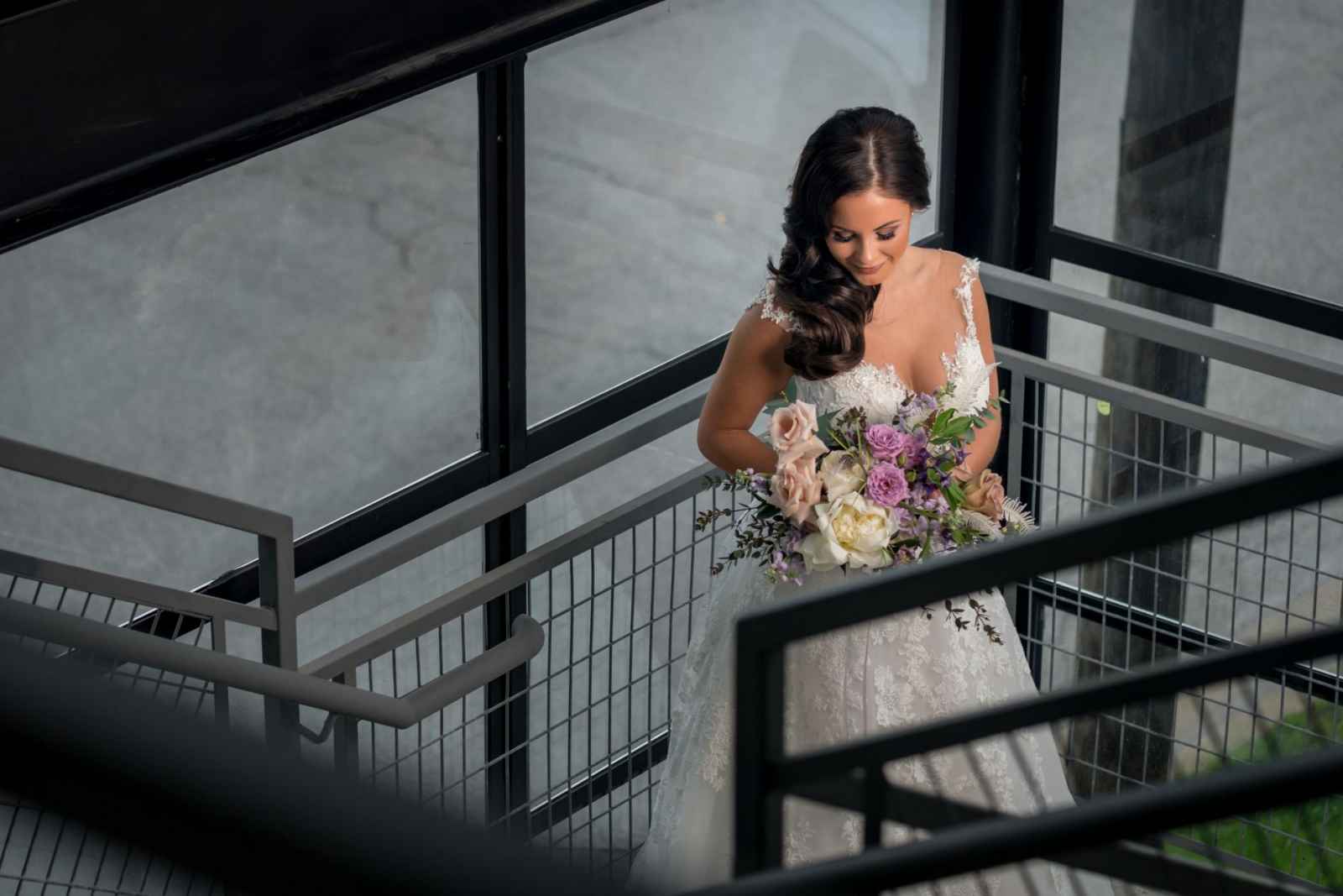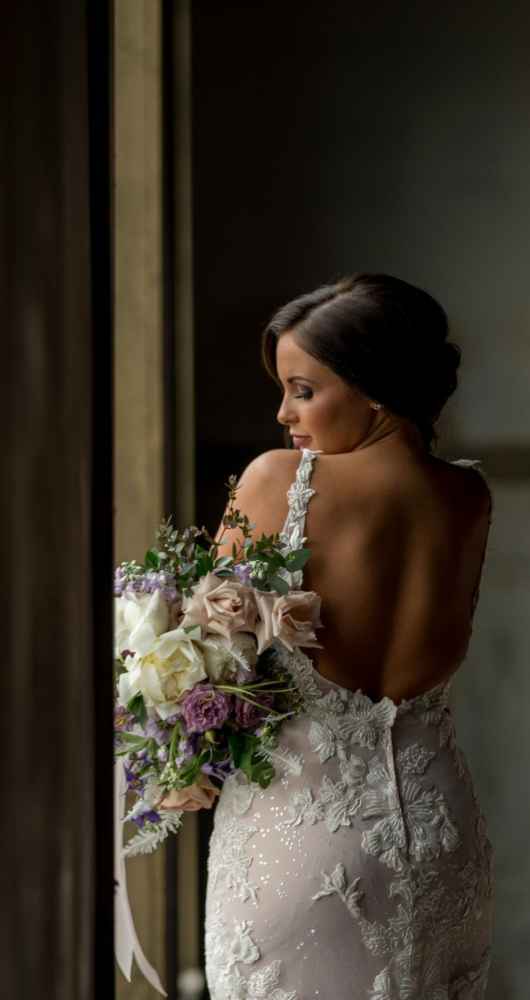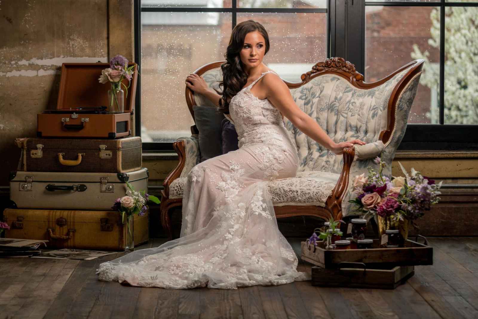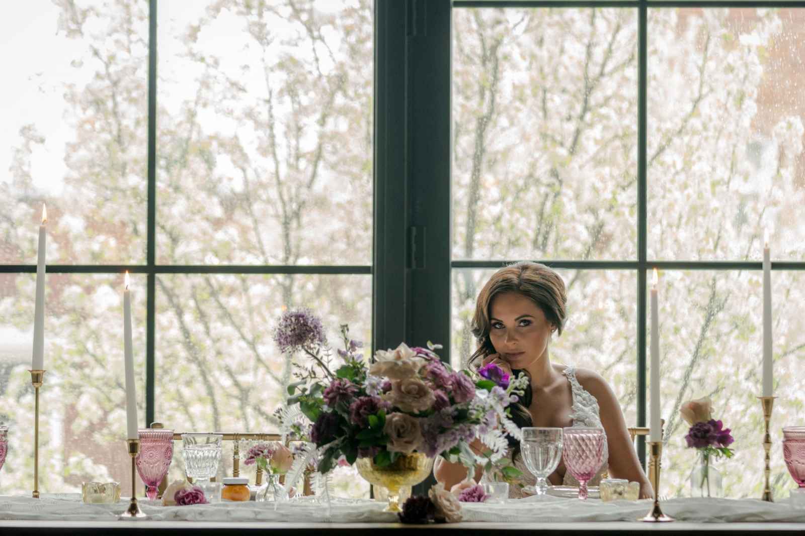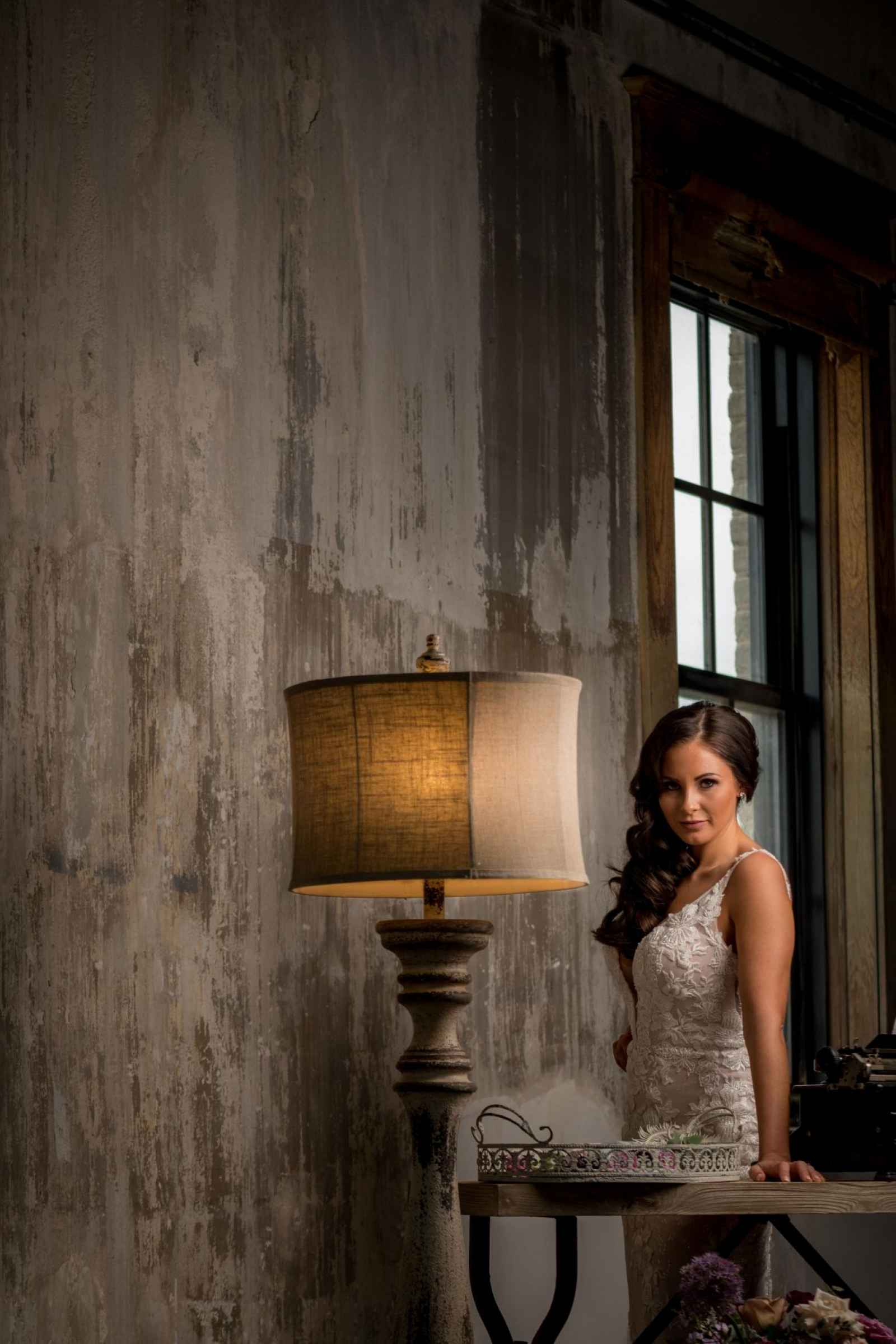 19 North features details like an original, tin ceiling, industrial light fixtures and wood-plank floors. John adds, “19 North offers couples a majestic ceremony space that is turned into a beautiful reception area for dinner and dancing, glassed-in cocktail reception area, built-in bar and a fully appointed bridal suite with a private bathroom any bride will be comfortable in.” Given all the unique highlights of the venue, the team knew they wanted to show off how the space at 19 North delivers modern style with that unmistakable Midwest vibe. The planner for the shoot, Allison Booker of Unveiled Weddings & Events, says, “There were some amazing bones in the structure along with stunning full-length windows. We just couldn’t get enough! We really love blending hard lines of industrial spaces with delicate details to create the perfect ebb and flow.”