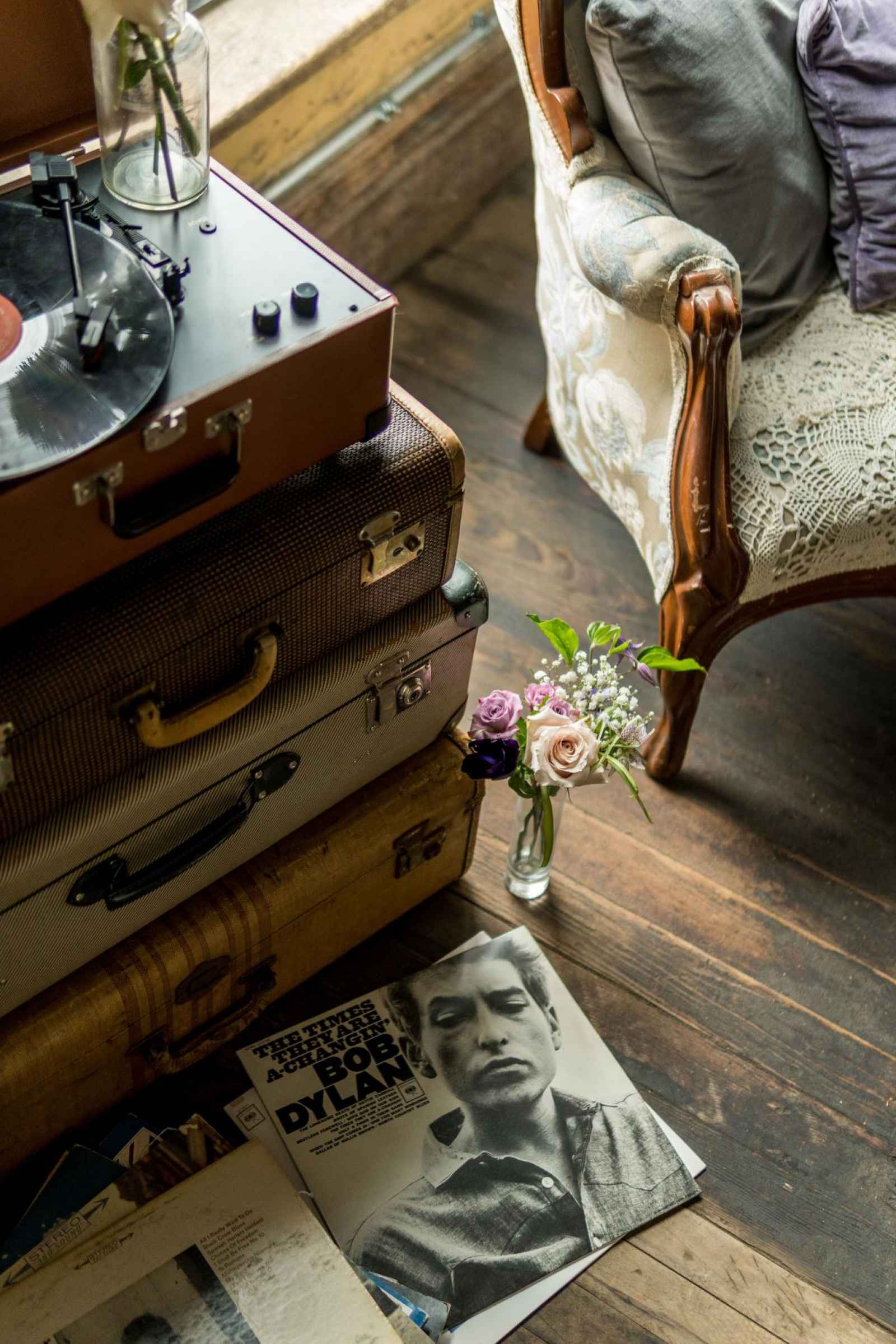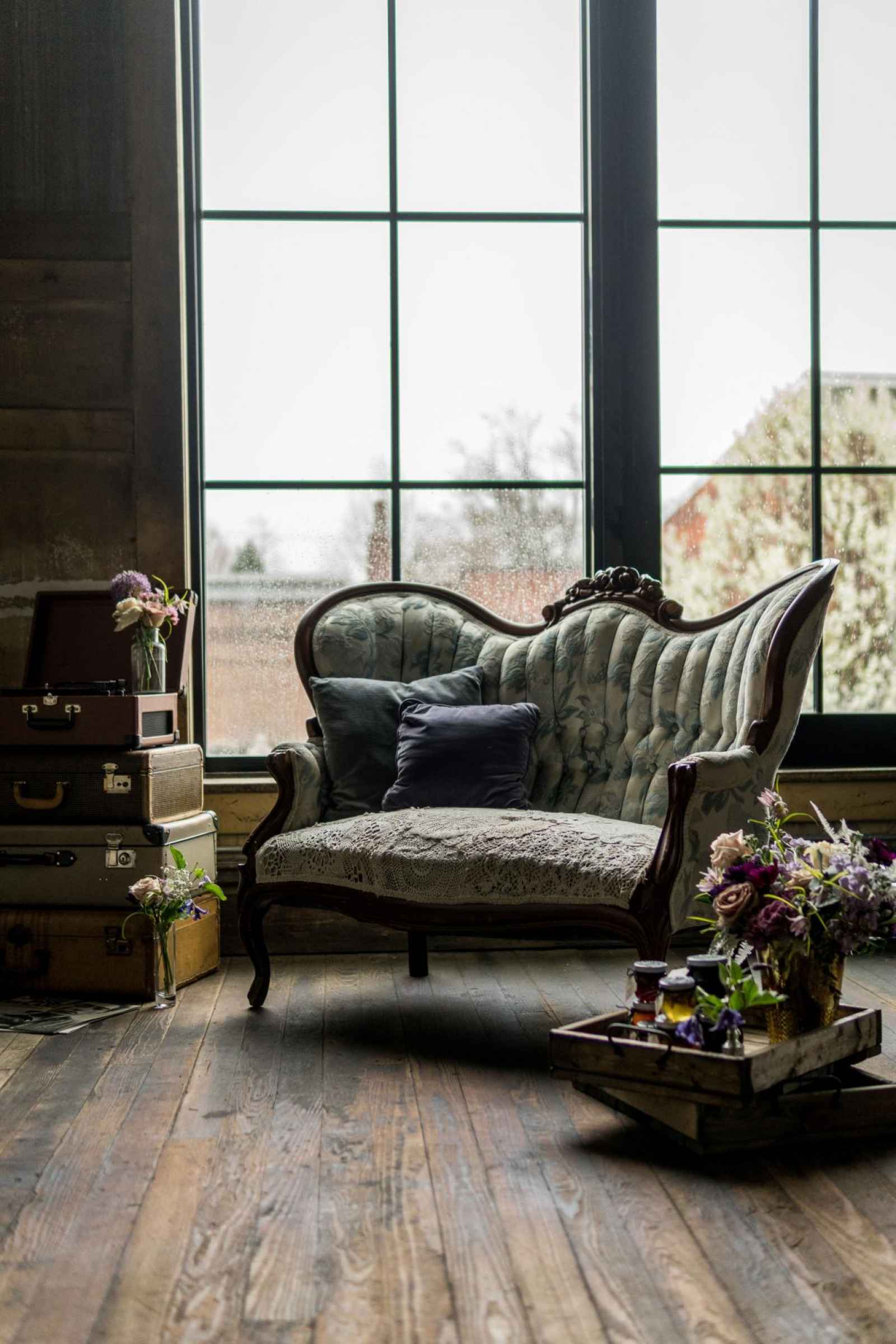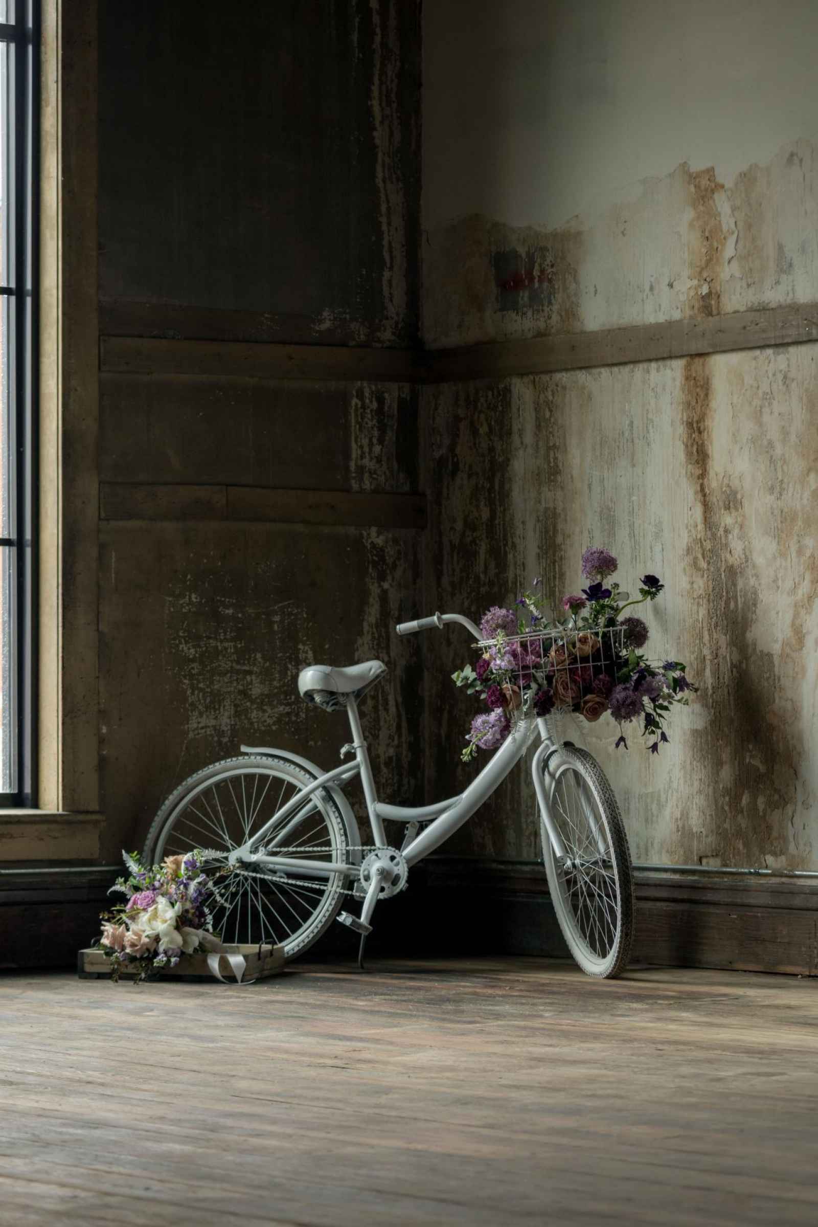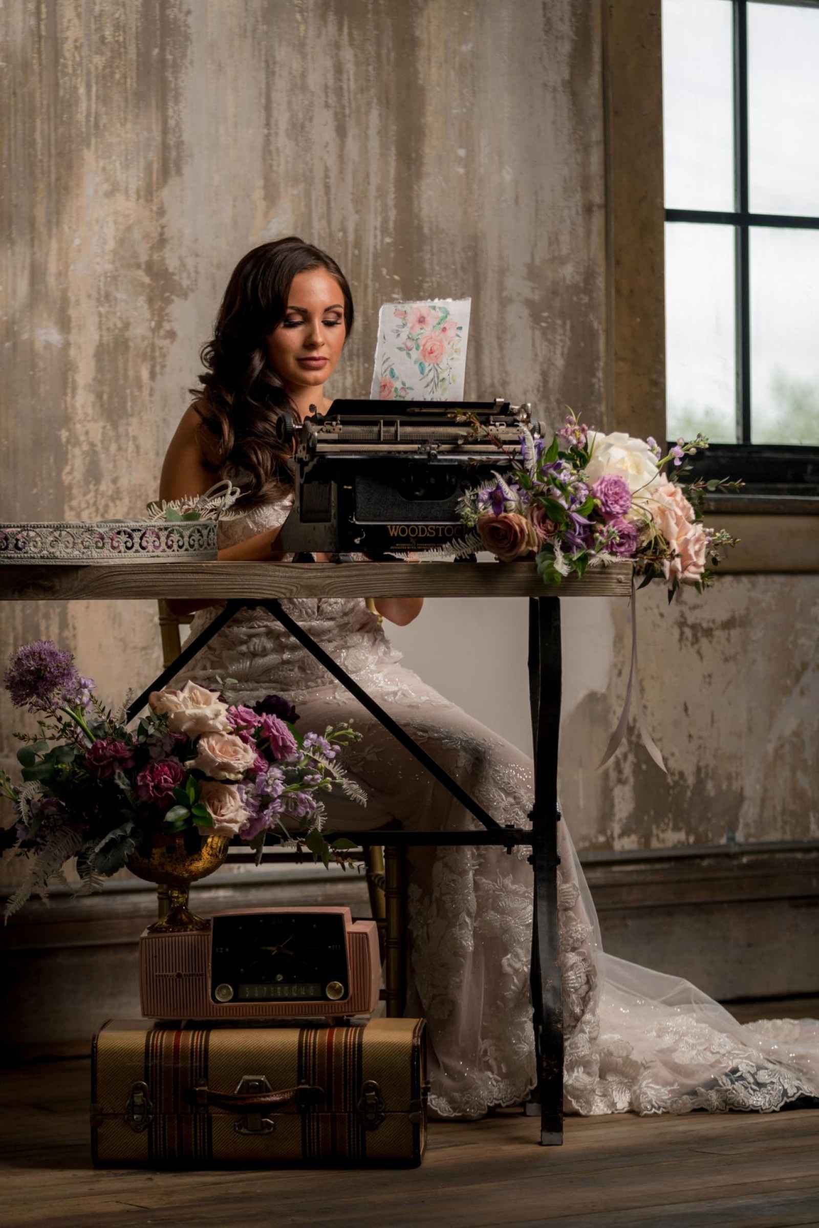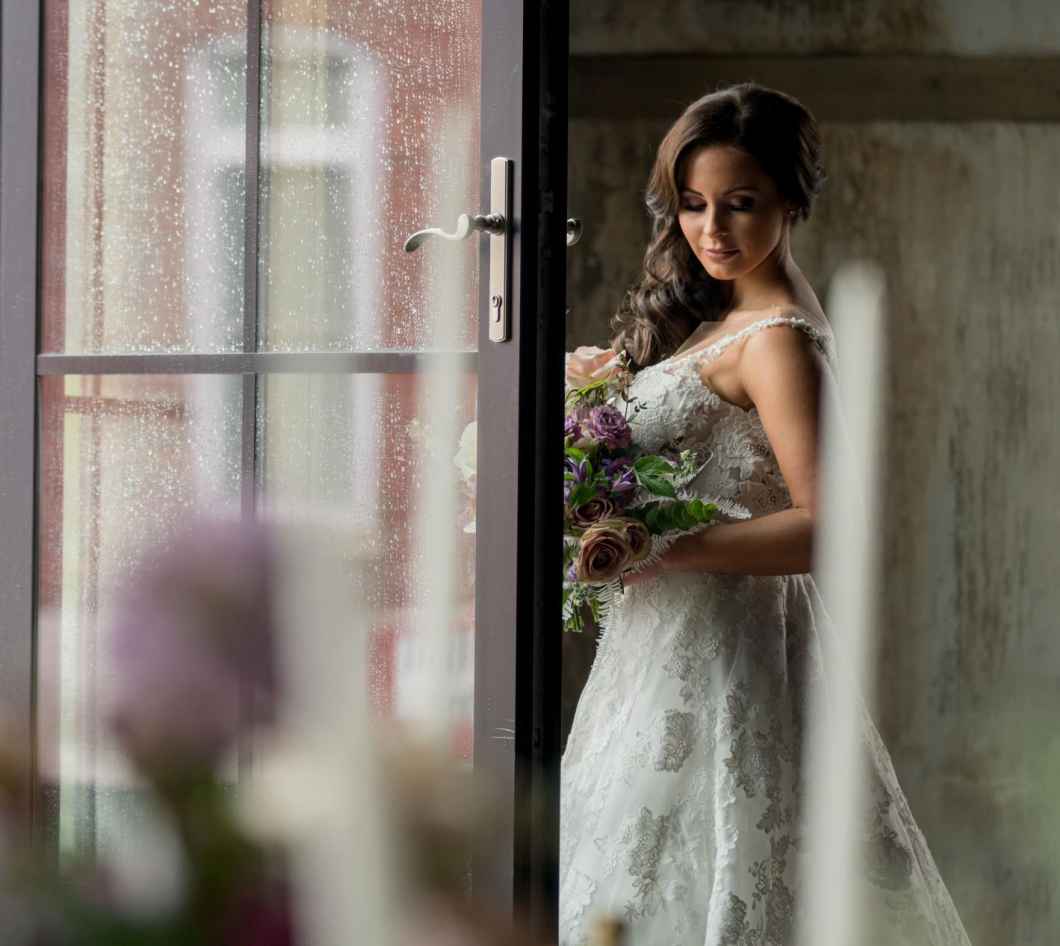 19 North features details like an original, tin ceiling, industrial light fixtures and wood-plank floors. John adds, “19 North offers couples a majestic ceremony space that is turned into a beautiful reception area for dinner and dancing, glassed-in cocktail reception area, built-in bar and a fully appointed bridal suite with a private bathroom any bride will be comfortable in.” Given all the unique highlights of the venue, the team knew they wanted to show off how the space at 19 North delivers modern style with that unmistakable Midwest vibe. The planner for the shoot, Allison Booker of Unveiled Weddings & Events, says, “There were some amazing bones in the structure along with stunning full-length windows. We just couldn’t get enough! We really love blending hard lines of industrial spaces with delicate details to create the perfect ebb and flow.”
