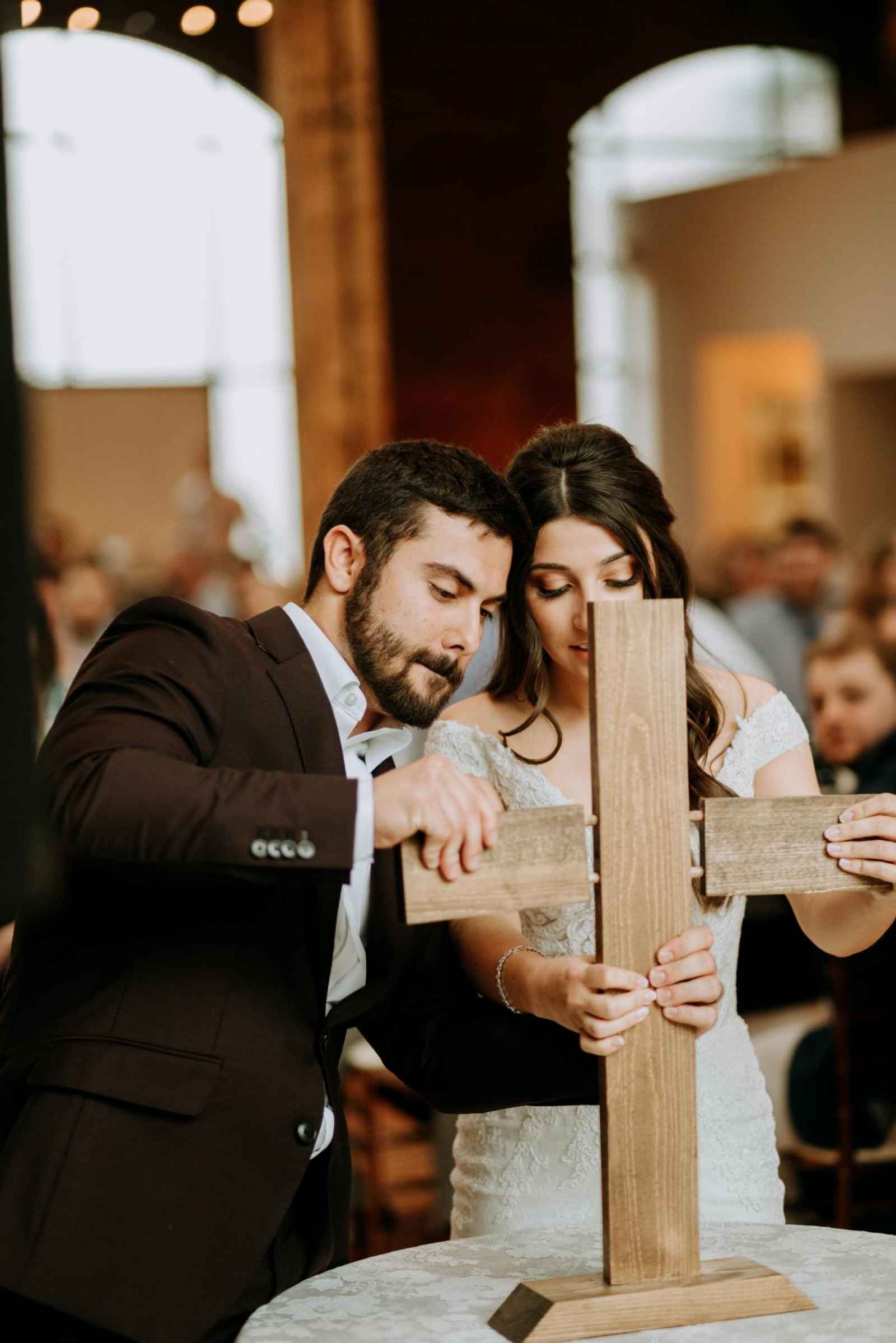 Having all the people Lexi and Brent love in one place was what made the day special. Some rain ruined the chance for their wedding to take place in the courtyard, but the groomsmen and family members saved the day by moving the arch and the unity cross inside for the happy couple.