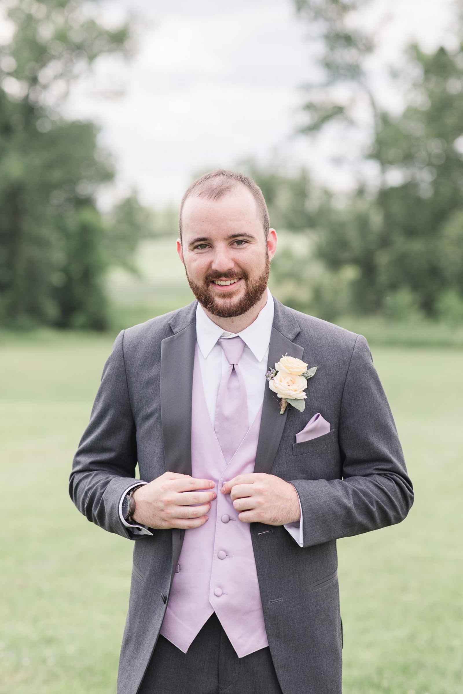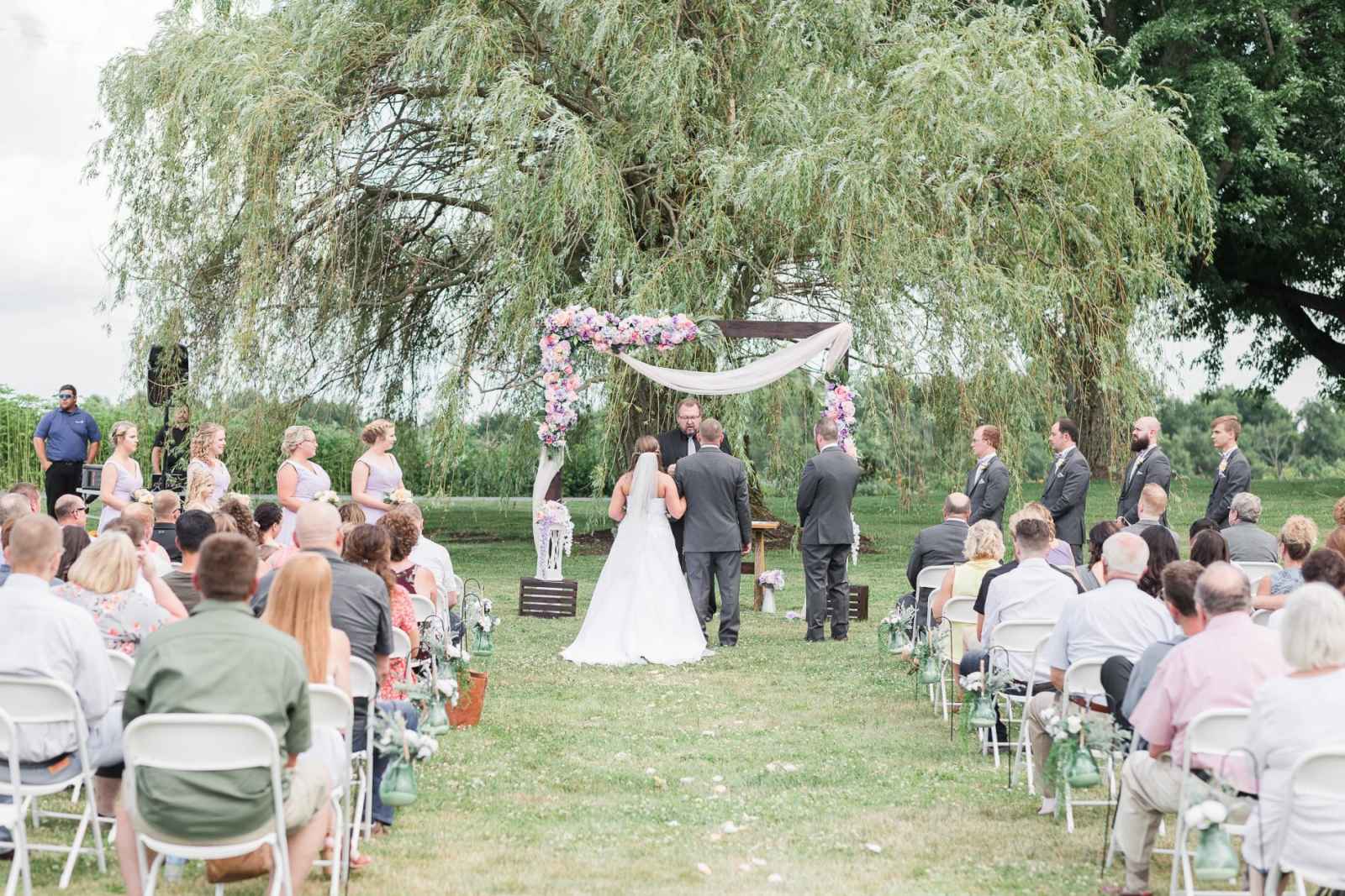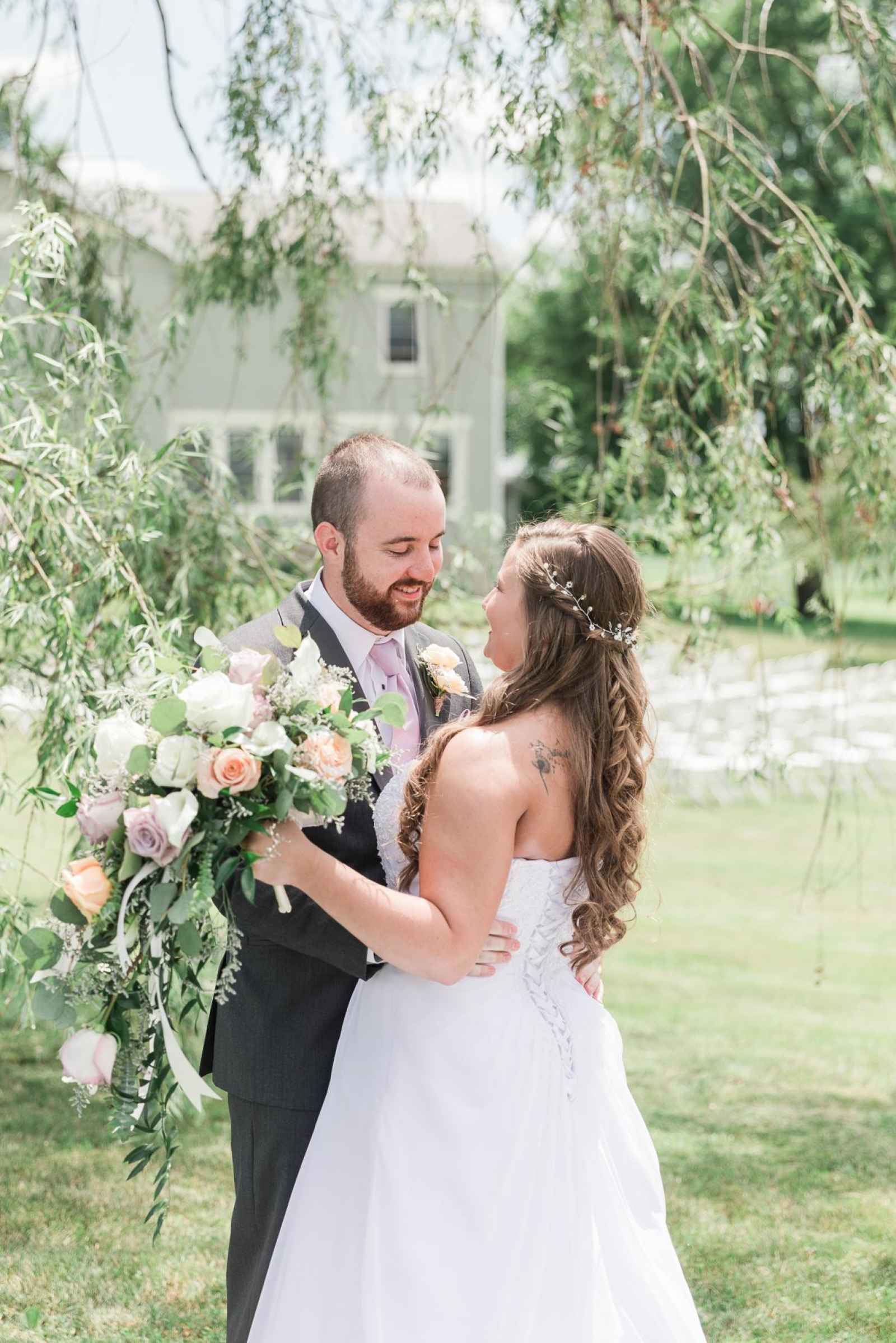 Megan and Matt’s outdoor wedding had all the rustic touches for a true Hoosier barn wedding! The couple added a unique twist to their day by focusing on a spring color palette, using shades of white, lilac and peach. “Lilac is one of my favorite colors and the peach and white accented very well,” Megan says.