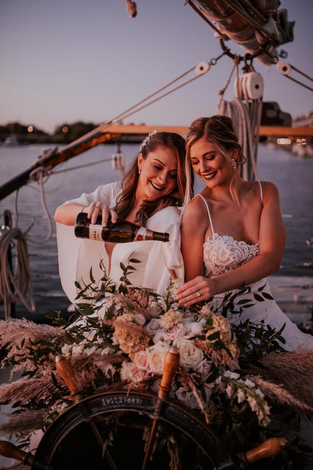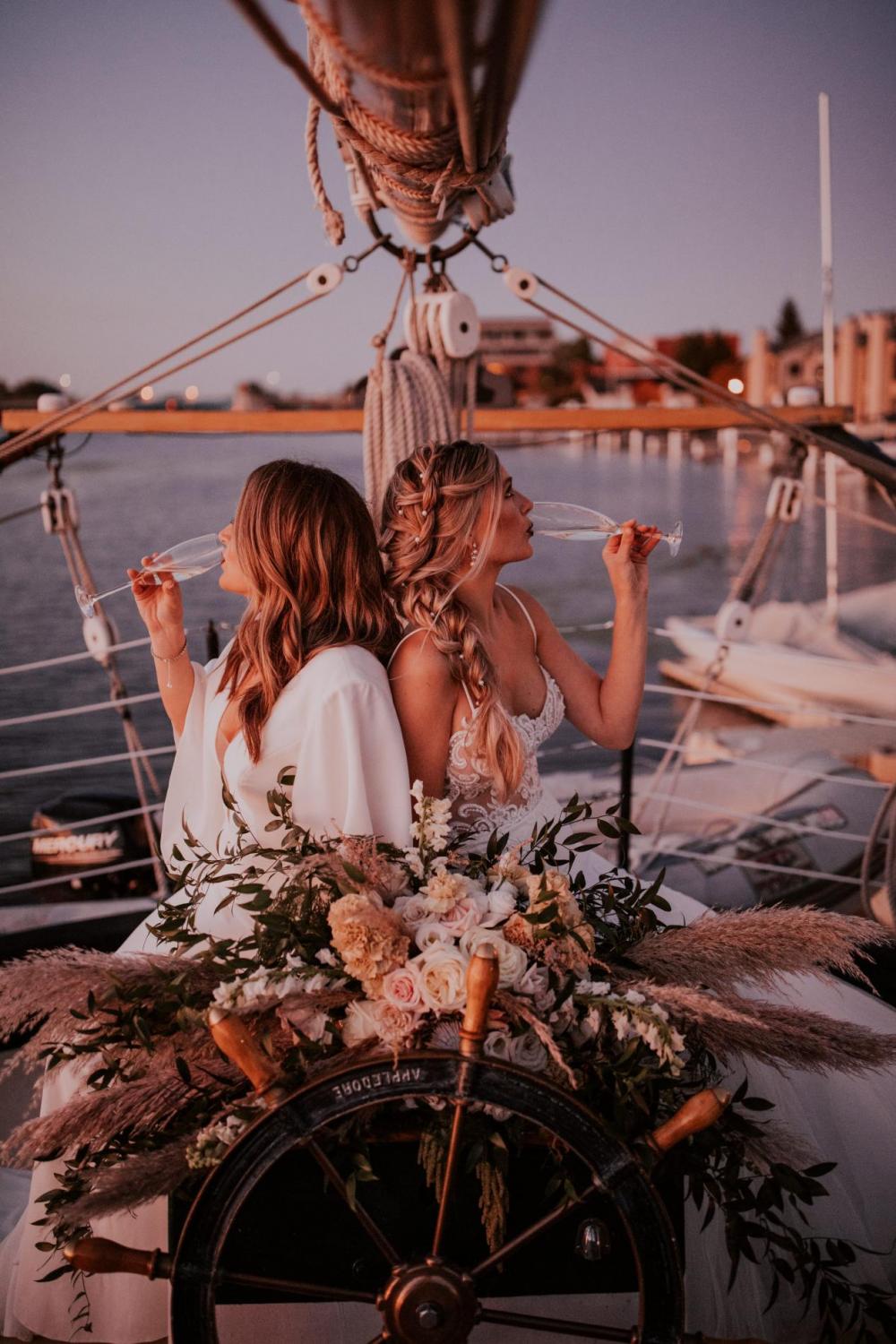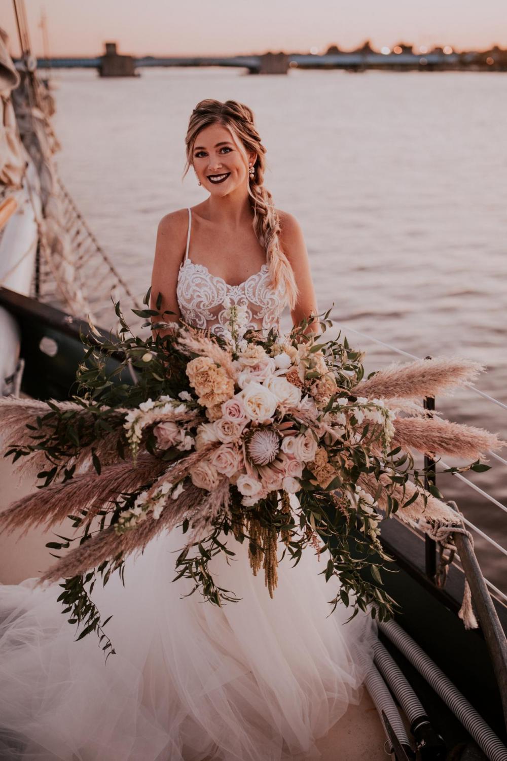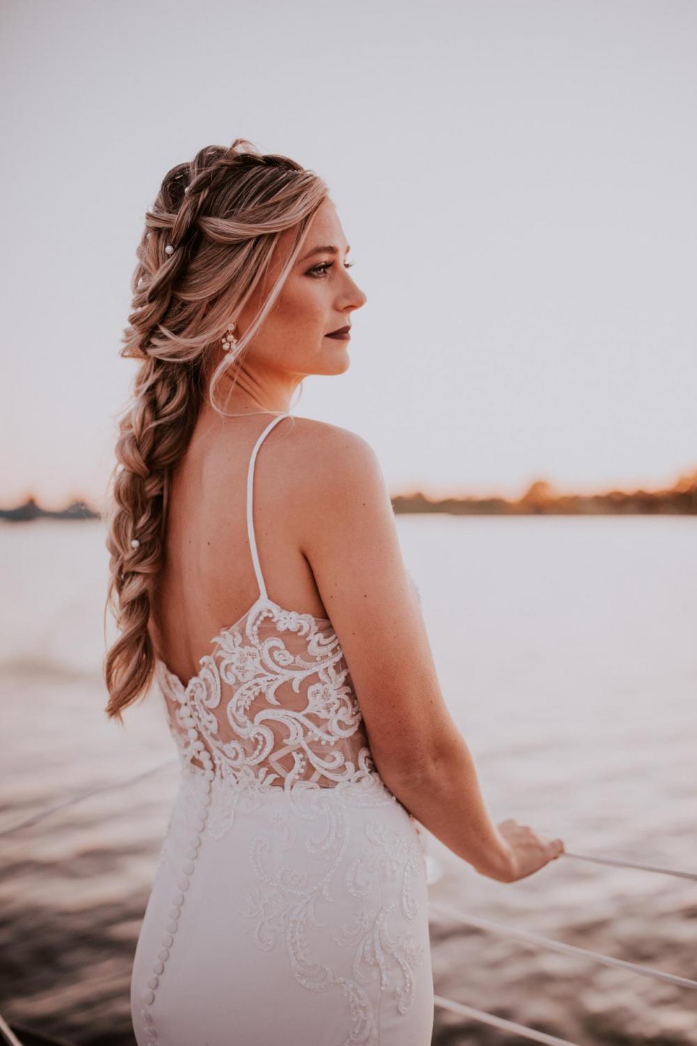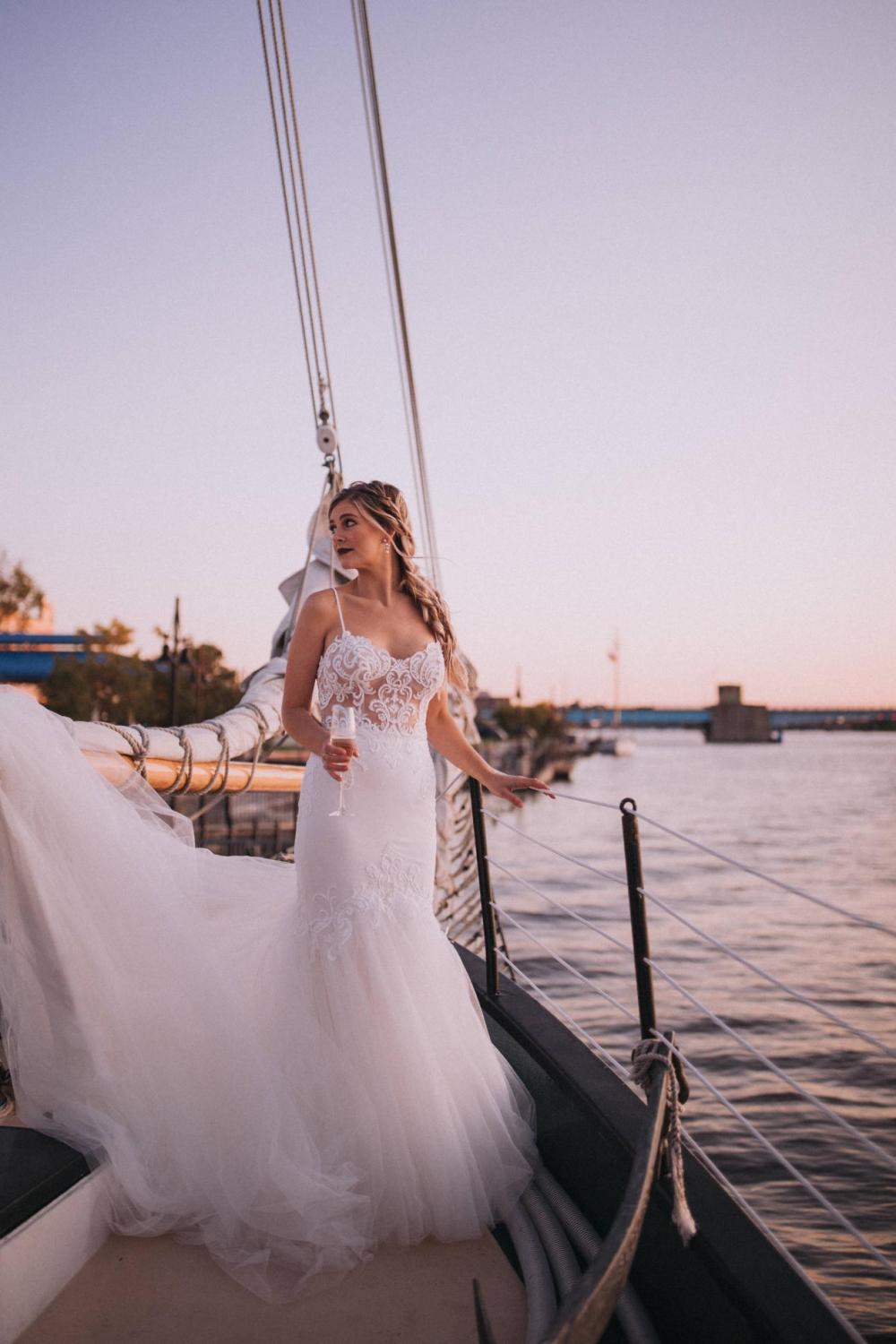 We’re ready to sail away into the sunset with this dreamy sailboat style shoot! The idea to have a romantic shoot on the water came from Kelsey of Glam Squad Elite and Megan with Megan Phillips Hair Artistry. Pairing with Mallory of Mallory Mae Photography, this stunning shoot will have you ready to sail into paradise! “The idea of a bride on a sailboat sounded beautiful to me,” says Mallory.
