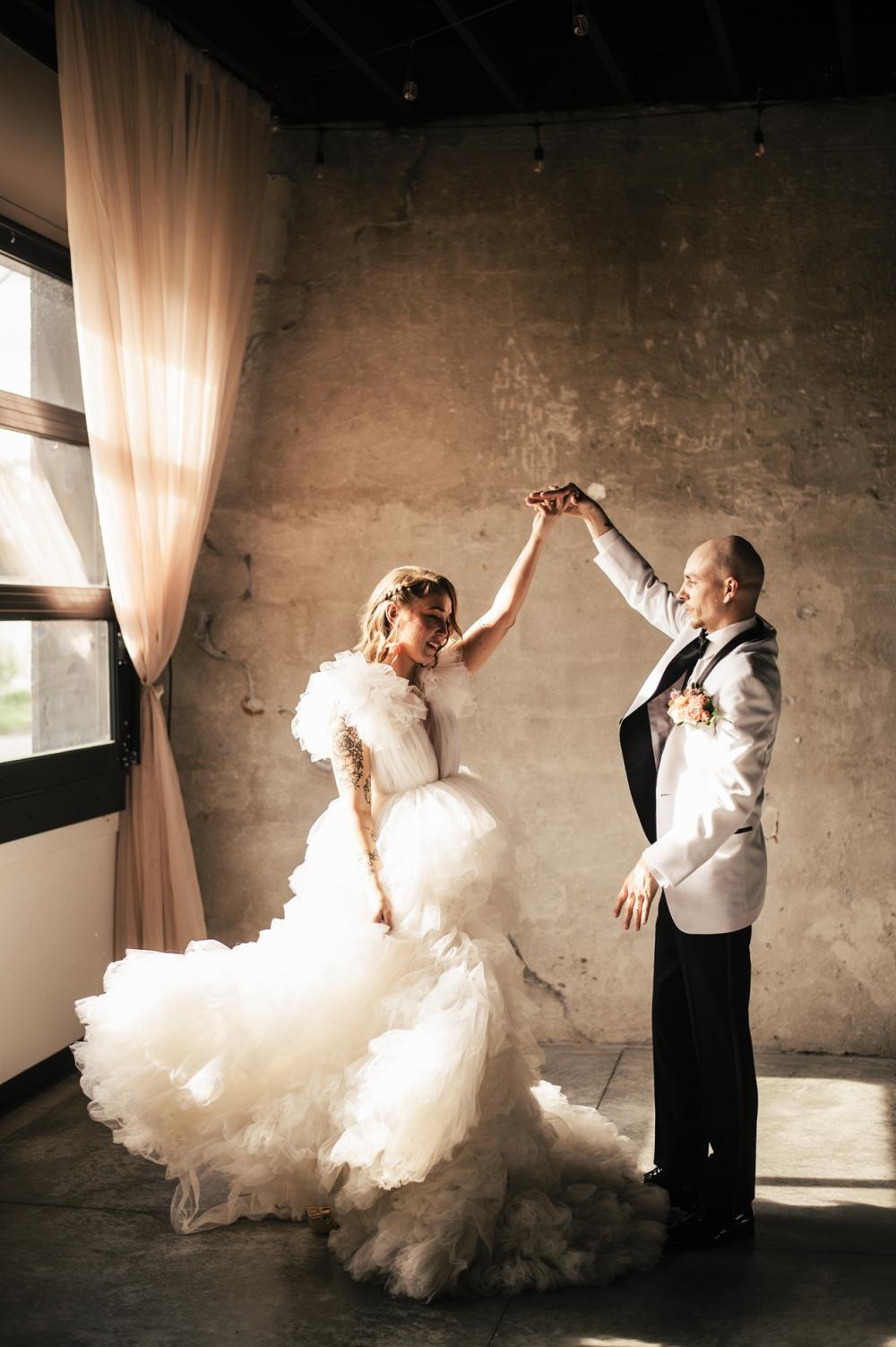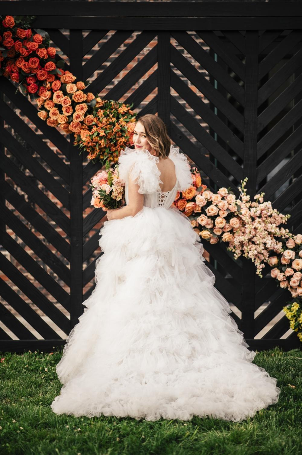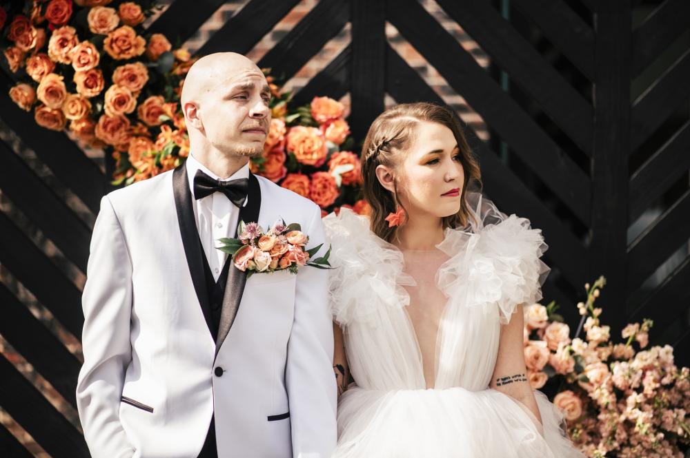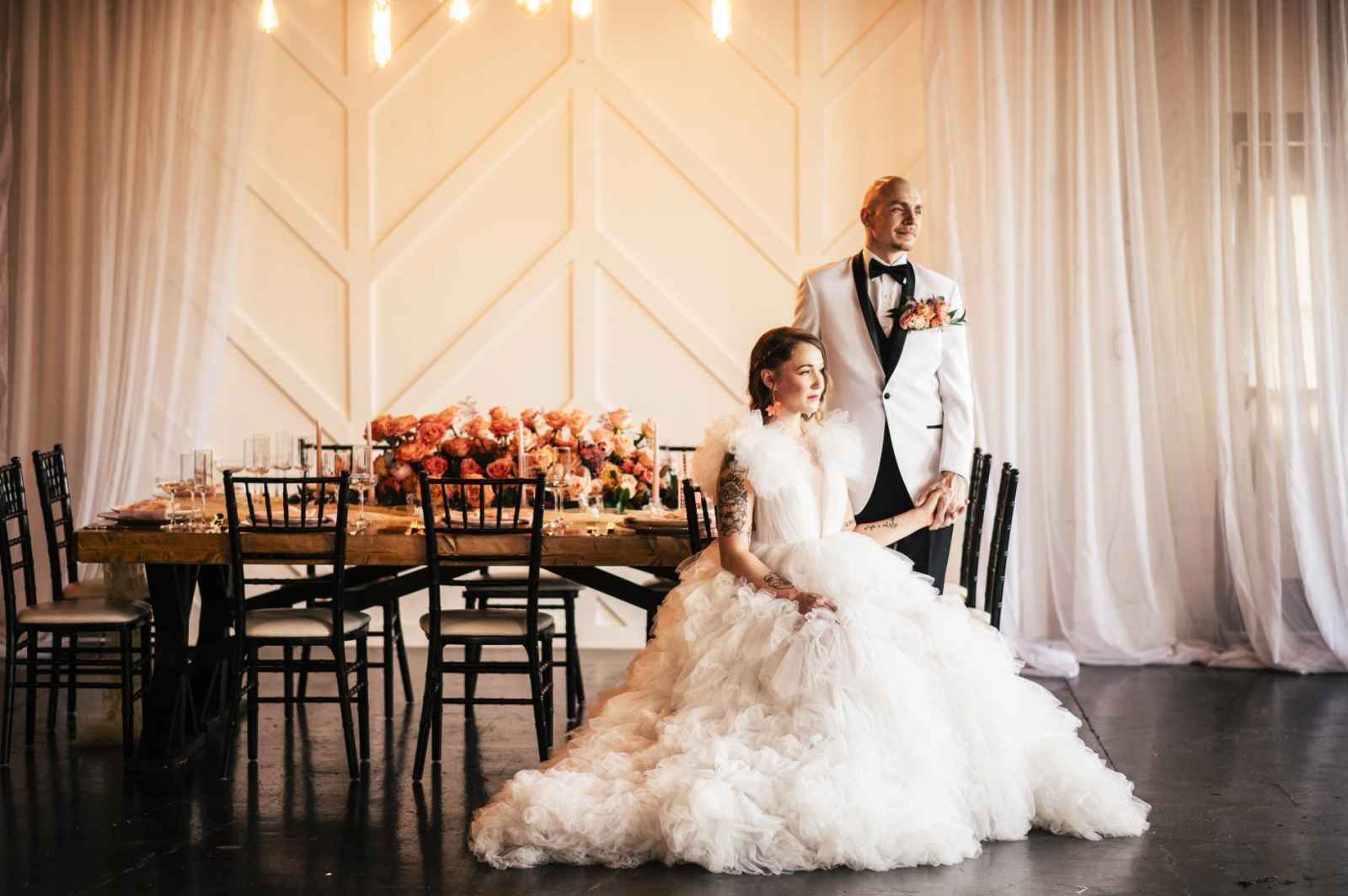 Much of this style shoot was actually based around the bride's beautiful dress! Since it was voluminous and airy, the creative team wanted something that was a bit over-the-top and out-of-the-box for this shoot. It's also a very modern style of dress, so the team needed to create a space that highlighted that feature. To complement the gown, the hairstylist decided to style the bride's hair in simple waves with a delicate braid since the dress was already so extravagant. The makeup artist also brought in sunset tones in her makeup. As for the non-traditional style of wedding, that was inspired by the couple. "Our couple also has a more edgy fashion sense so we wanted to go for a look that was a bit more outside the box than traditional," Beth explains. We think it turned out just perfect!