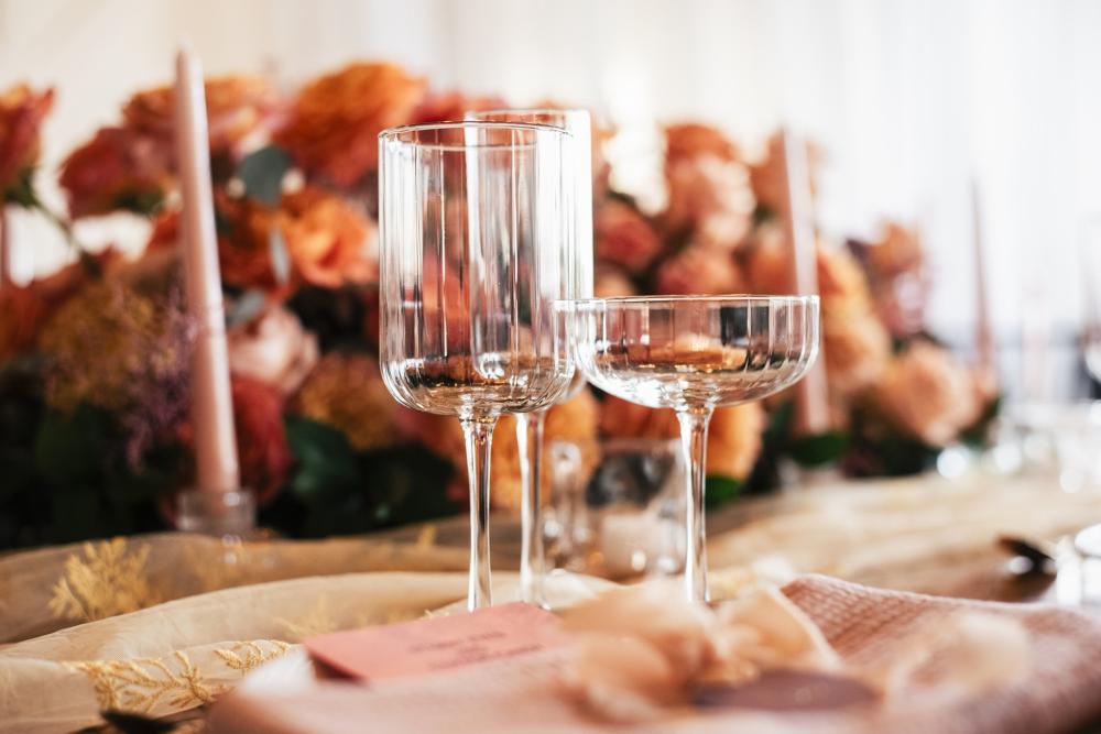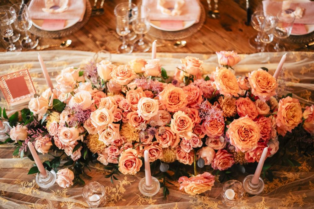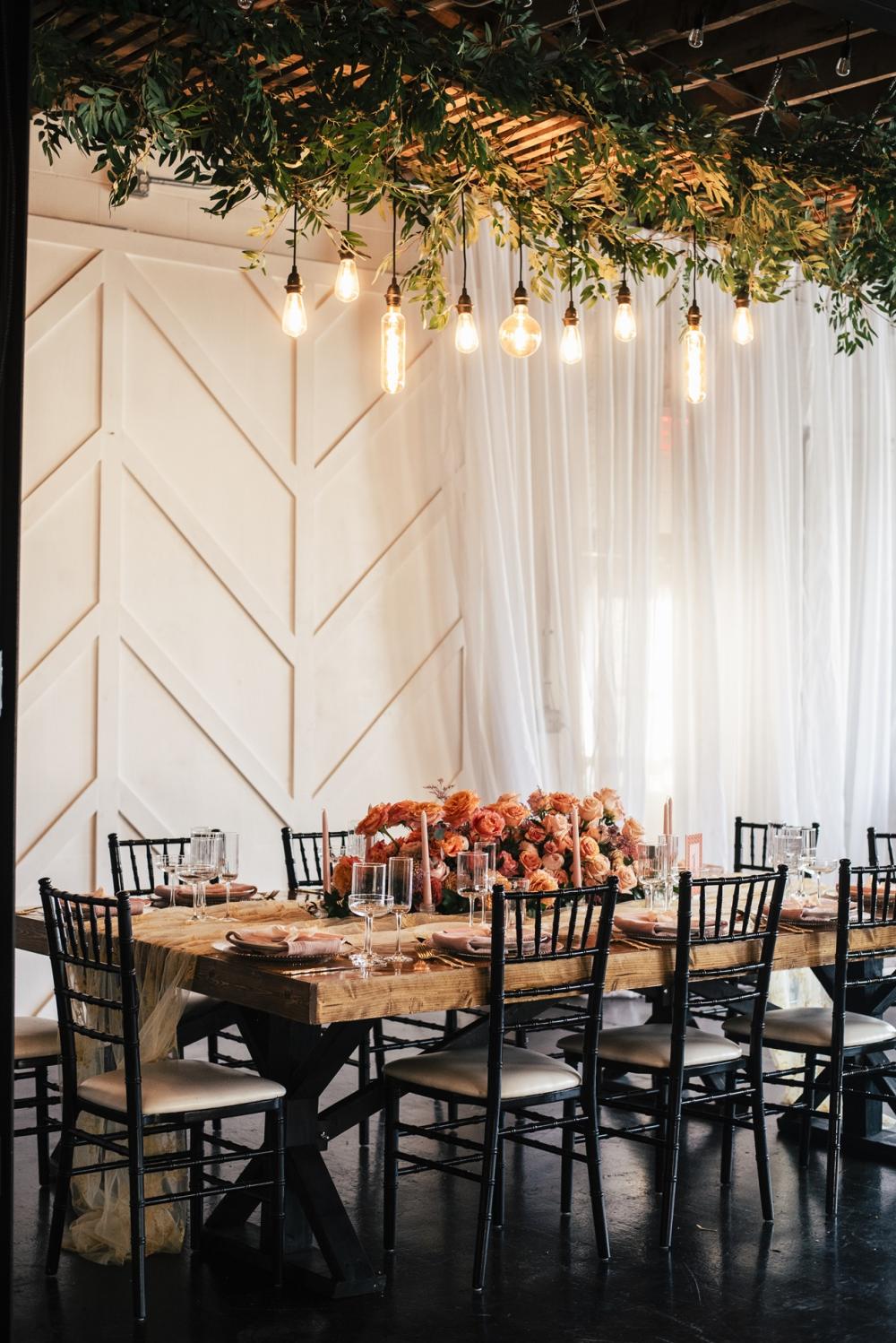 As for rentals, the team used mostly modern designs to fill the reception space. Of course, the tablescape features plenty of blooms as the centerpiece! It also included tons of luxurious and colorful items to reinforce the luxe sunset theme. Some of our favorite details are the unique pieces of glassware and the candles that both work to elevate the feel of this scene. The plates that the team chose could not be more perfect since they remind us of sun rays! We also love the choice of gold flatware to reflect the sun palette. Off-setting the bright colors with black chairs balanced the shoot while also giving a nod to the edginess of the couple.