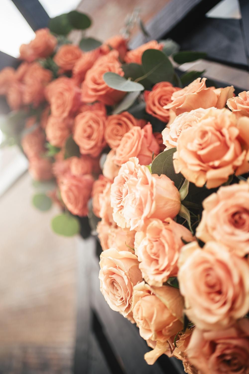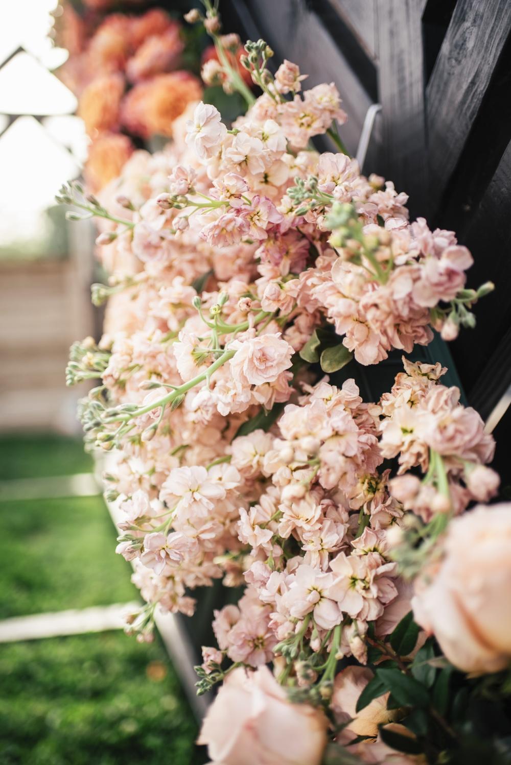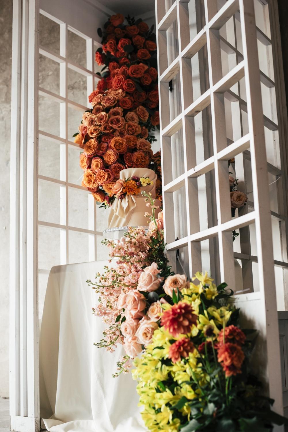 Slightly inspired by the Pantone Color of the Year, Peach Fuzz—which is a great color to reflect the sunset theme of this shoot—the team included so many peach details, especially in the flowers. Beth, owner of Flora + Flame, gushes, "We used a large variation of sunset tones of roses with Peach shimmer and Free Spirit roses (my personal favorite). We mixed those in with some varying textures of snapdragons and stock flower for an ultra fragrant mixture." We can only imagine how wonderful this ceremony space must have smelled! We also love how the team used a similar floral pattern to highlight that delicious, statue-inspired cake as they did as a backdrop in the ceremony space.