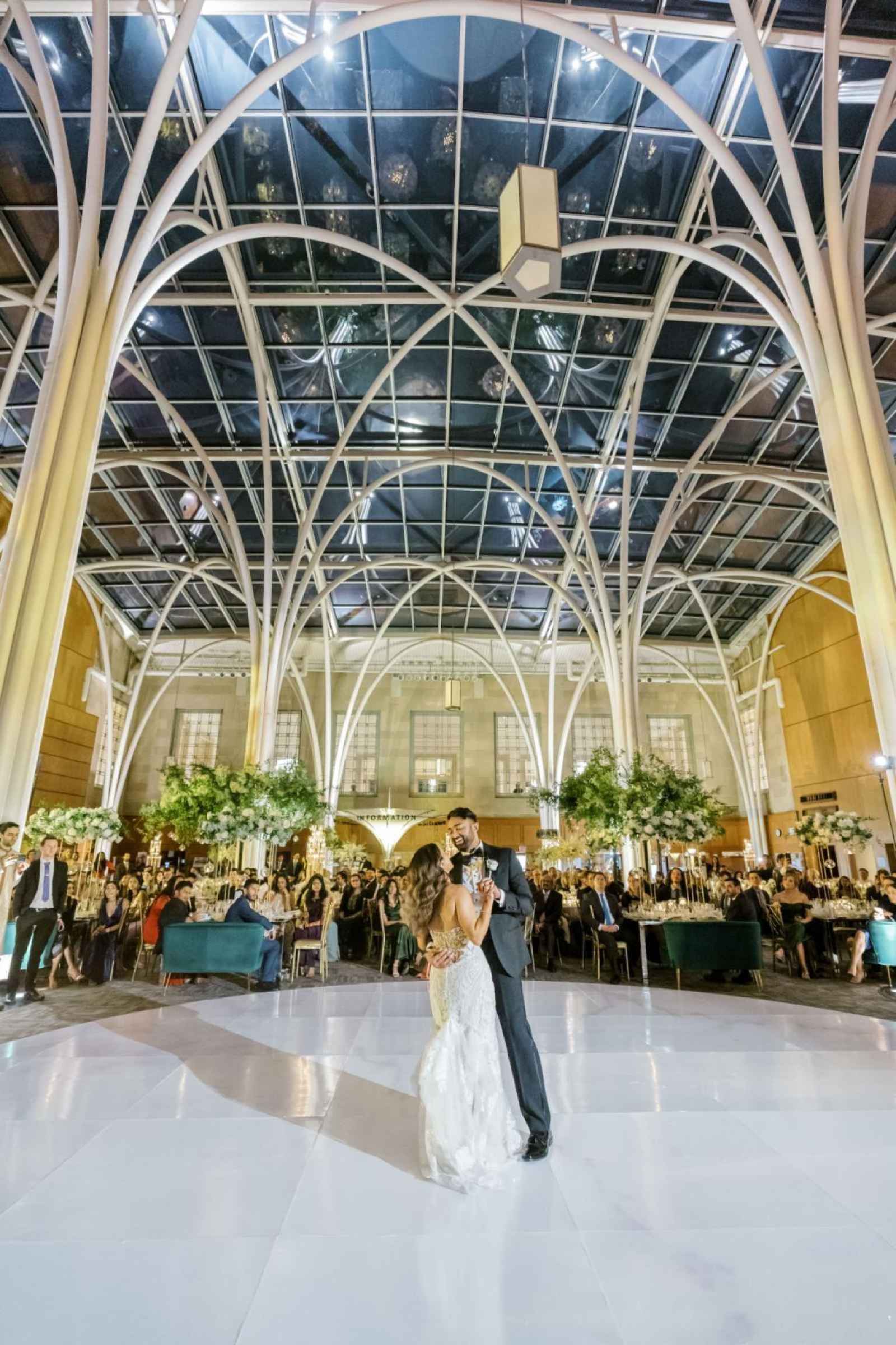 For those leaning into timeless elegance, the Simon Reading Room is a stunning space lined with white oak-paneled walls and framed by dual marble staircases. It’s a classic example of architectural grandeur, offering a sophisticated atmosphere for ceremonies, cocktail hours or smaller receptions. The room holds up to 350 for social events and 120 to 140 for seated receptions depending on whether a dance floor is included. The room includes all the same amenities as the Atrium, plus up to 250 ceremony chairs at no additional cost!