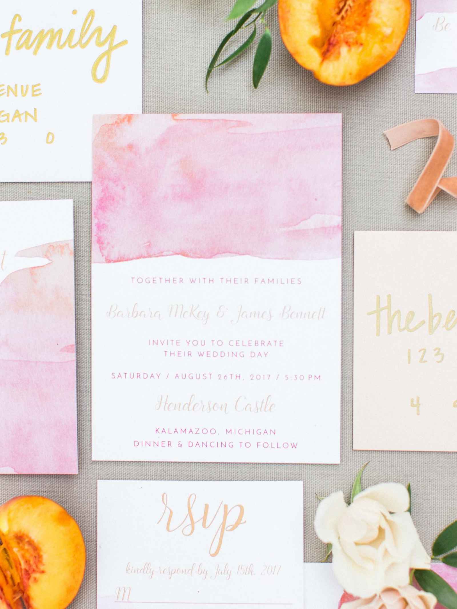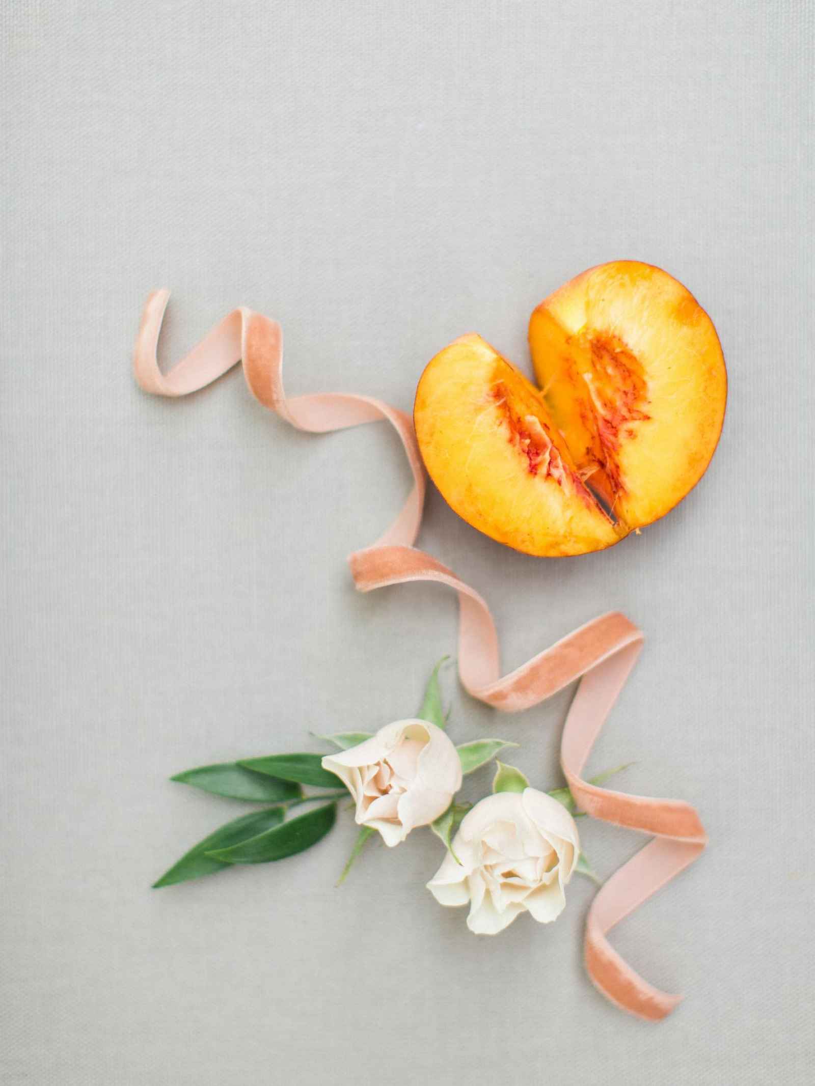 While we had more than enough inspiration to start with, one element we really loved served to shape the overall look and feel. “Peaches really led the theme,” says Nicole Marsh of Compose Events, our talented planner that brought this beautiful vision to life. “When you think of a Michigan summer, you think of fruits—peaches and cherries. We worked hard to find the perfect balance between pops of color, white space and creating an elegant look.”