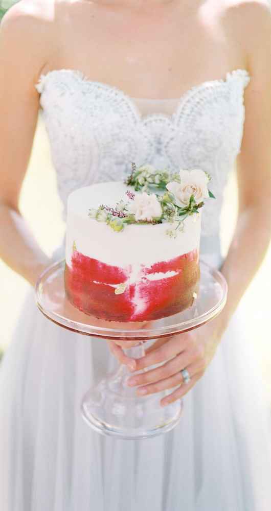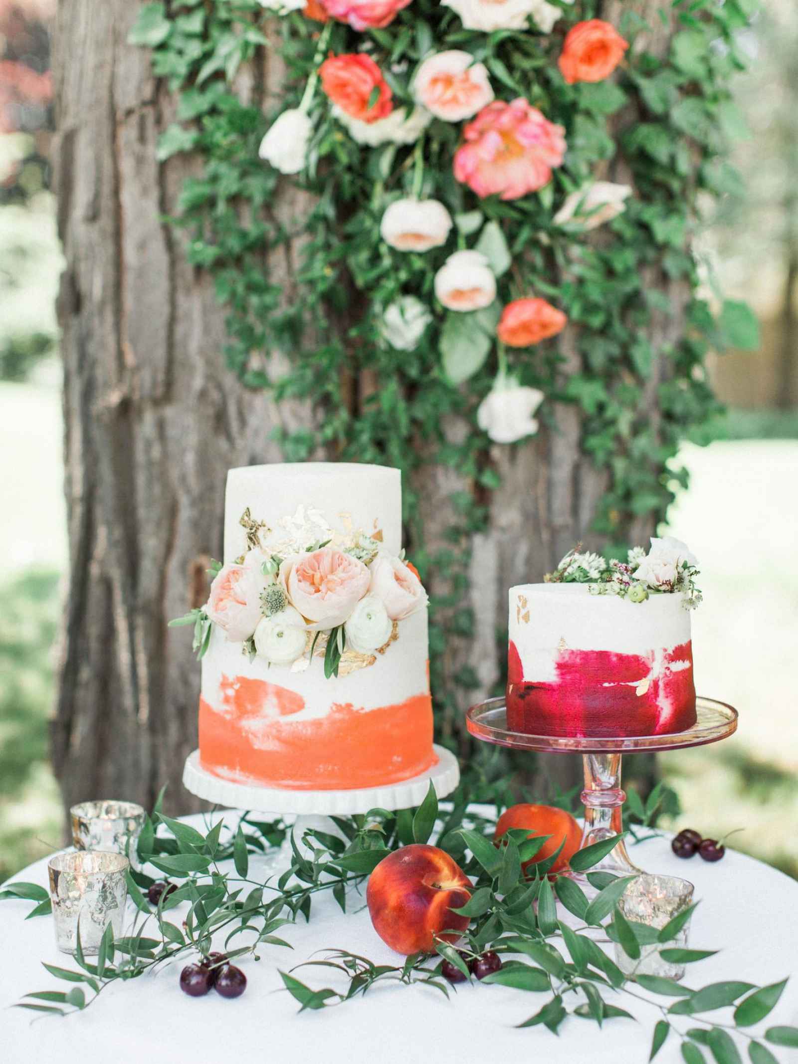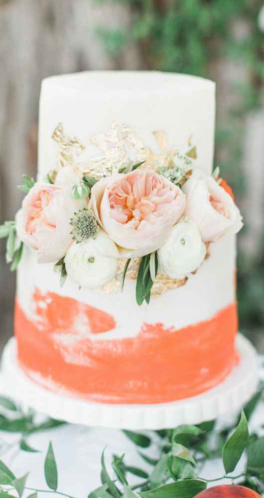 “As with everything else in the shoot, we asked Wildflour Cakes + Pastries to incorporate our peach led theme and supporting colors of burgundy and gold,” says Nicole. The elegant feel was achieved by keeping the base of the cake white. Colorful floral touches that mirrored the bouquet and centerpiece designs added just the right amount of delicate detail and color.