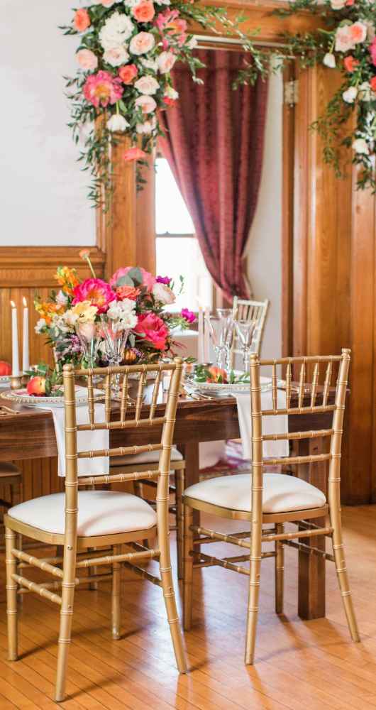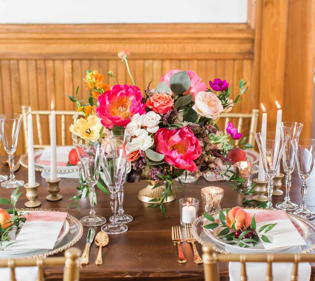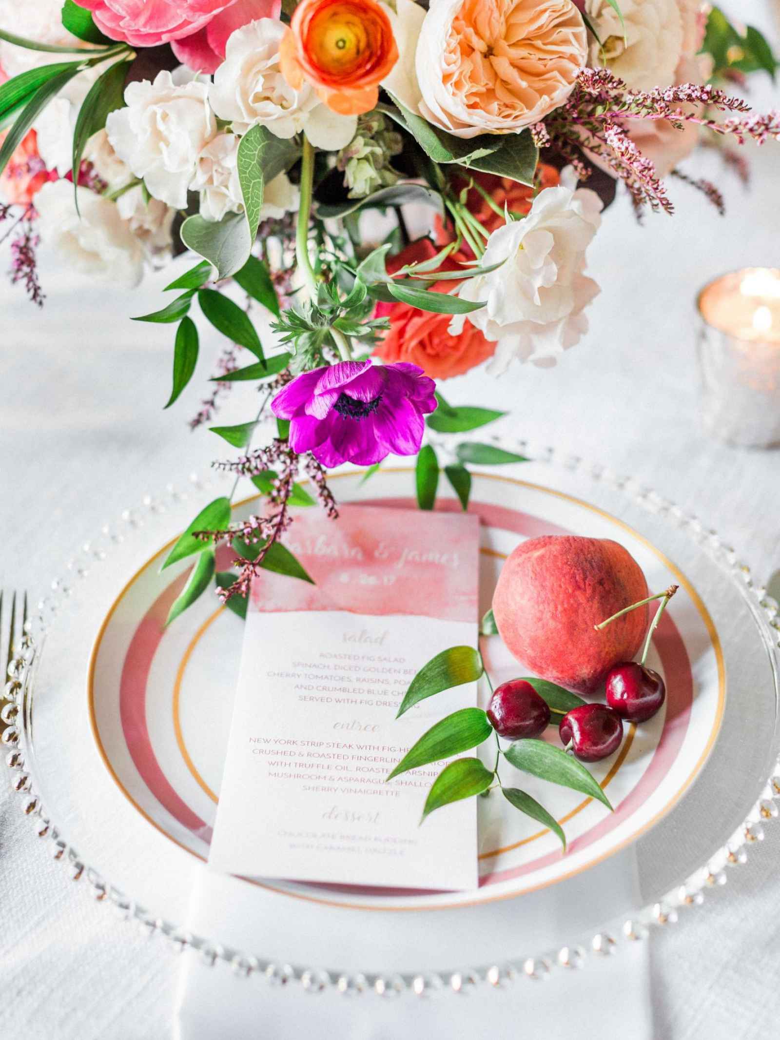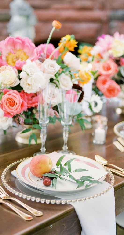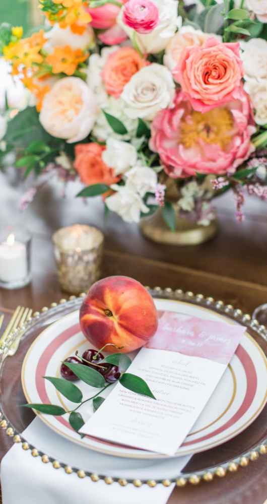 Simplicity set the stage for our tablescape in order to let the sweet peaches, cherries and gorgeous paper goods and florals take center focus. “The gold silverware was the perfect touch to pull the chiavari chairs towards the floral arrangements,” says Nicole.