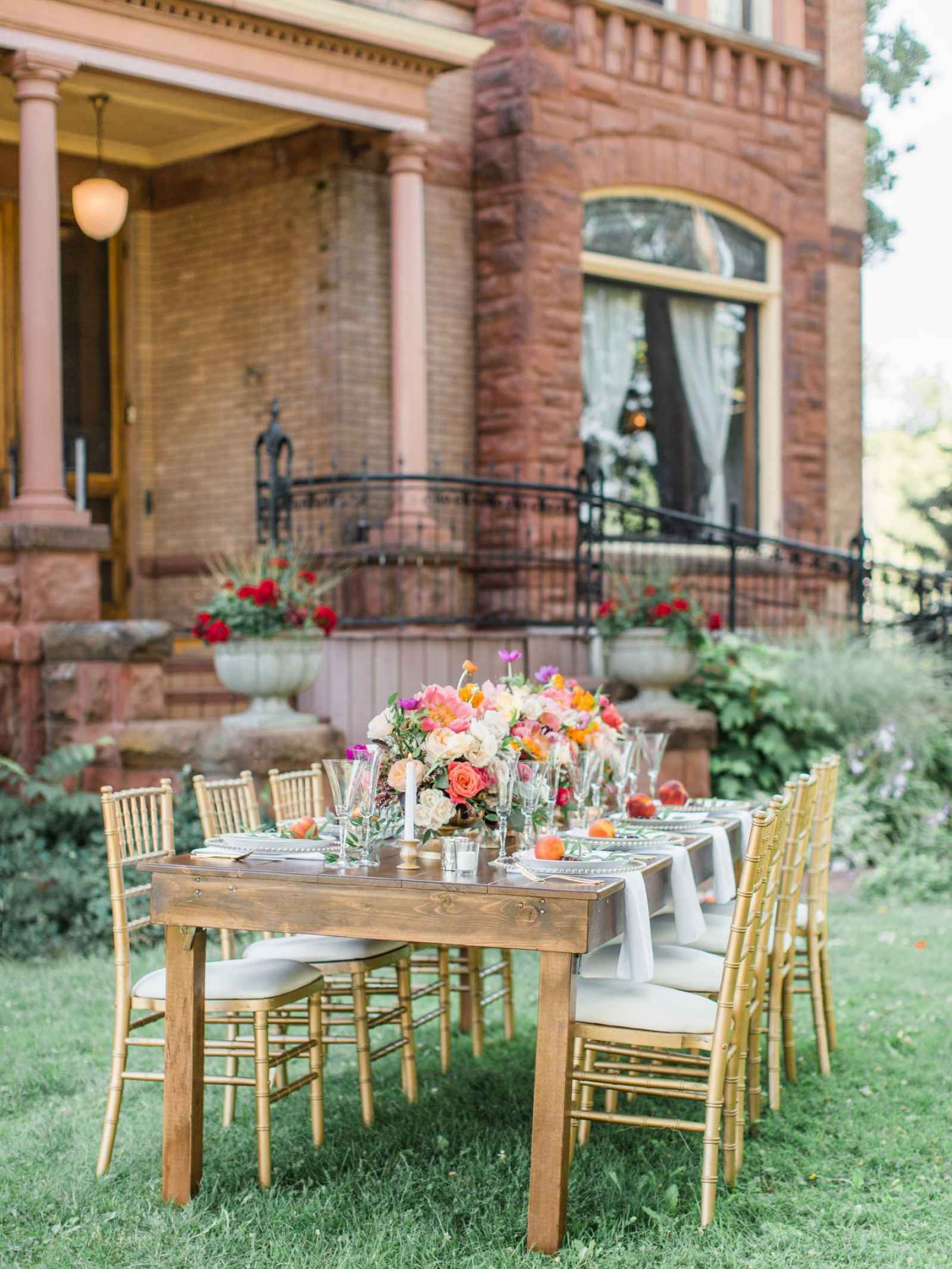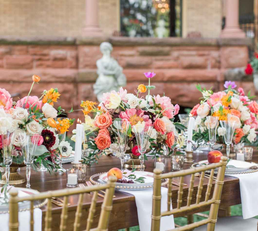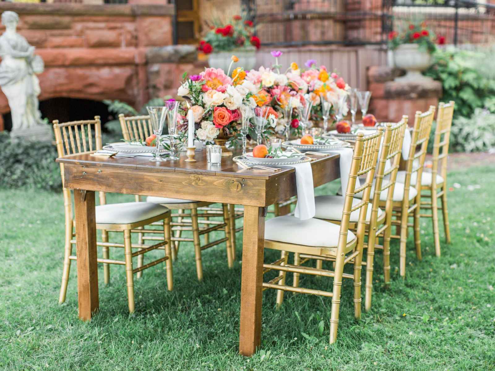Simplicity set the stage for our tablescape in order to let the sweet peaches, cherries and gorgeous paper goods and florals take center focus. “The gold silverware was the perfect touch to pull the chiavari chairs towards the floral arrangements,” says Nicole.
