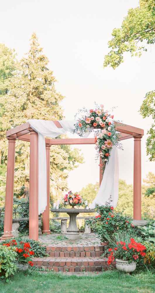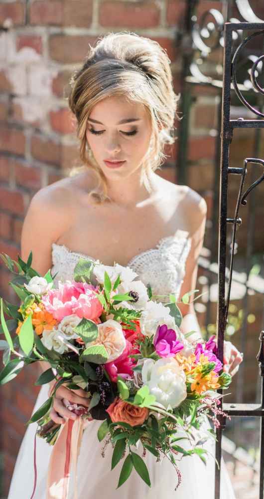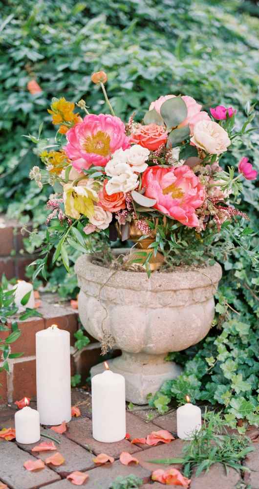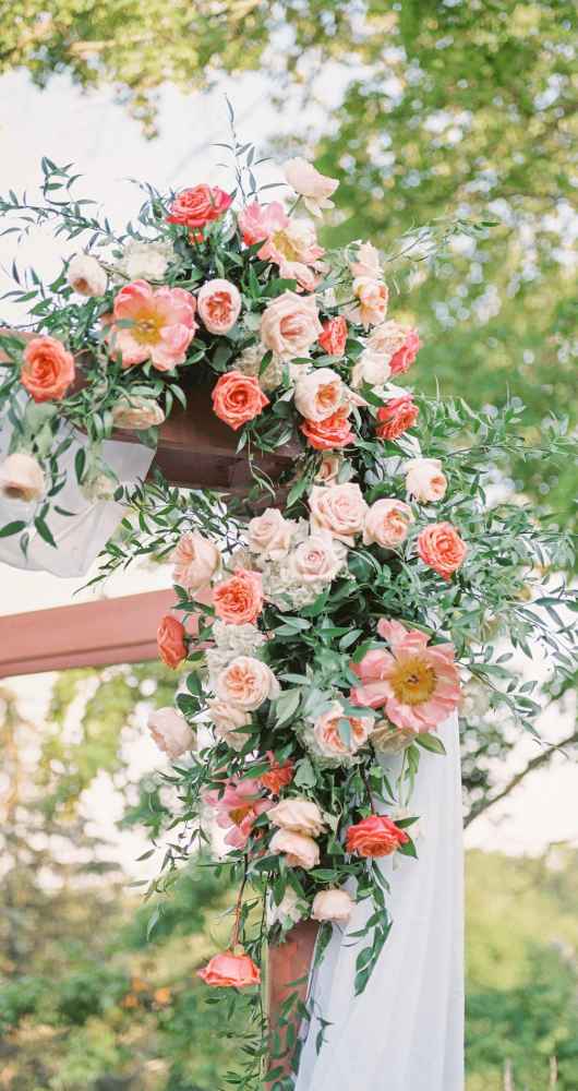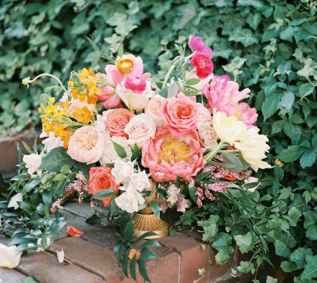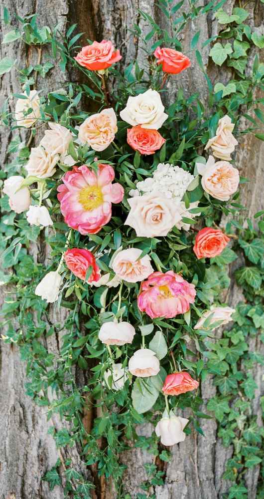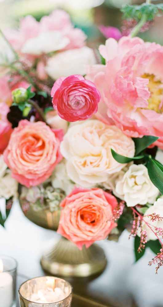 Because we were working with so many vivid colors, we really had a blast incorporating so many different textures and tones in the flowers!” says Leah Bayes of West View Florist. ”The Coral Charm Peonies and peach David Austin garden roses were the focal flowers, while the orange Star of Bethlehem and hot pink Anemones added a punch of color,” explains Leah. The breathtaking arrangements were softened using pale pink Quicksand roses and white Majolica spray roses. Greenery was also a must-have. Trailing greenery and other unique blooms tied the elegant garden look together beautifully.