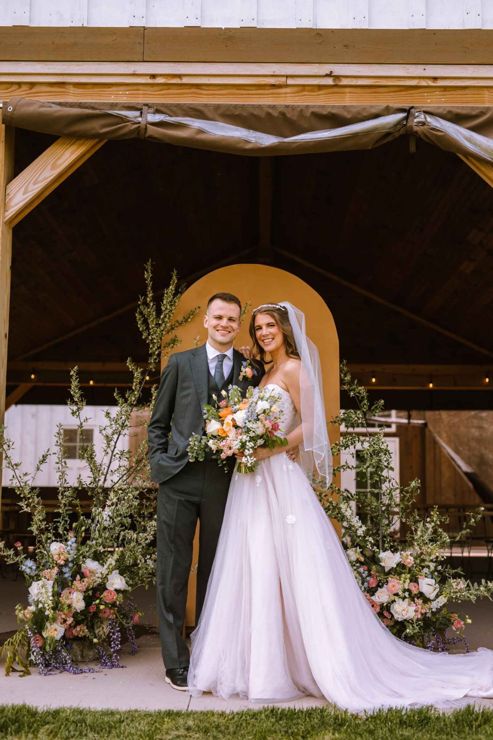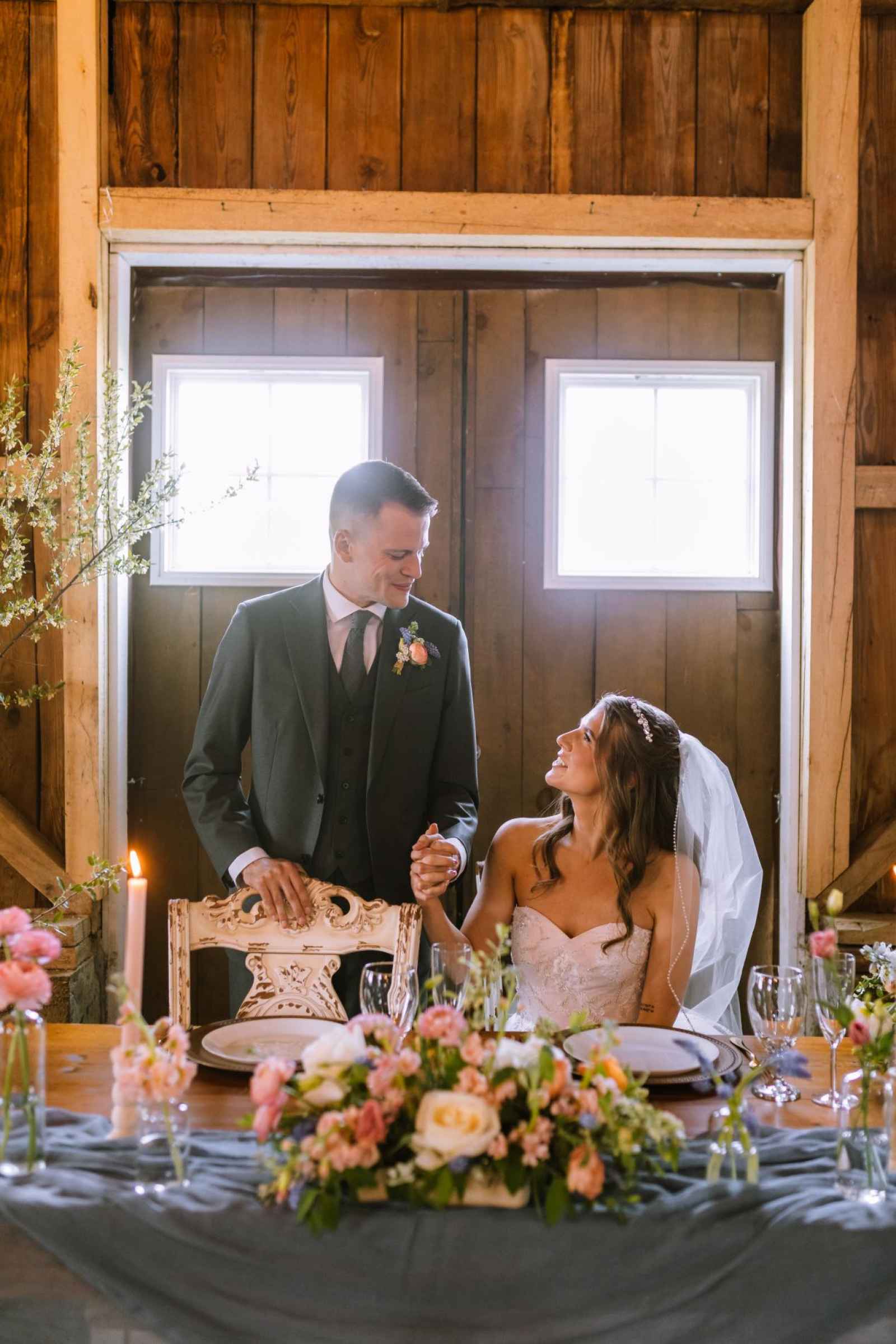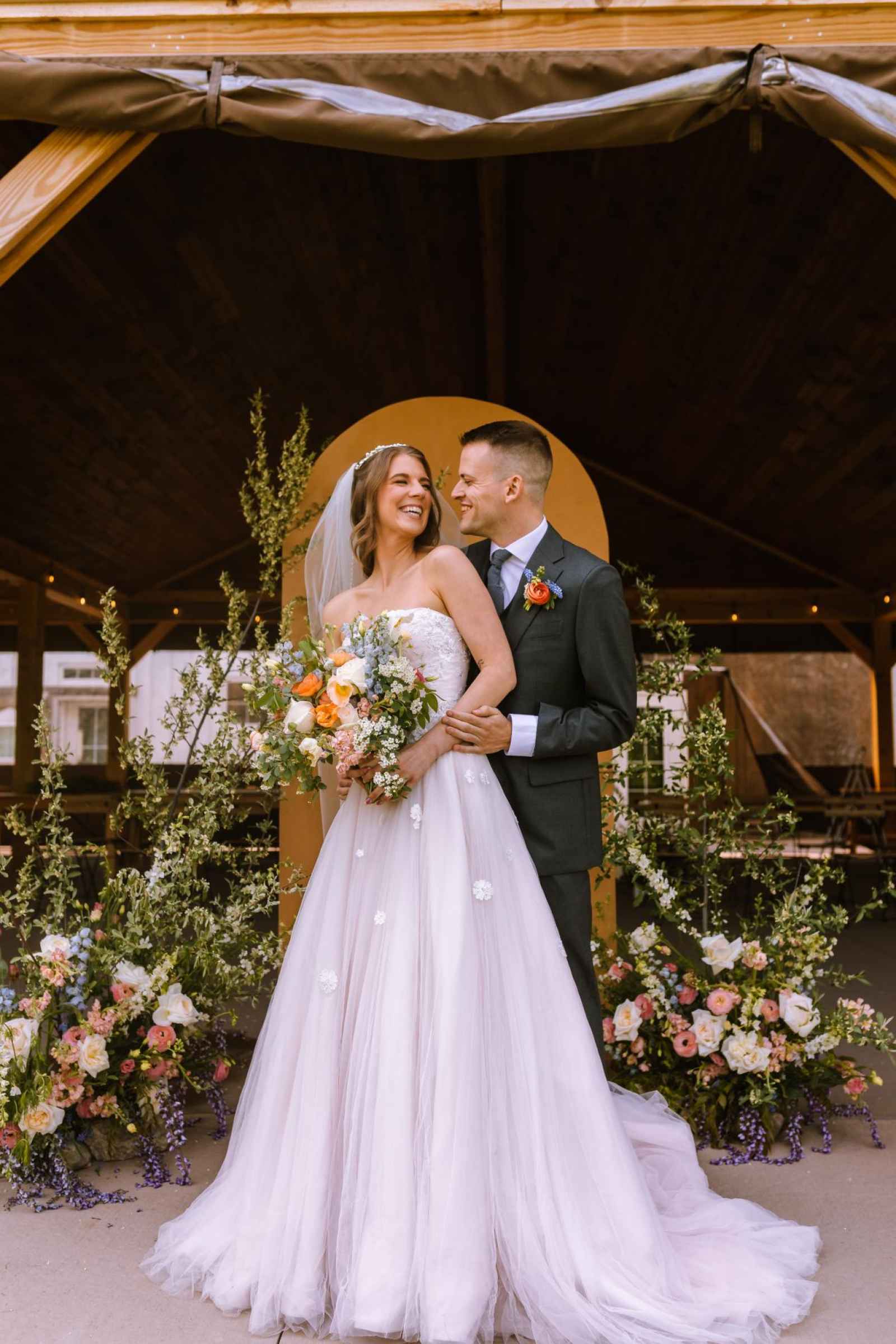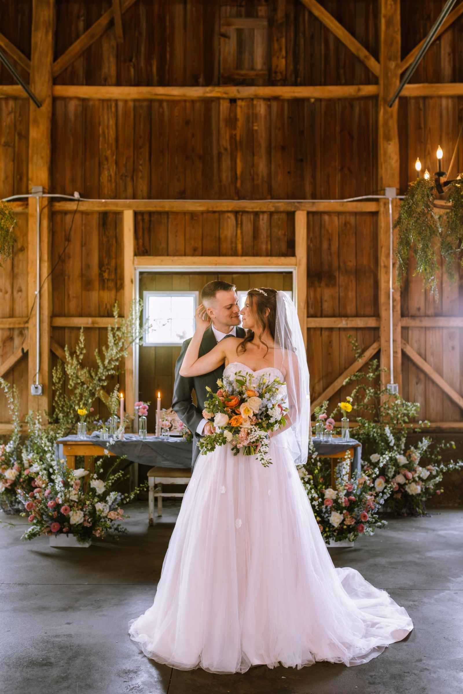 The model's dress from Becker's Bridal was an absolute showstopper! Its strapless design and flowing silhouette added a touch of enchantment to the look, while the cascading floral appliqués gave a nod to the garden theme. The talented team at The Pretty Committee worked their magic, styling our model's hair in a effortlessly chic half-up hairstyle, accented with loose, cascading curls that delicately framed her face. The look exuded a relaxed and romantic vibe, perfectly complementing the overall theme of the shoot. To accentuate her natural beauty, the makeup was kept refreshingly minimal, allowing her radiant features to shine through. A classic veil and delicate pearl headband finished off the look, adding a touch of subtle sparkle and sophistication! Our groom was looking dapper in his classic gray suit from 1701 Bespoke.