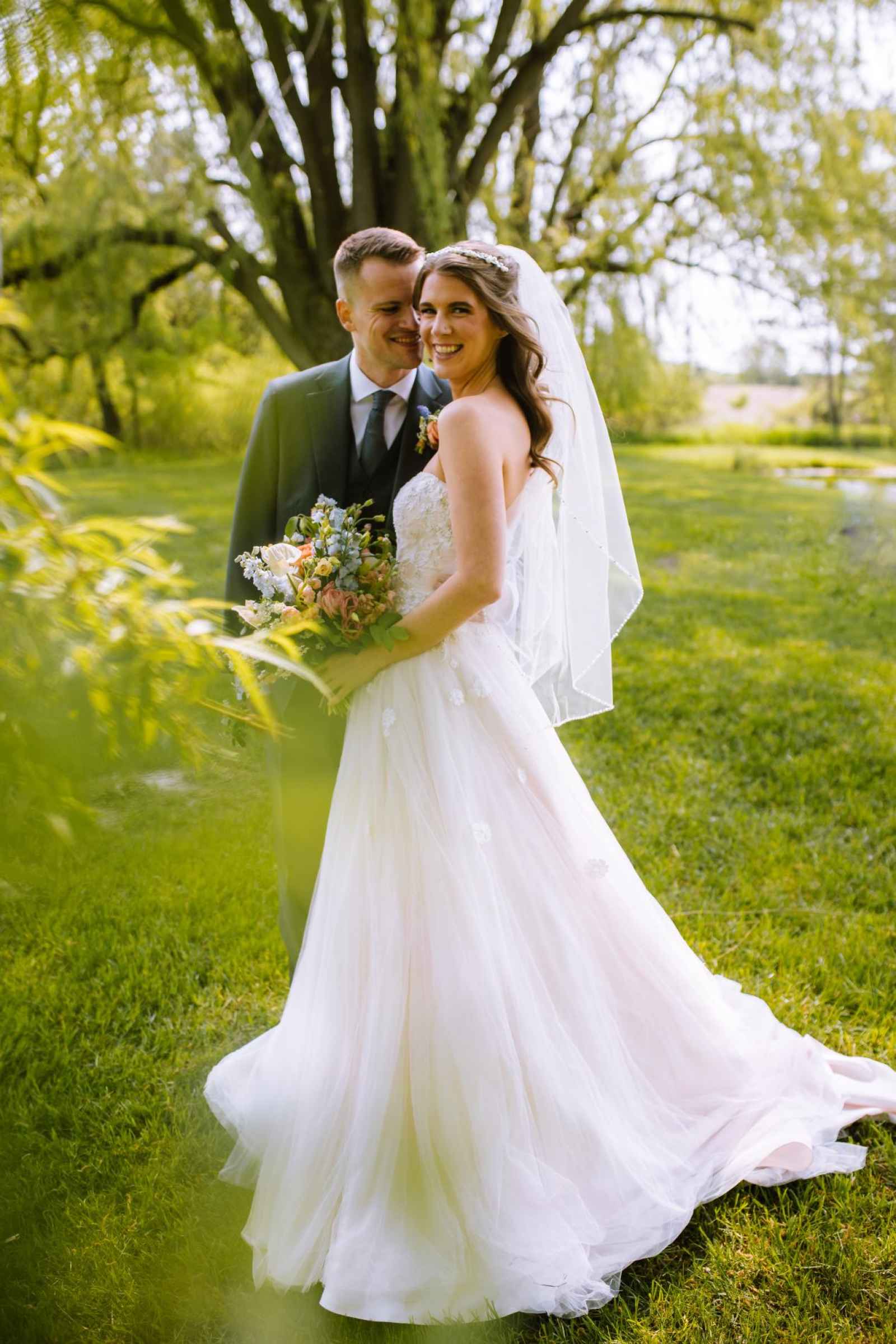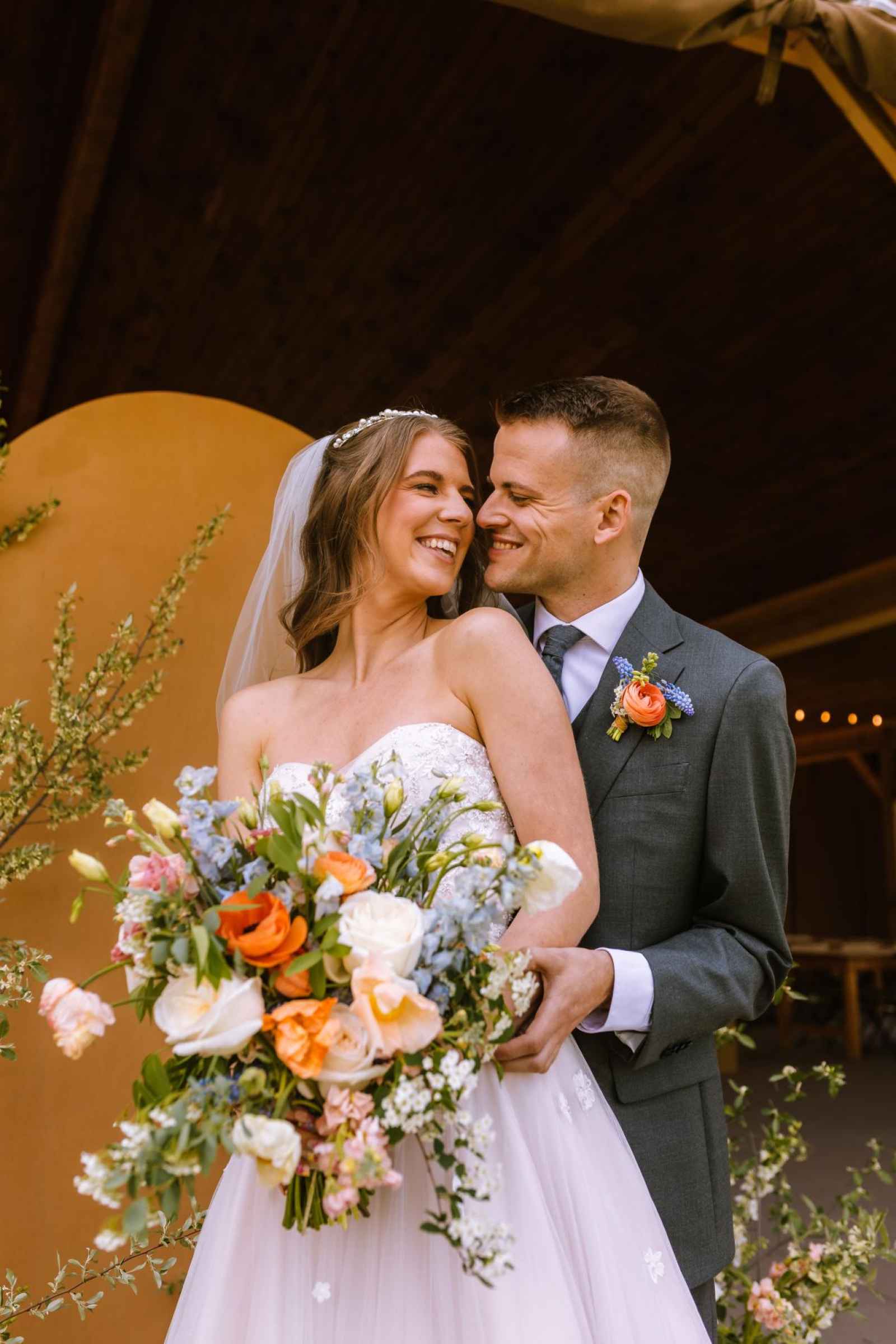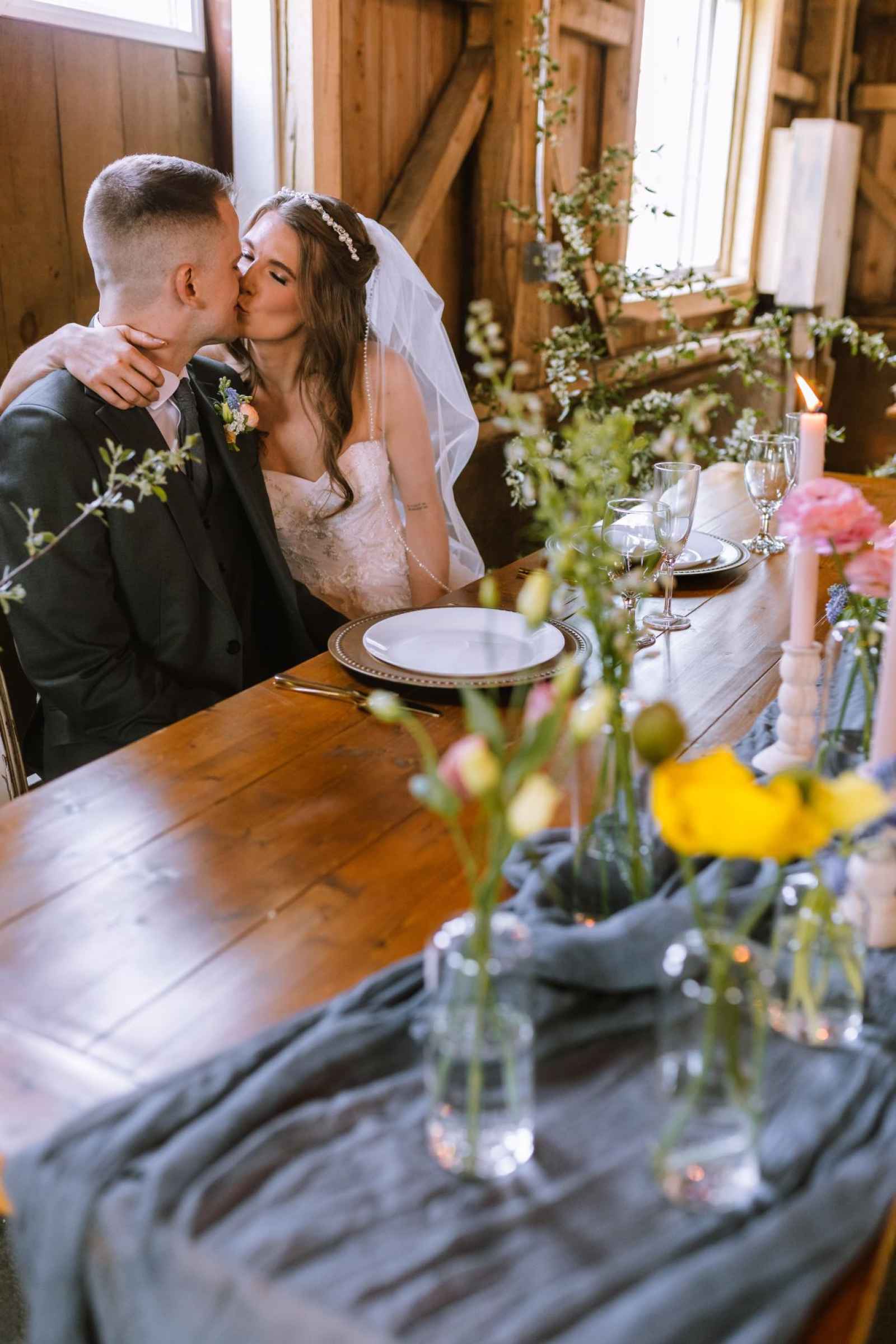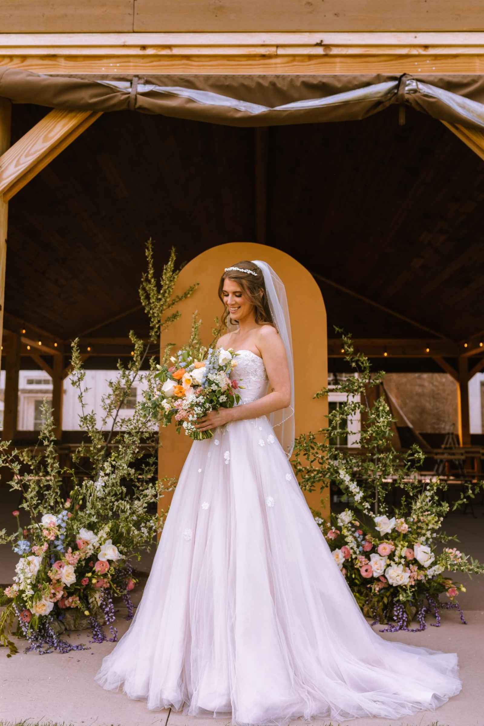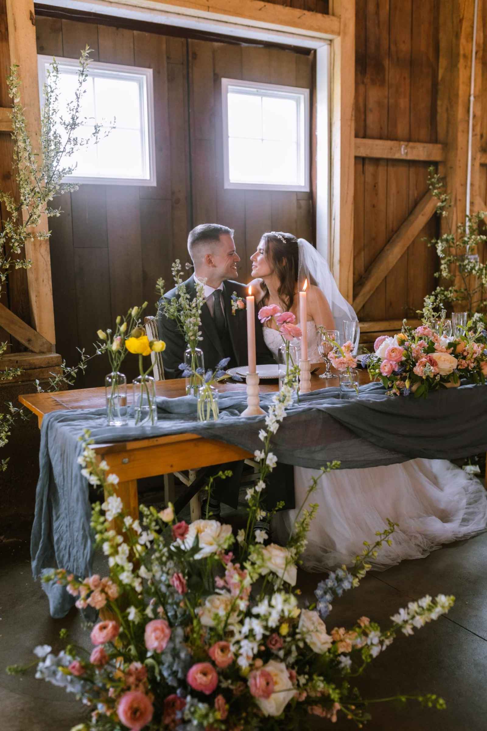 The model's dress from Becker's Bridal was an absolute showstopper! Its strapless design and flowing silhouette added a touch of enchantment to the look, while the cascading floral appliqués gave a nod to the garden theme. The talented team at The Pretty Committee worked their magic, styling our model's hair in a effortlessly chic half-up hairstyle, accented with loose, cascading curls that delicately framed her face. The look exuded a relaxed and romantic vibe, perfectly complementing the overall theme of the shoot. To accentuate her natural beauty, the makeup was kept refreshingly minimal, allowing her radiant features to shine through. A classic veil and delicate pearl headband finished off the look, adding a touch of subtle sparkle and sophistication! Our groom was looking dapper in his classic gray suit from 1701 Bespoke.