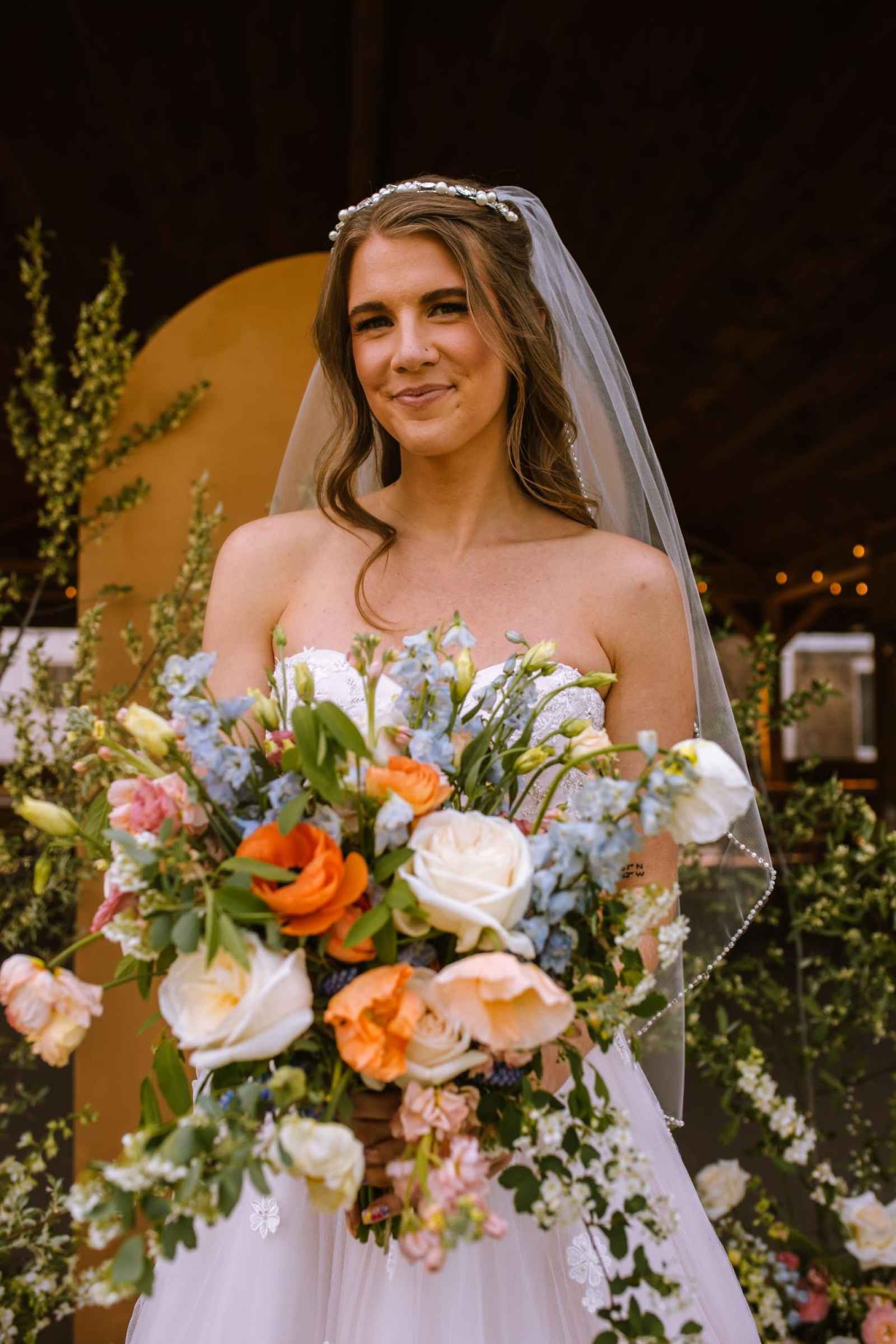 The garden-like floral designs in our cover shoot from Sparrow Bloom were a true marvel, evoking a sense of natural wonder and enchantment. Soft pastel hues of pink, orange and yellow adorned the arrangements, creating a delicate and dreamy ambiance. With a whimsical flair, the designs artfully mimicked wildflowers, adding a touch of untamed beauty to the scene. The floral arrangements beautifully reflected the garden theme, transporting us to a world of blossoming charm and serenity!