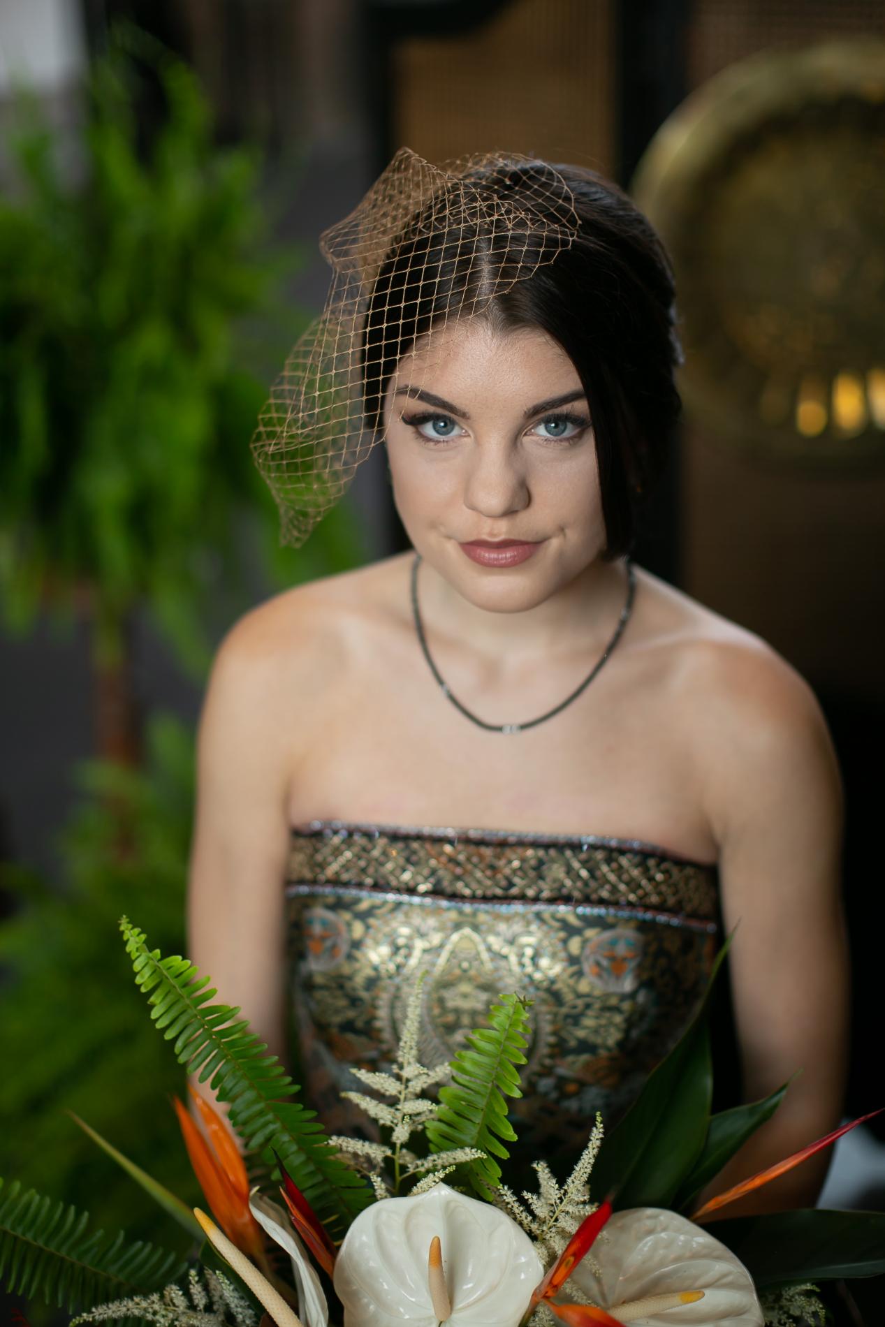 This golden fascinator is the perfect subtle yet elegant touch to this bride's dress.