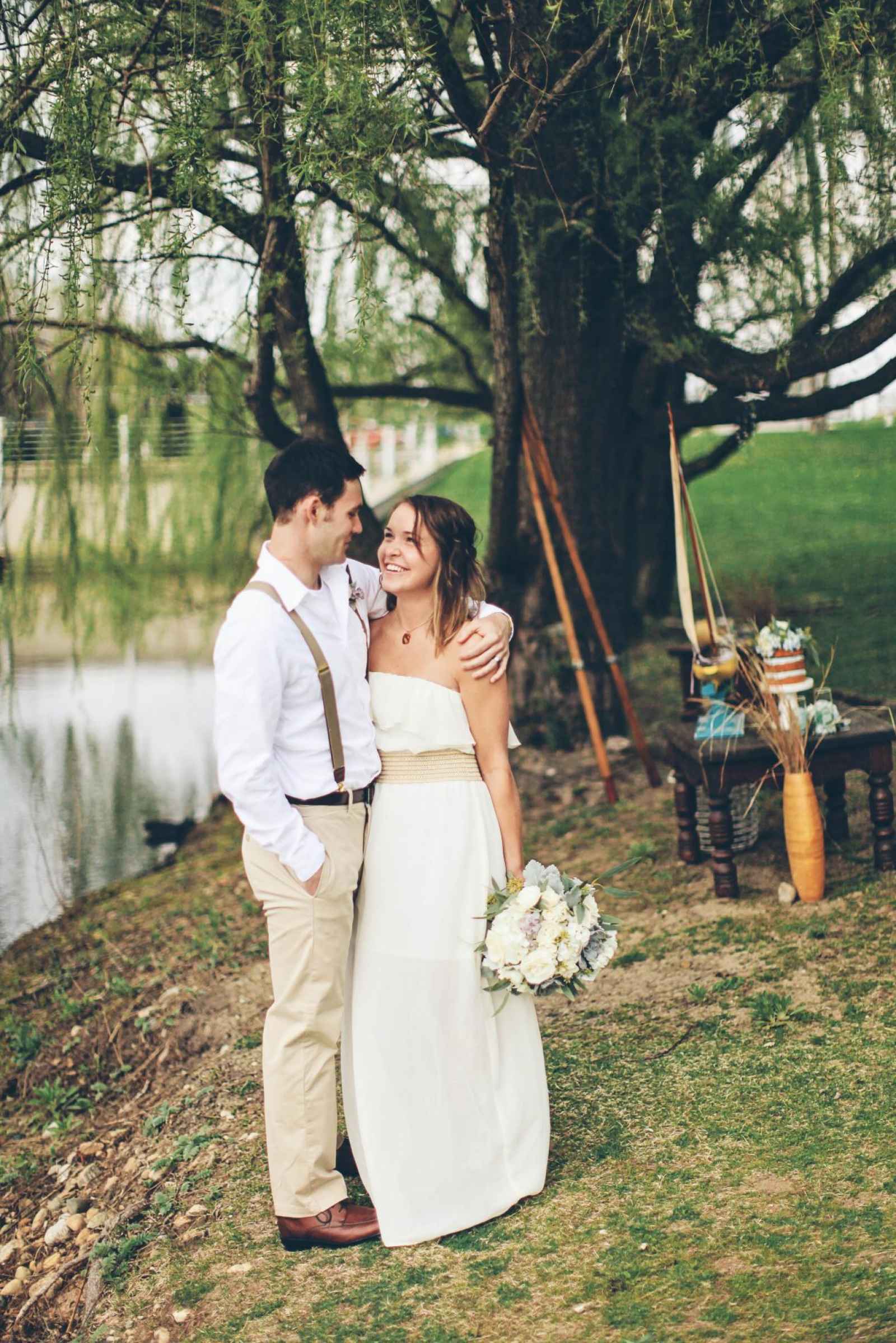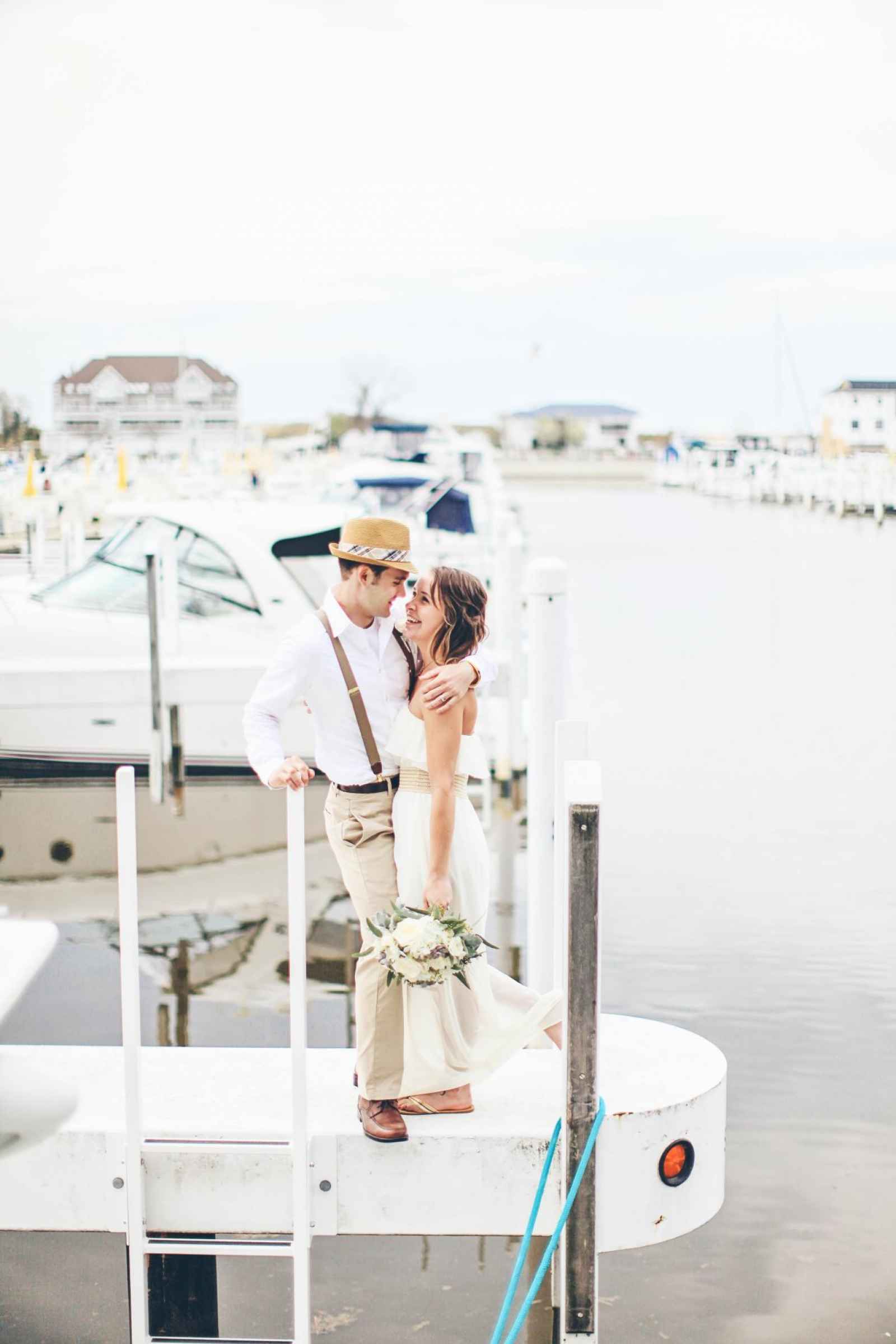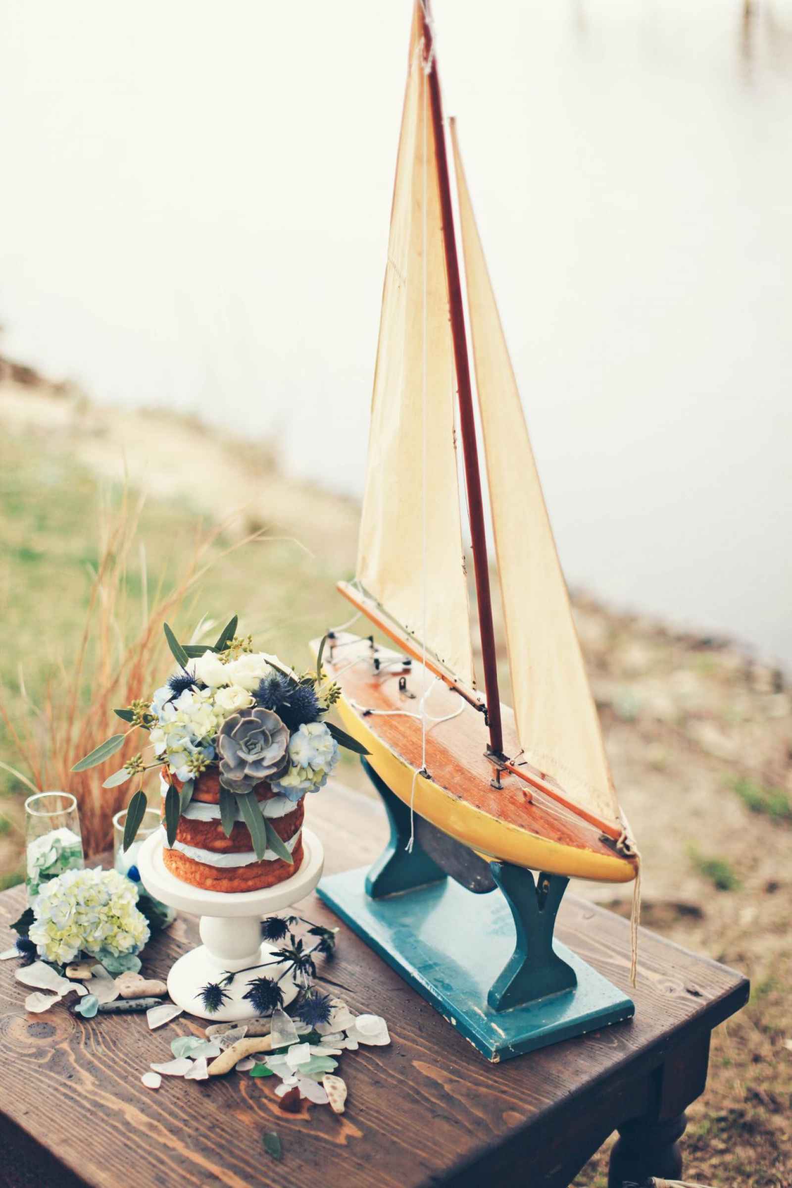 Jodi Bodtke of Giving Tree Photography was stirred by visions of an earthy, nautical wedding. The colors, flowers, décor and overall theme of this style shoot were inspired by a small town near the marina and by the beach glass that is commonly found buried in the Lake Michigan shoreline. She collaborated with Marco Alexzondra of Marco Alexzondra Floral and Event Services, and together with the addition of several other vendors, they designed a stylized wedding that made use of pale blue, green and brown tones, succulents, driftwood, beach glass and heart-shaped rocks. The marina at Harbor Grand in New Buffalo, Michigan provided a gorgeous backdrop with sailboats, a willow tree and Michigan blue waters.