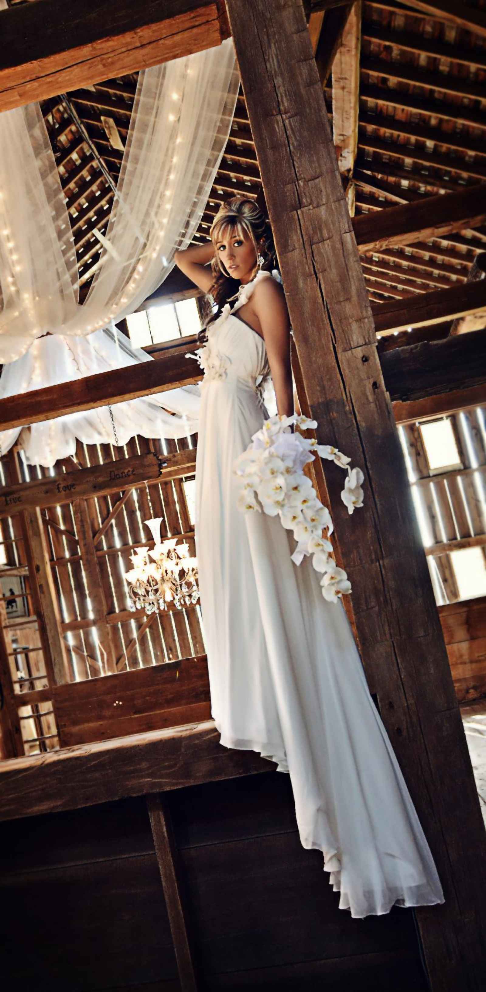 Hold flowers at your stomach with a little bit of bend in your arms; this slims your arms. Just make sure the flowers aren’t so high that parts of your dress or face are covered.