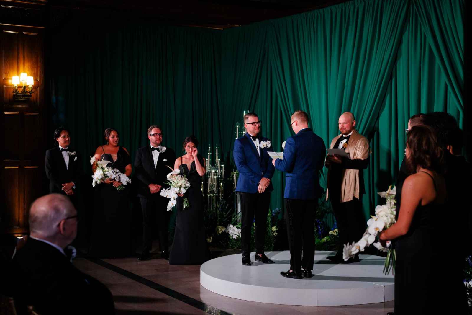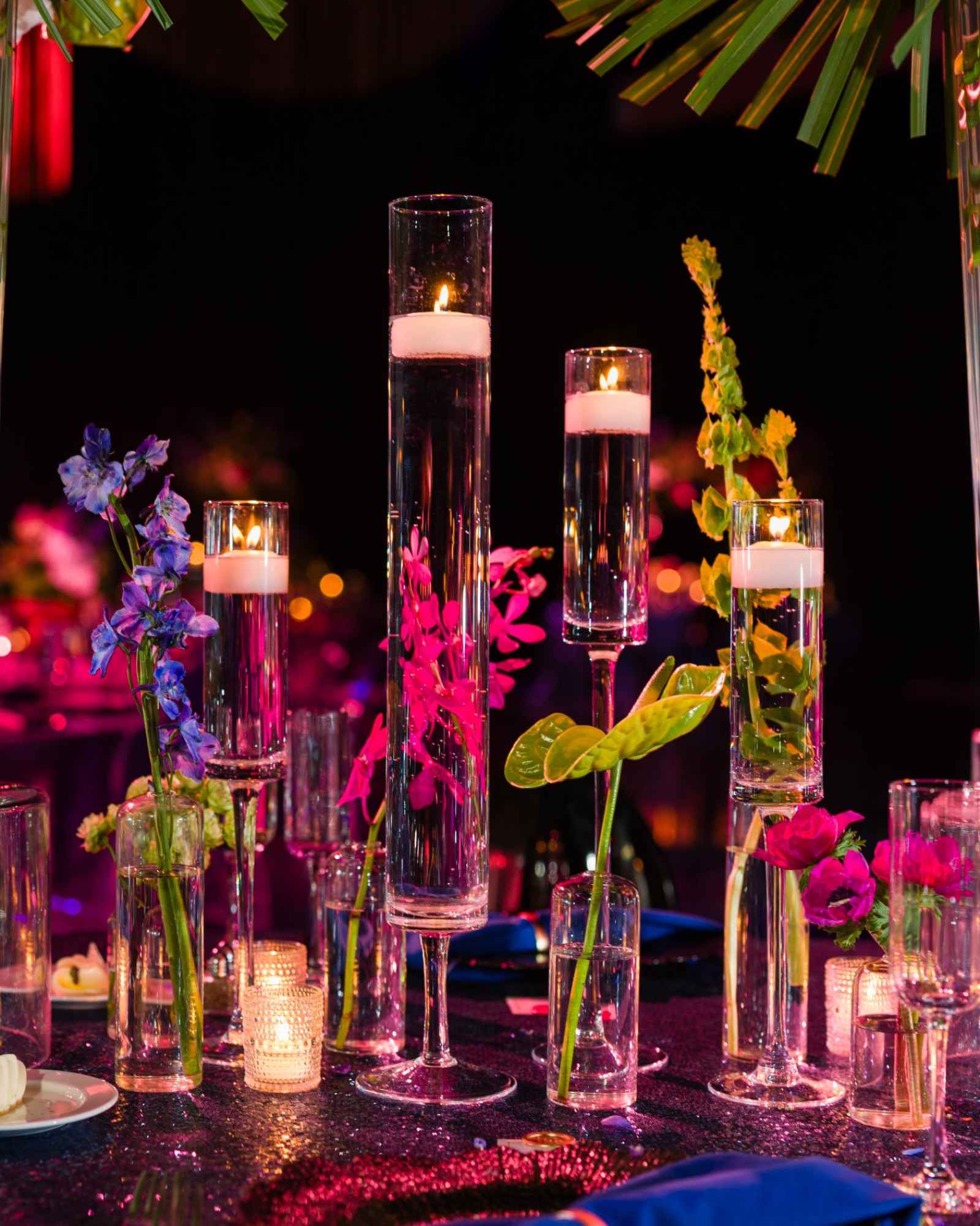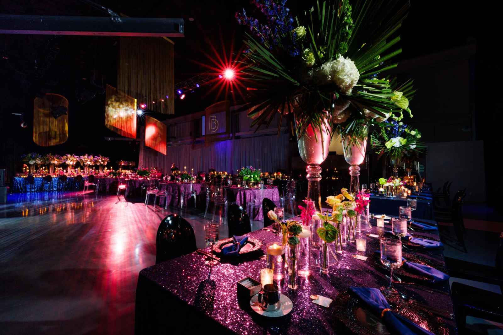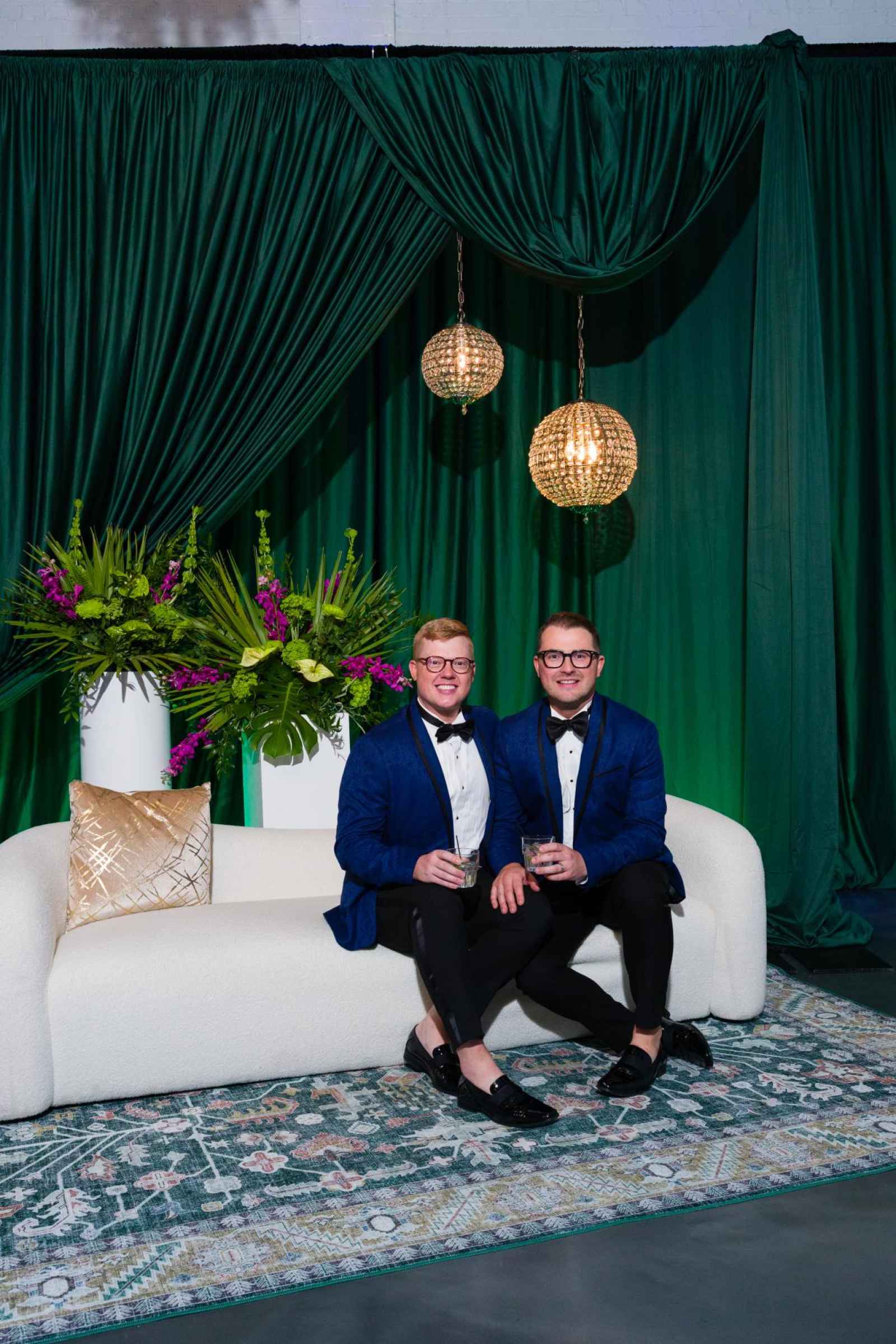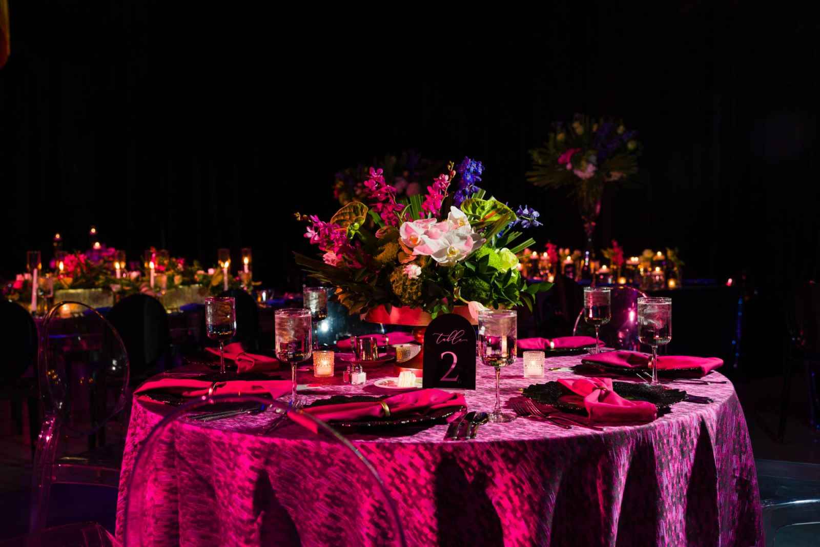 Just like their personalities, Blake and Drew wanted to honor traditional and classic themes while putting their own modern twist on it. There were two things they absolutely wanted for their wedding. One was to bring together everyone they love to celebrate their union. The second was to have a seamless transition from their elegant ceremony to the all-out party that they wanted afterward. “Bold fuchsias, bright greens and electric blues showed up throughout the florals and table linens, creating a lush, high-energy palette. We brought in clear and black ghost chairs and sleek acrylic tables to give the space a modern edge, and added soft seating with large palm trees and uplighting to evoke a playful, intimate vibe,” Blake and Drew share. Burns Special Events was one of the rental companies that helped them pull it all together!