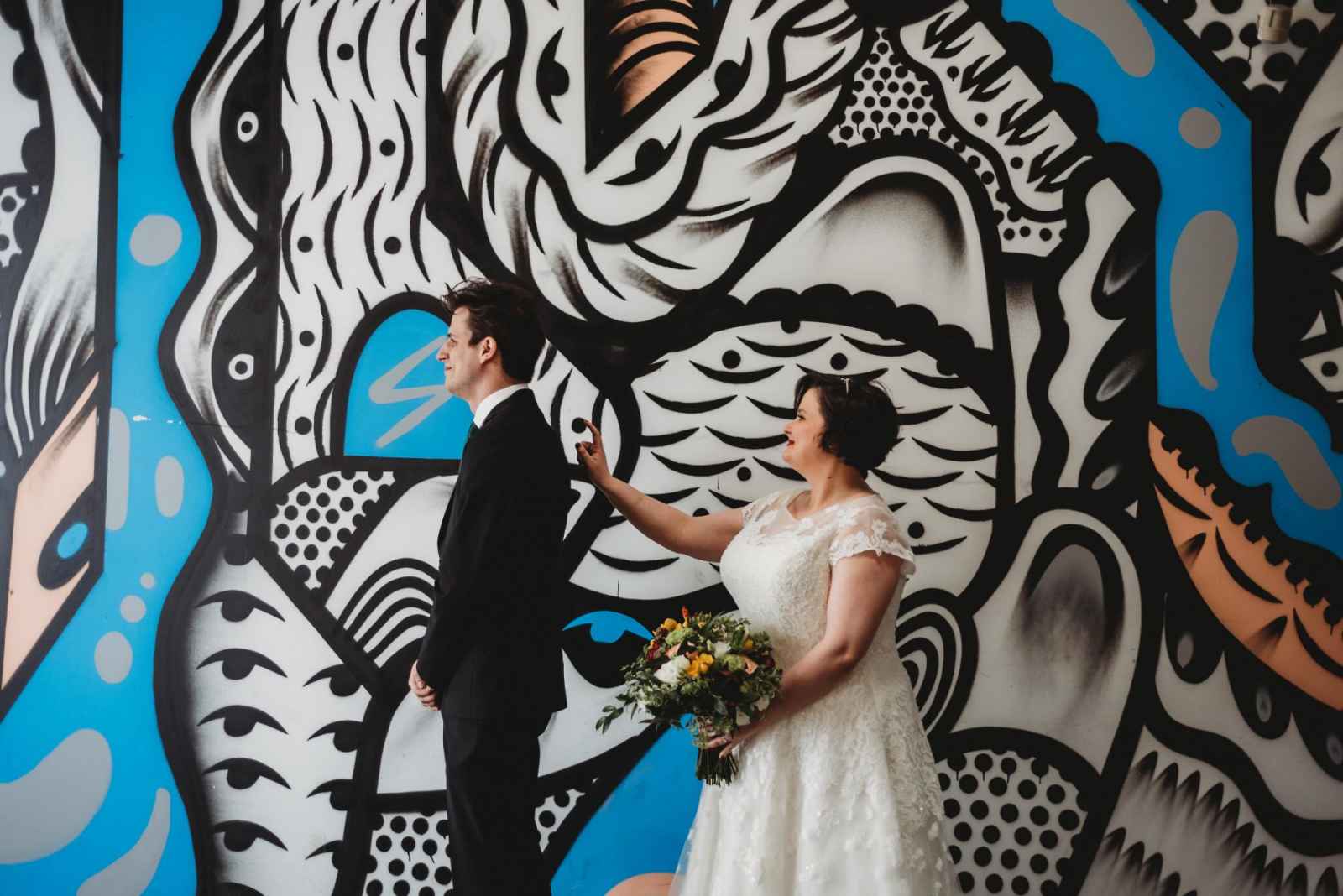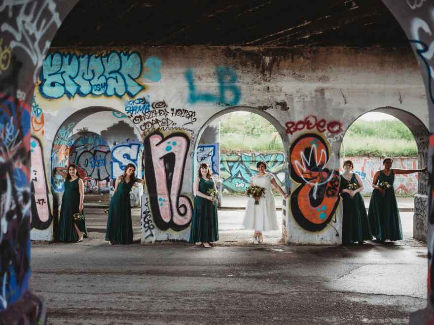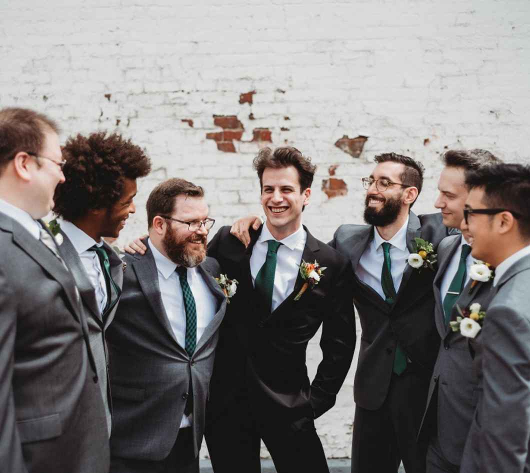 Given their industrial venue and offbeat color scheme, the couple also wanted wedding attire that would reflect their personalities. David notes, “We kept it simple. We found our suits at Men’s Wearhouse, but we wanted to encourage everyone to wear things that were their own style. So, everyone wore unique ties and socks.” Letting all the groomsmen choose their accessories meant that they weren’t forced to fit a theme. Instead, everyone was invited to wear what they like. It was a great way to ensure that everyone felt great.