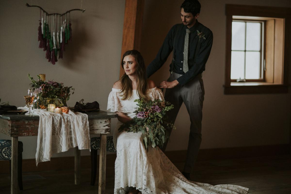 Meaghan says, “This idea was a hybrid of us and One Oak Bride. We were both establishing our brands at the time and wanted to show that our styles aren’t exactly ‘traditional’ or super girly. We brought our friends at Allen Kent Photography on board because their photos are stunning, but they also capture the heart of whoever they’re photographing, which makes these shoots so warm and fun—an important factor for us.”