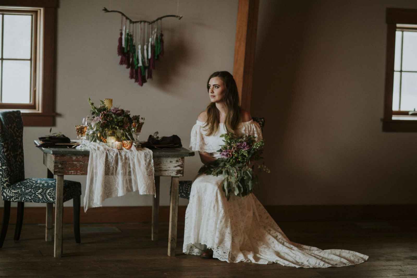 Meaghan says, “We kept the charm of a historic barn, but complemented it with vintage, feminine details...The look and feel is simplistic, cozy and vintage. We focused on details that bring in the feeling of sitting in a cozy lounge or your hip, boho friend’s living room, using details such as hardcover books as pieces of décor and funky dining chairs at the intimate, sweetheart table.