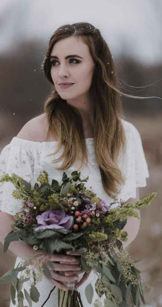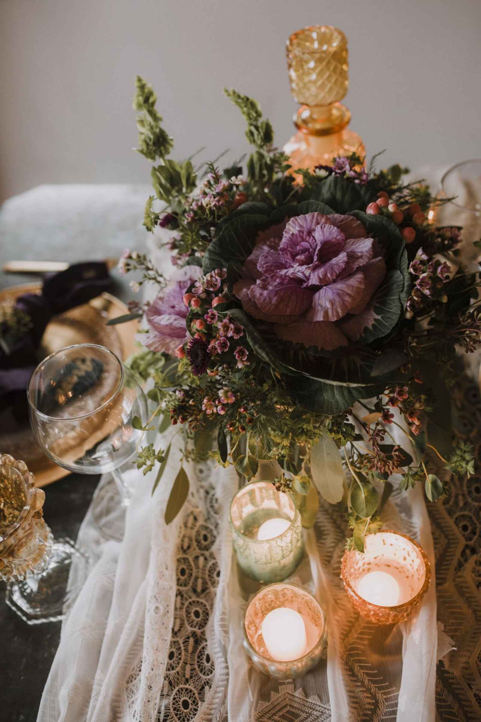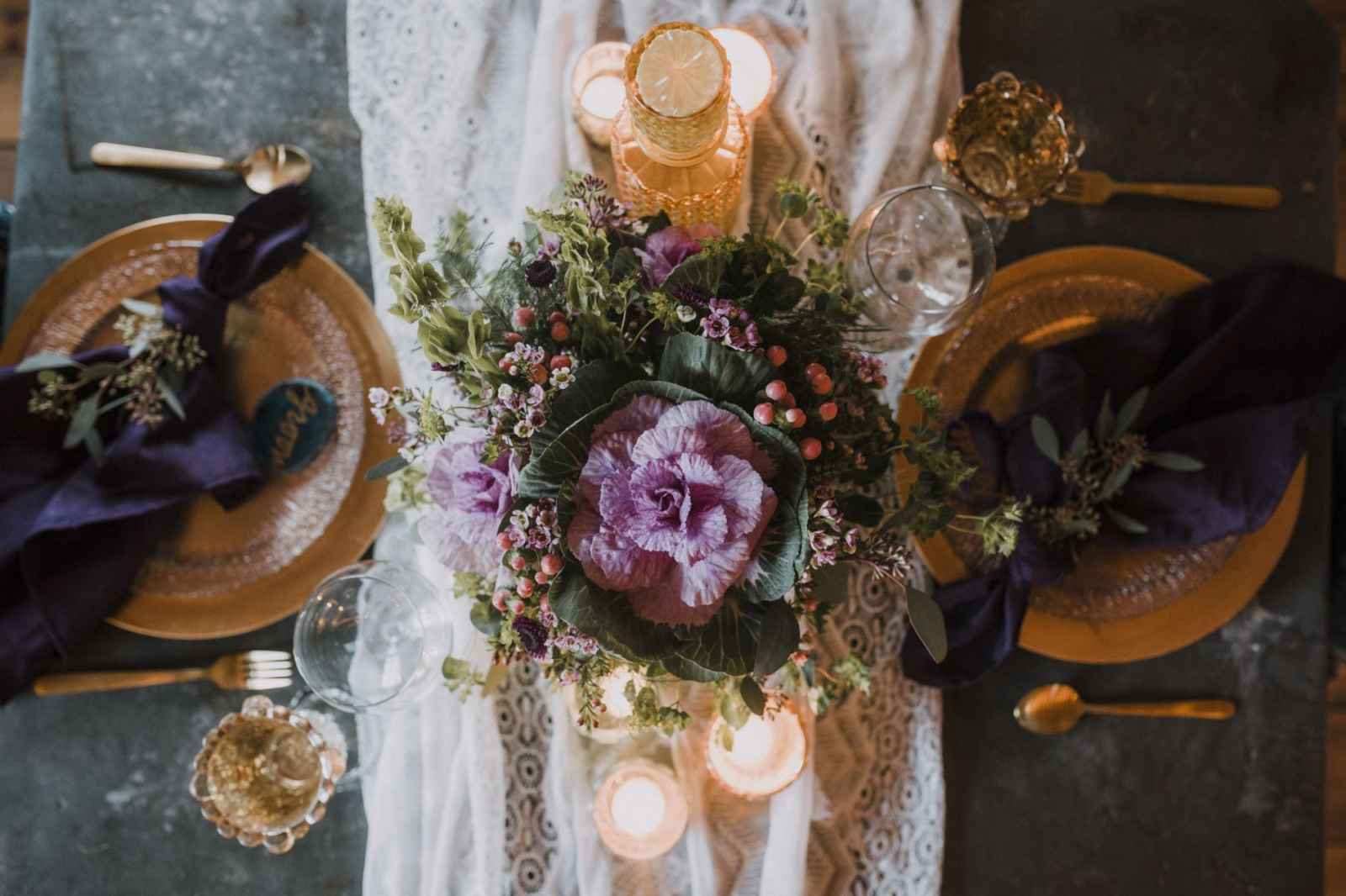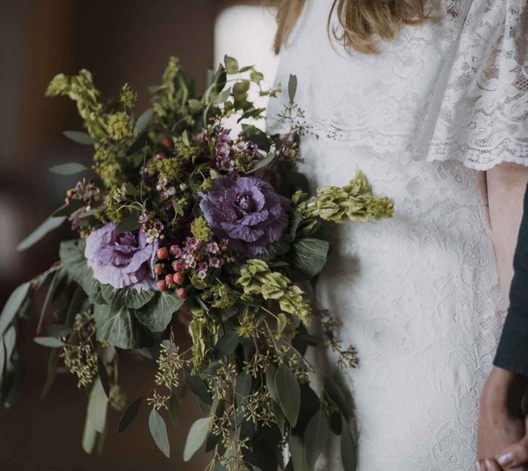 Meaghan says. “We used a lot of wildflowers and greenery with giant, purple kale as our showstopper. The ladies at 307 Events are great at working with each couple’s personal style, and because it was winter, we wanted to be a little more realistic about what would be readily available (peonies were out). We stuck with kale, Lisianthus, spray roses, wax flower, baby's breath, and a lot of eucalyptus. We also handmade the garland, which was mainly created out of foraged winter greens.”