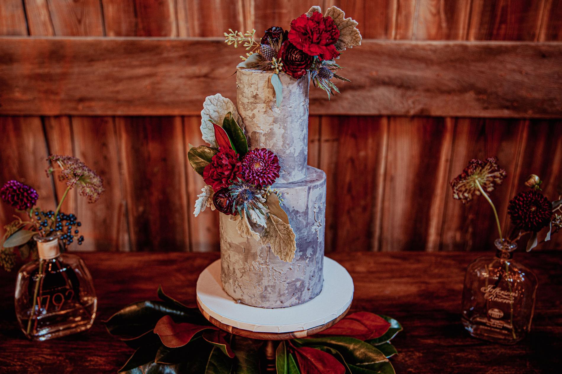 We know that some couples don't want a classic white wedding. If you are a little edgier, this stone-inspired cake from Violet Flour Bakes, LLC is for you! We love the dark floral details on this treat to show that a pop of color can go a long way!