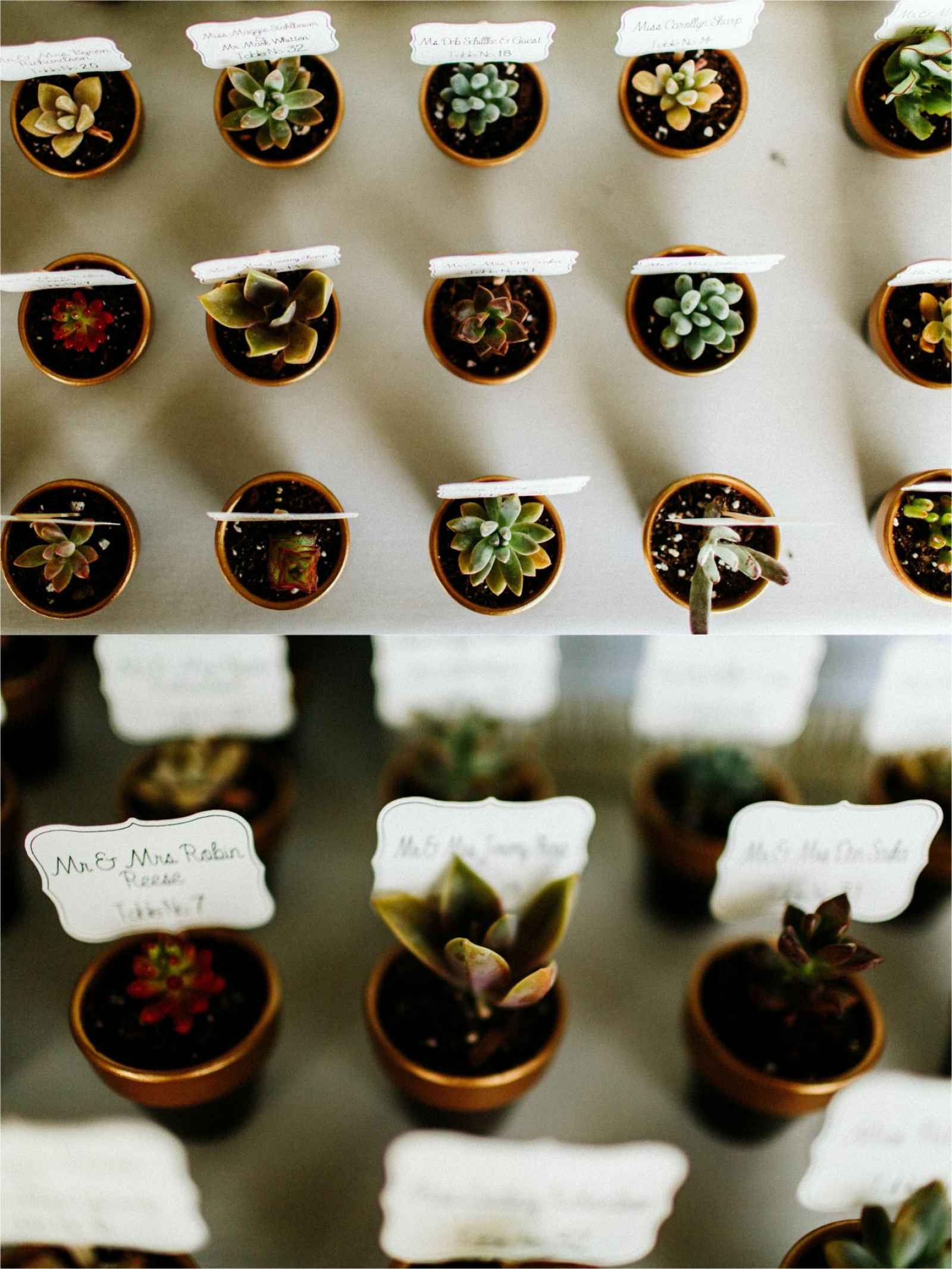 The guest favors were a labor of love between Alexis and her mom. Alexis planted all of the succulents and her mom painted all of the pots and handcrafted the name cards. Other D.I.Y. projects included the silverware placeholders and the chocolate boxes. Alexis' mom hand-stamped 350 monogrammed wax seals on the chocolate boxes.