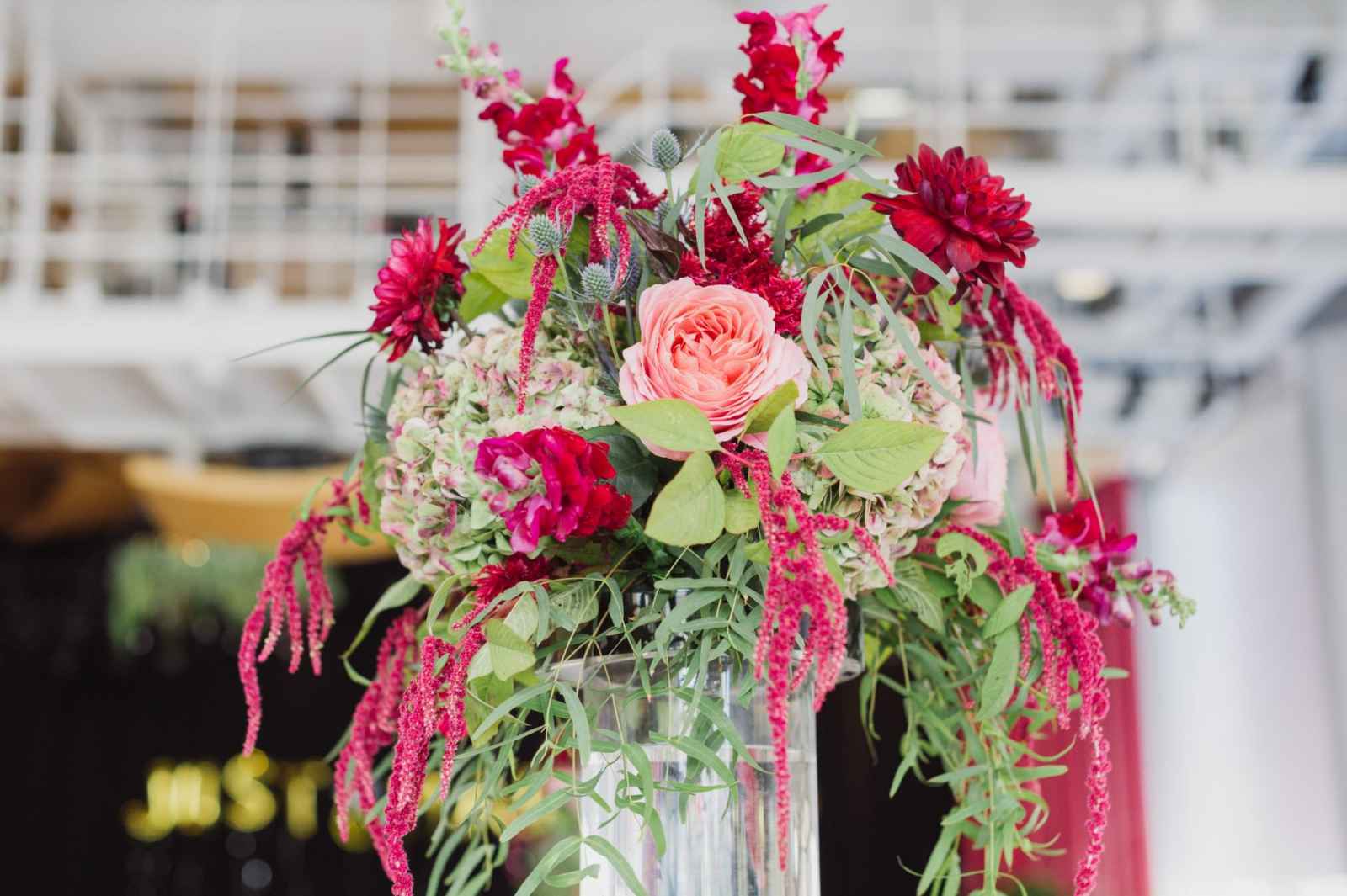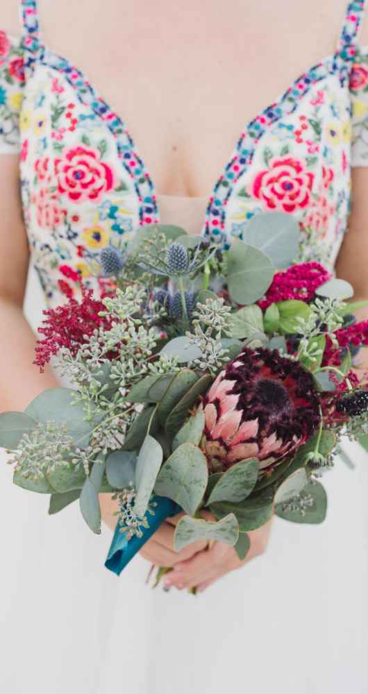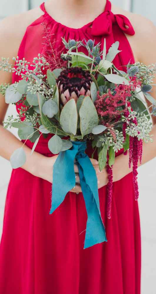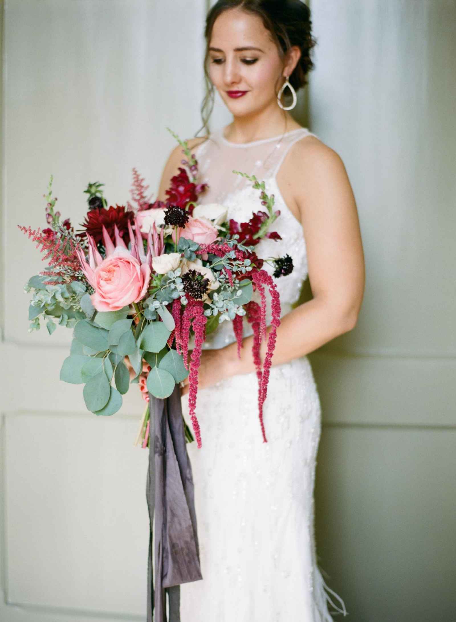 Besides Carlson’s personal style, other influences served as major inspiration for the overall look and feel of the wedding, including her vendors. “We knew they were creative and could execute the vision we had,” Carlson says. However, it was a Maggie Austen watercolor cake featured in the New York Times that inspired her palette. The cake design featured a romantic mix of navy and cranberry–the very colors she desired. Together, with the wedding’s eccentric design and sparkly metallic details, the bold colors certainly brought life to the space. Pomp&Bloom designed the fresh floral elements, incorporating gorgeous King Proteas, vintage garden roses, anemone, eucalyptus leaves and a moss wall!