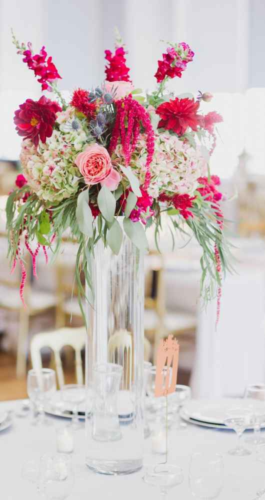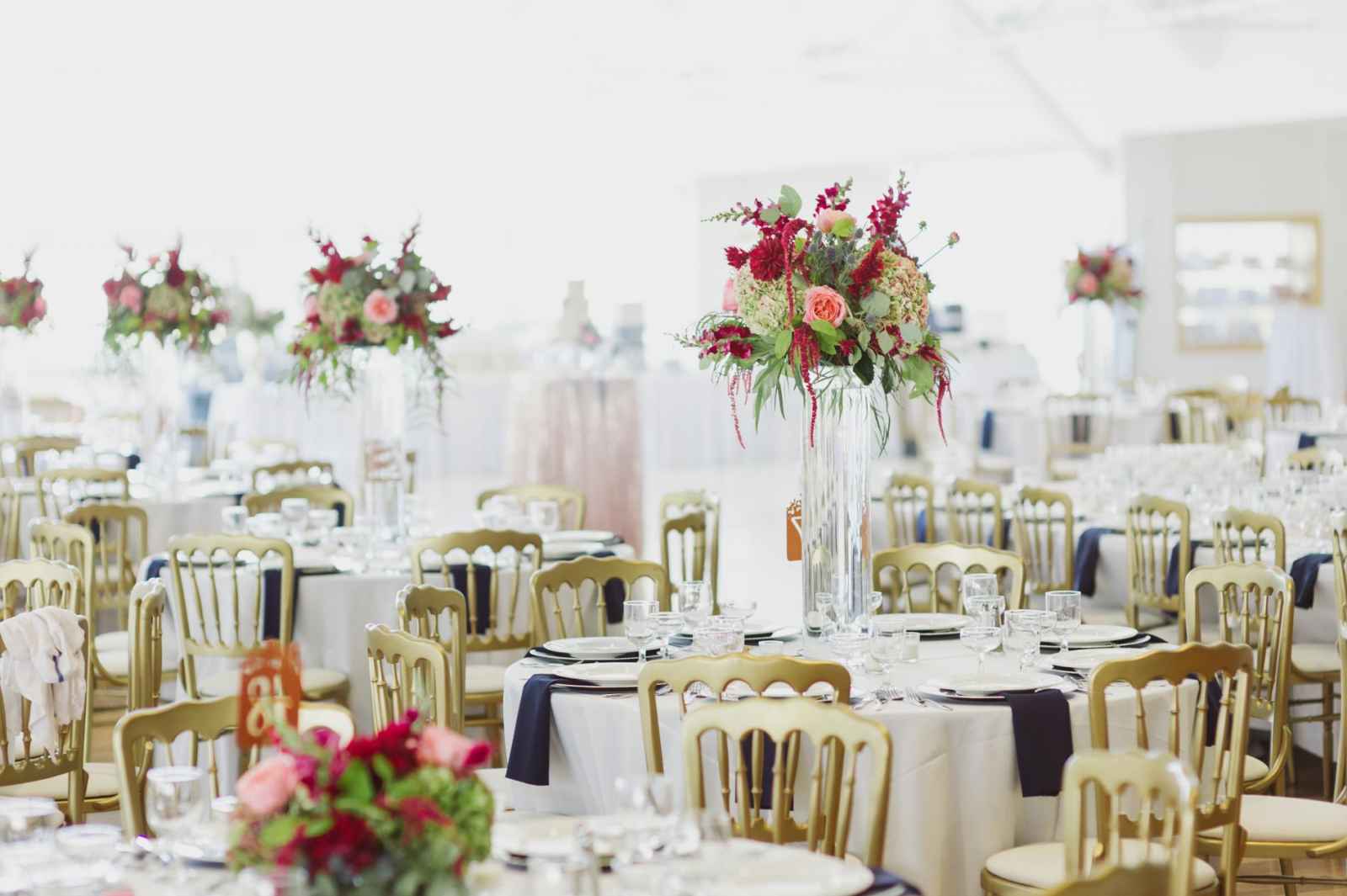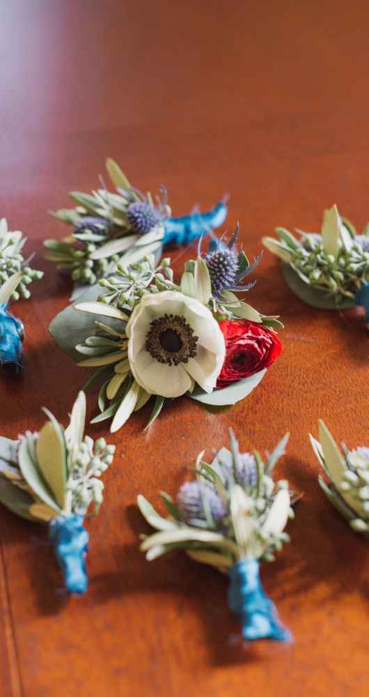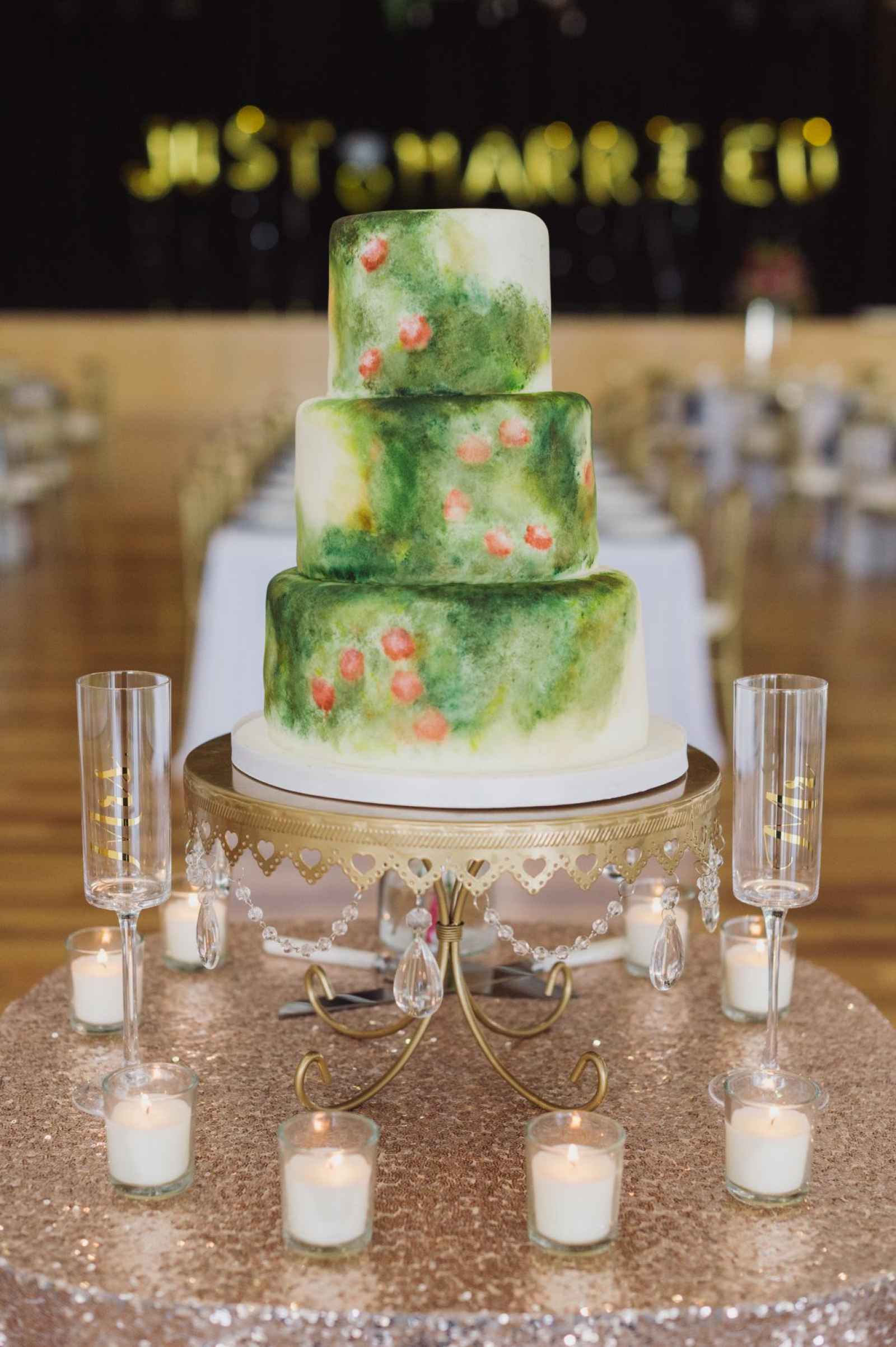 Besides Carlson’s personal style, other influences served as major inspiration for the overall look and feel of the wedding, including her vendors. “We knew they were creative and could execute the vision we had,” Carlson says. However, it was a Maggie Austen watercolor cake featured in the New York Times that inspired her palette. The cake design featured a romantic mix of navy and cranberry–the very colors she desired. Together, with the wedding’s eccentric design and sparkly metallic details, the bold colors certainly brought life to the space. Pomp&Bloom designed the fresh floral elements, incorporating gorgeous King Proteas, vintage garden roses, anemone, eucalyptus leaves and a moss wall!