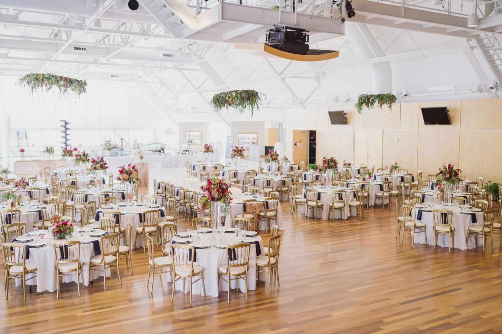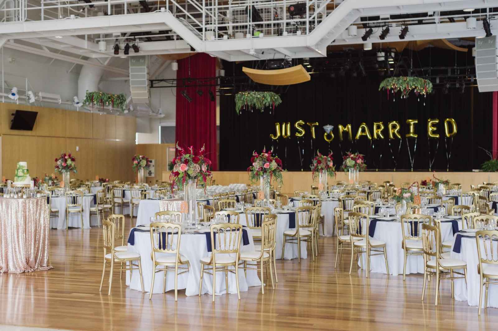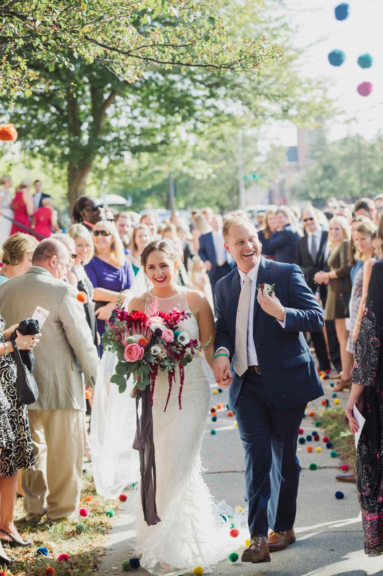 Carlson and her mom set their sights on selecting just the right details needed to dress up the venue’s large, clean space. “Growing up as a Zeller we consider animal print, fur and metallic as basics!” Carlson says. “My vision slightly changed after getting my dress, but I knew we needed metallic gold, silver and bold flowers to make our big day feel different.” Sequin tablecloths, fur pillows, mercury glass and Ellis Events gold chairs provided the colorful and individualized statement she envisioned. Her mom, in fact, really stepped in when it came to planning, ensuring every detail was covered (including wearing her grandparent’s fraternity and sorority pins). Brad’s mom invested many creative hours as well, crafting the colorful, handmade pom poms thrown by guests.