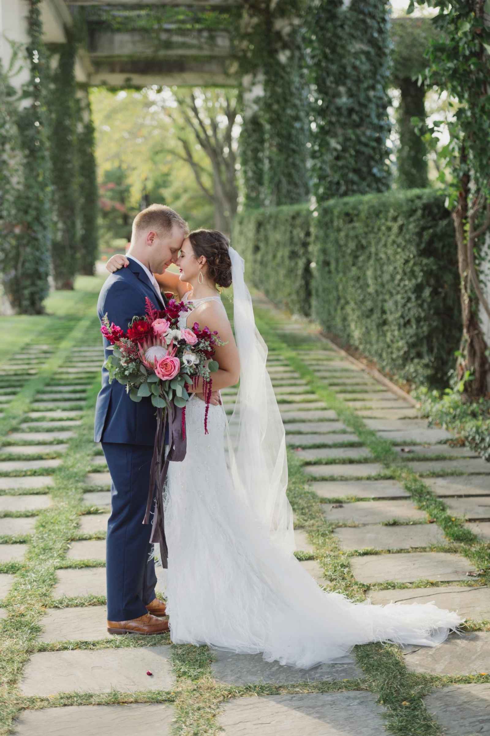After nearly two years as a couple, Brad knew it was time to ask Carlson to marry him, but the next decision was: Where do you find a unique ring for a one-of-a-kind girl? Grandview Mercantile, a fine antiques marketplace in Columbus, Ohio, had the perfect vintage 1940’s ring. Brad is a corporate planner so, when the special day finally arrived, he was able to convince Carlson to attend an event planning convention with him. Within walking distance of the “convention,” he led Carlson to their favorite park and popped the question in the middle of the pouring down rain! “I do not remember how he asked it,” she recalls, “but it was such a good feeling! I immediately said yes and his friends from work captured the moment. We then went to brunch, where our family surprised me to celebrate! It was perfect!”