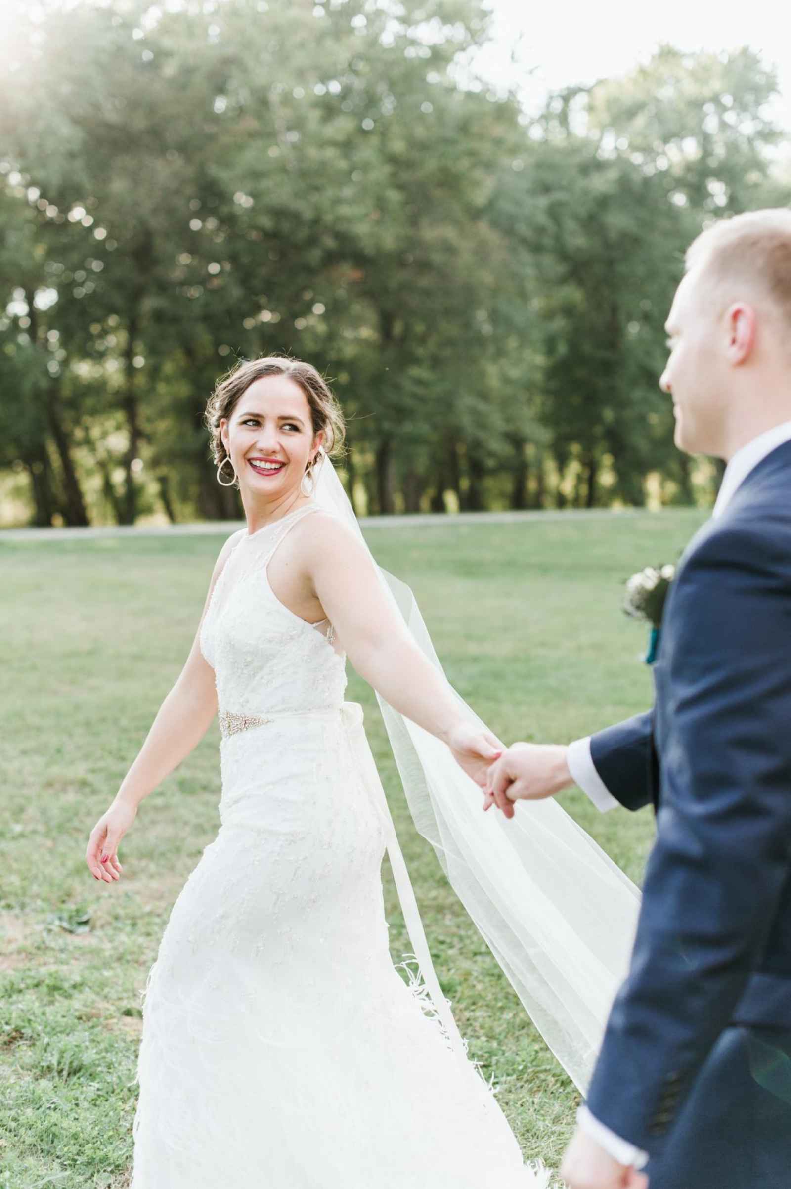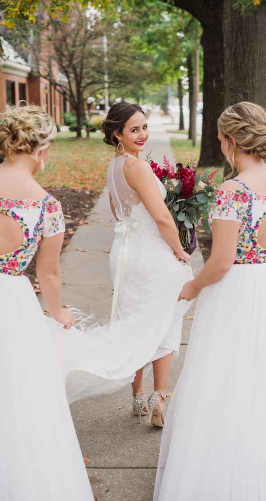 “BHLDN was our one and only shop we considered buying a dress from because we knew that it was 100% my style,” Carlson says. “Our stylist, Madison, was one we will never forget. She was so passionate about finding a dress that fit my style, ensuring my future husband was sure to be ‘wowed’ when I walked down the aisle.” The stylist came through with an intricate Rosa Clara dress, detailed with feathers and beautiful embellishments. “We fell in LOVE and bought it that day!” she says. The bridesmaids’ dresses, also beautifully unique, were purchased from B.loved in Seymour, Indiana.