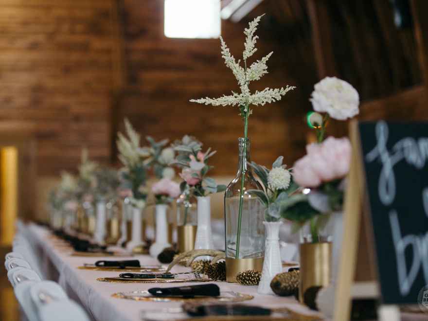 Sarah describes herself as "lady-like and romantic" when it comes to her personal style, while she says Justin is an outdoors type. It was important to her to represent both of their styles in their wedding day in a Kate Spade-meets-the-outdoors way. With both of their styles in mind, the couple chose to go for a romantic twist on a rustic outdoor theme using traditional black and white colors but also throwing in blush and gold accents. Sarah incorporated antlers and wood accents, and even bought Justin a wedding ring with an antler inlay!