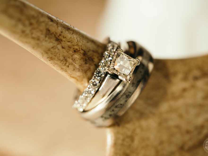 Sarah describes herself as "lady-like and romantic" when it comes to her personal style, while she says Justin is an outdoors type. It was important to her to represent both of their styles in their wedding day in a Kate Spade-meets-the-outdoors way. With both of their styles in mind, the couple chose to go for a romantic twist on a rustic outdoor theme using traditional black and white colors but also throwing in blush and gold accents. Sarah incorporated antlers and wood accents, and even bought Justin a wedding ring with an antler inlay!